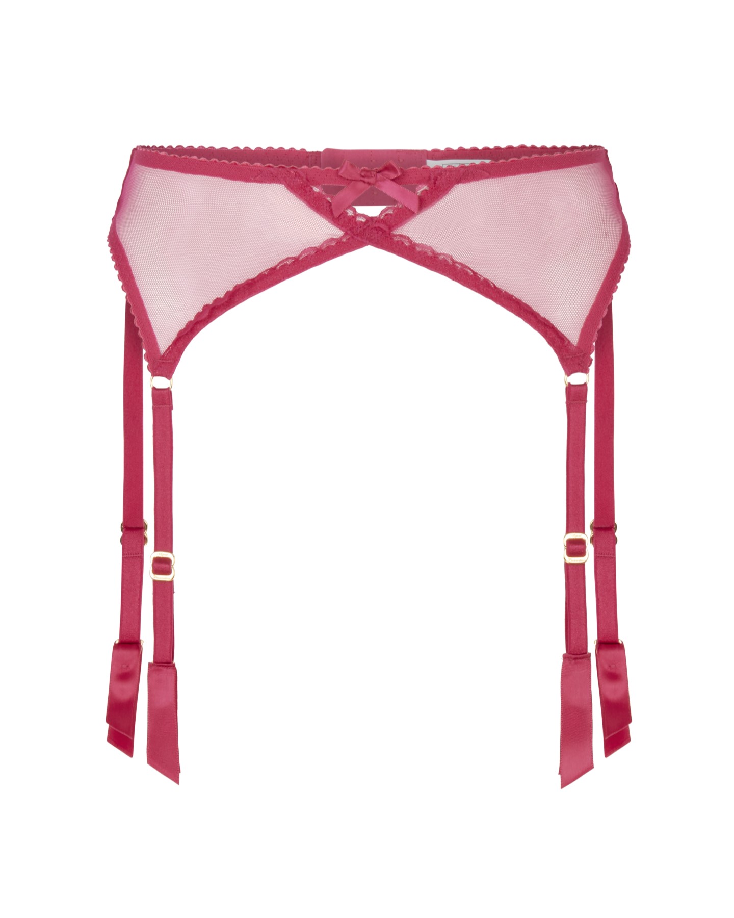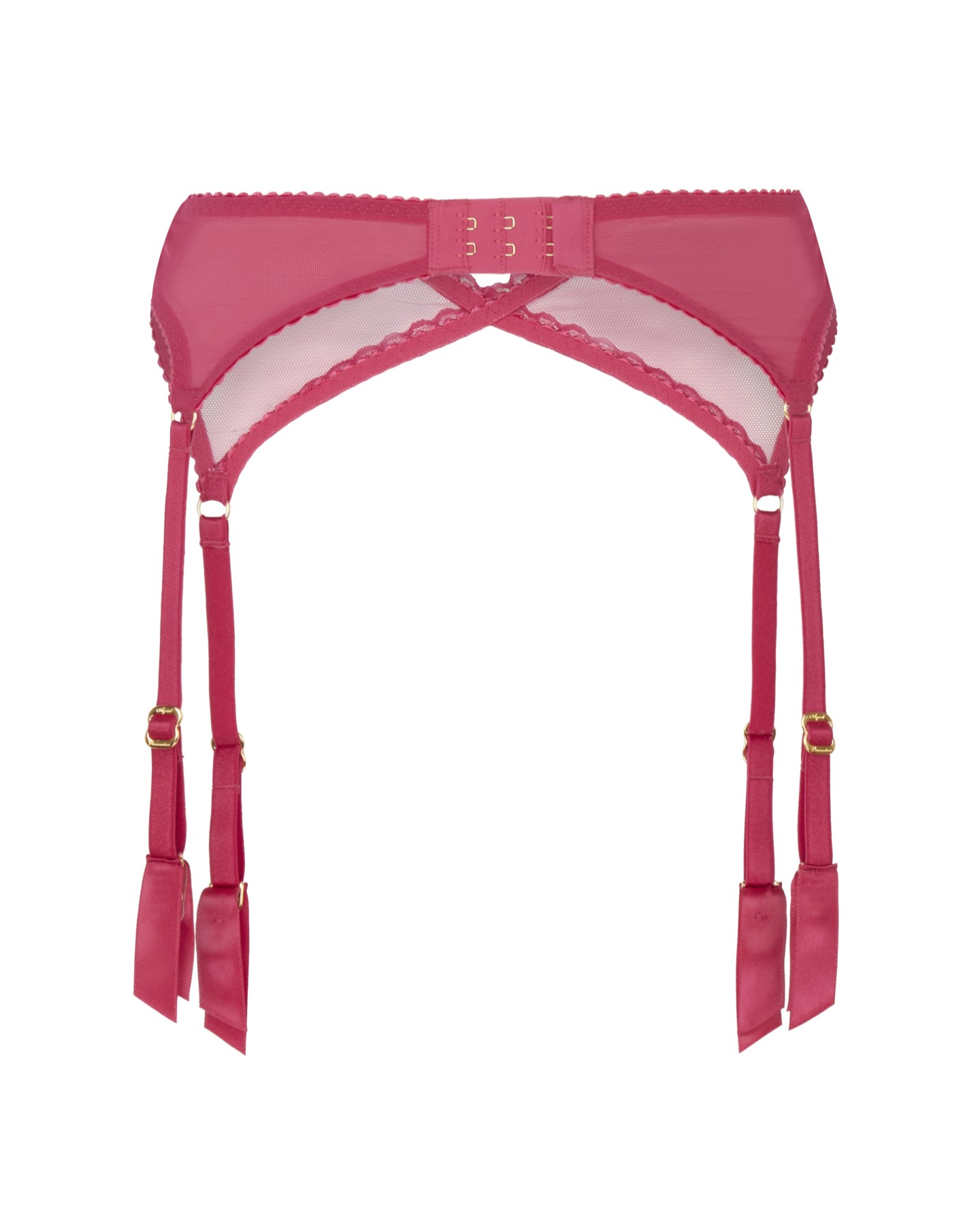 Розовый пояс для чулок Fia выполнен из полупрозрачной сетки. Центр украшен резной деталью, которая является отличительной особенностью лаконичной коллекции. Срезы обрамлены эластичными лентами с фестончатыми краями.