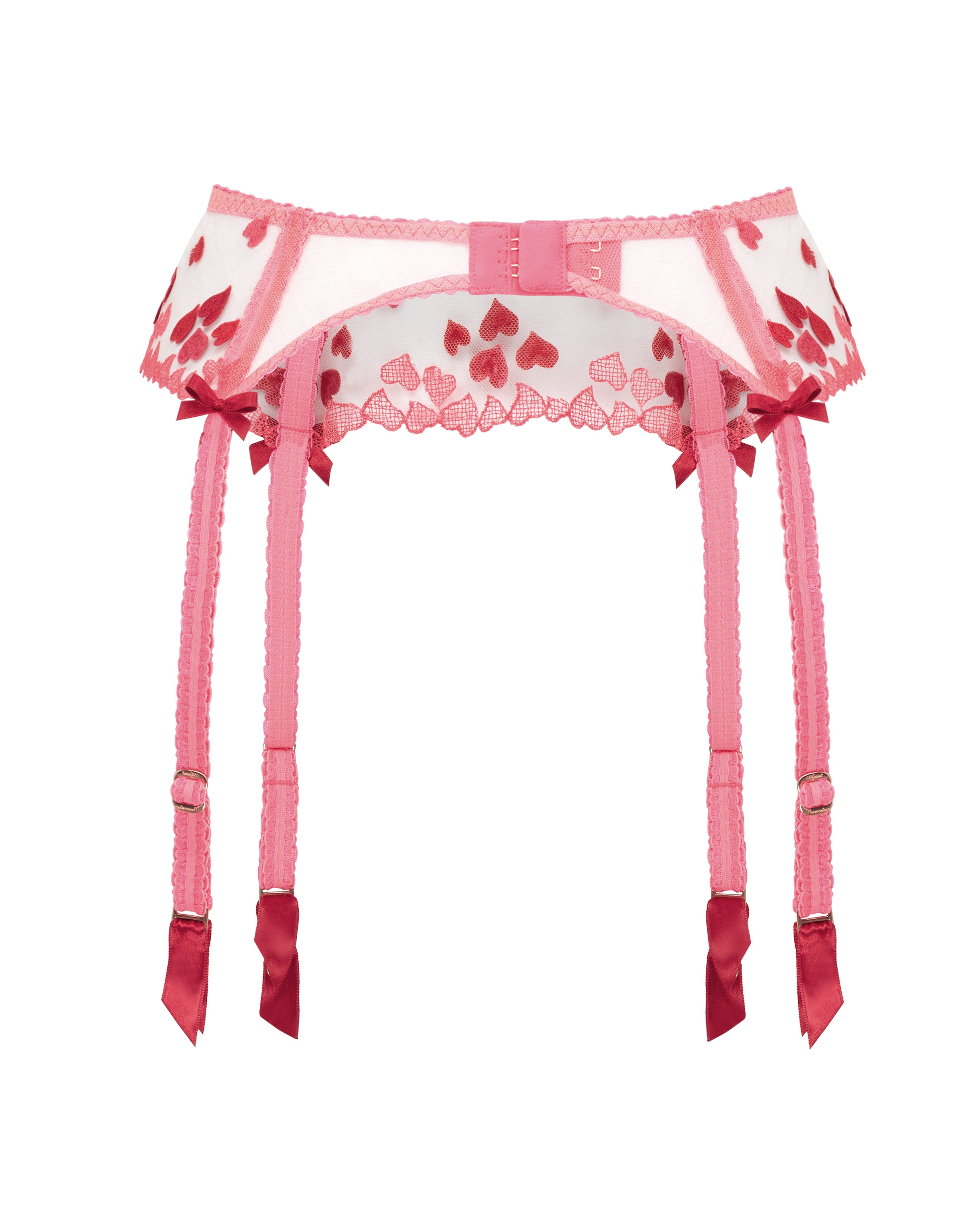 Любовь витает в воздухе - почувствуйте ее в новой коллекции Cupid, перед которой невозможно устоять. Cupid станет отличным подарком для любимой или прекрасным поводом побаловать себя. Отдайте свое сердце соблазнительному поясу из прозрачного тюля, украшенному яркой россыпью вышитых красных и розовых сердечек. Эластичная неоново-розовая петельная оторочка по краю, бантик на талии, застежка сзади и розовые пажи с красными ленточками завершают кокетливый образ. Пояс для чулок станет прекрасным завершающим штрихом для комплекта нижнего белья Cupid.