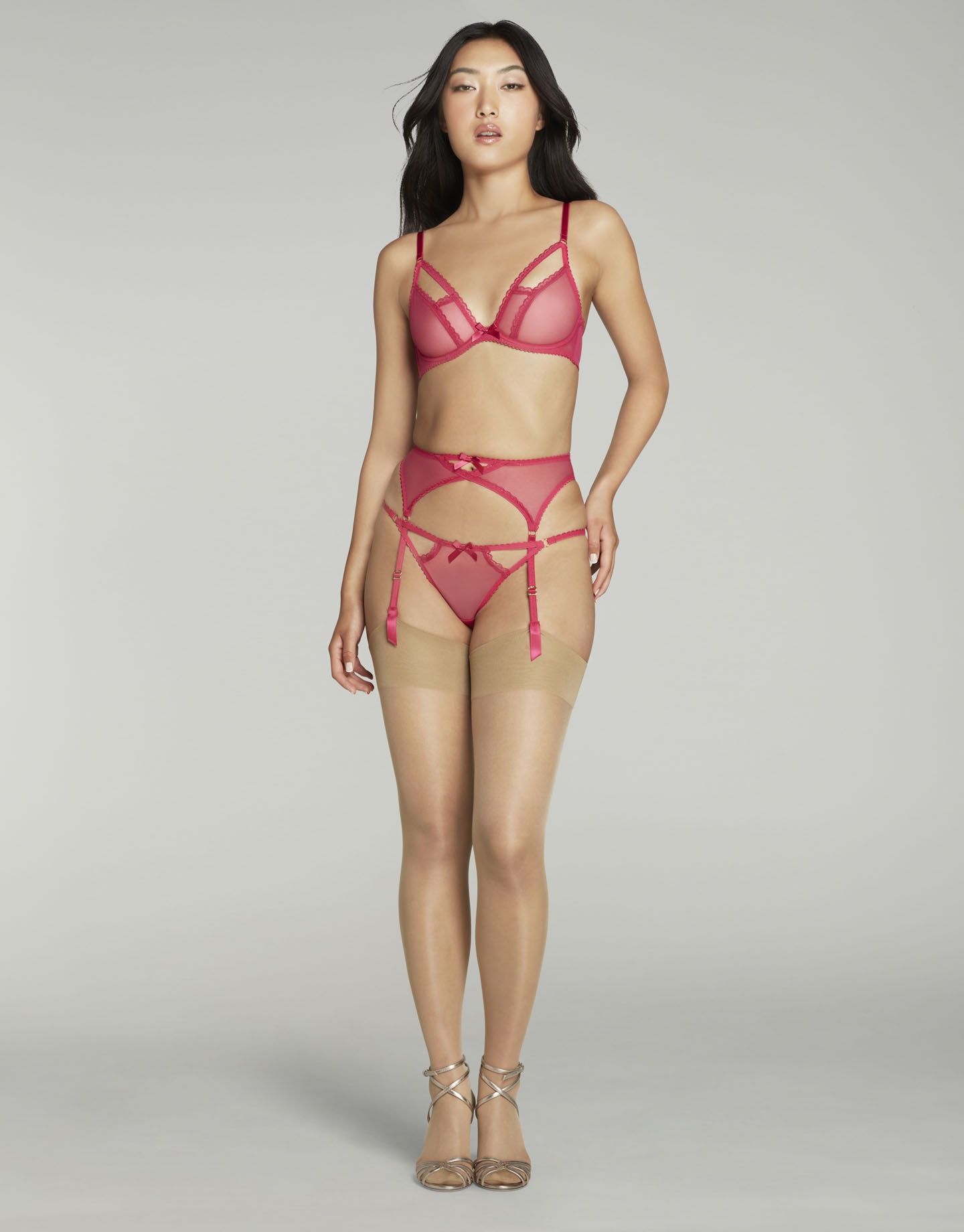 Розовый пояс для чулок Fia выполнен из полупрозрачной сетки. Центр украшен резной деталью, которая является отличительной особенностью лаконичной коллекции. Срезы обрамлены эластичными лентами с фестончатыми краями.