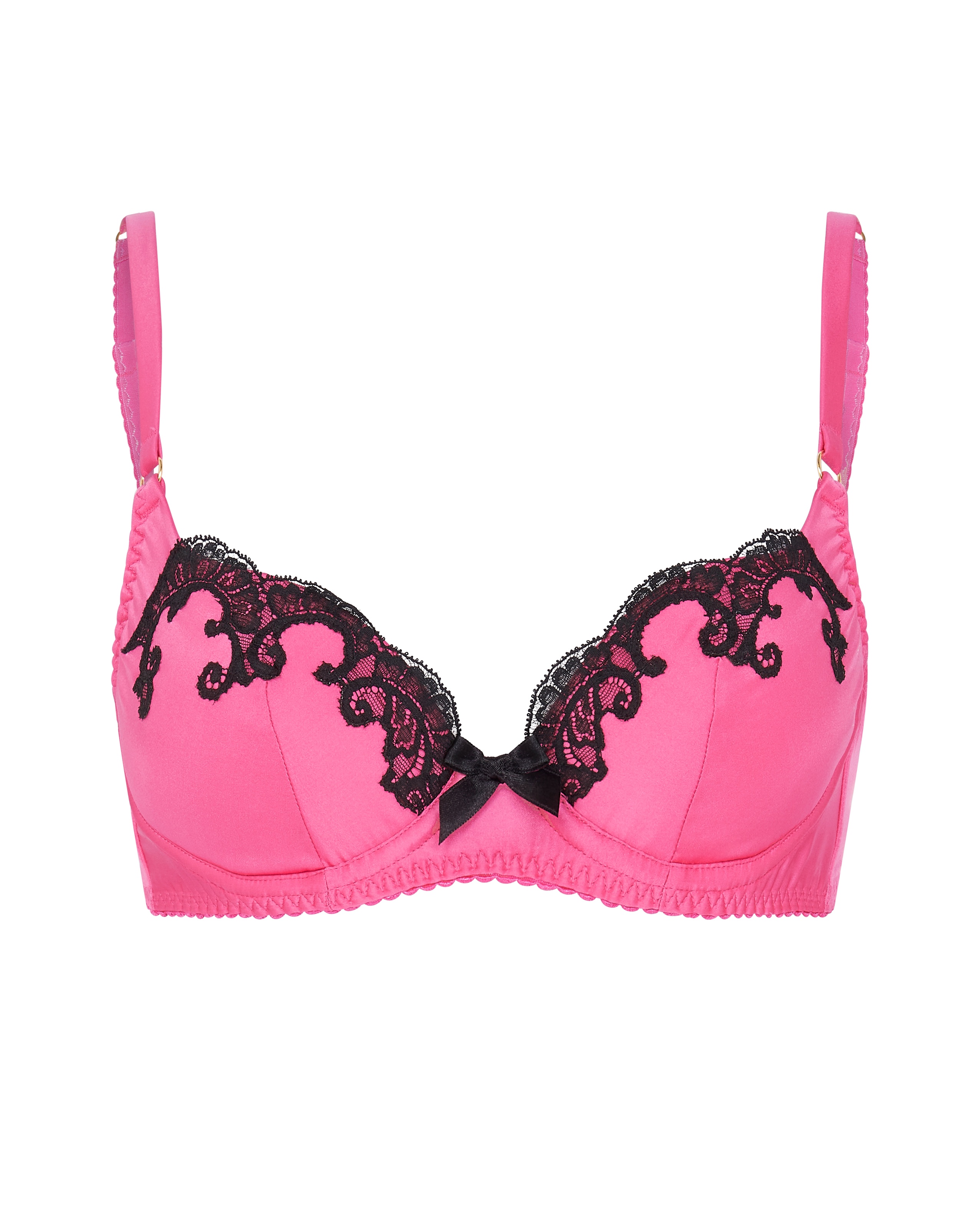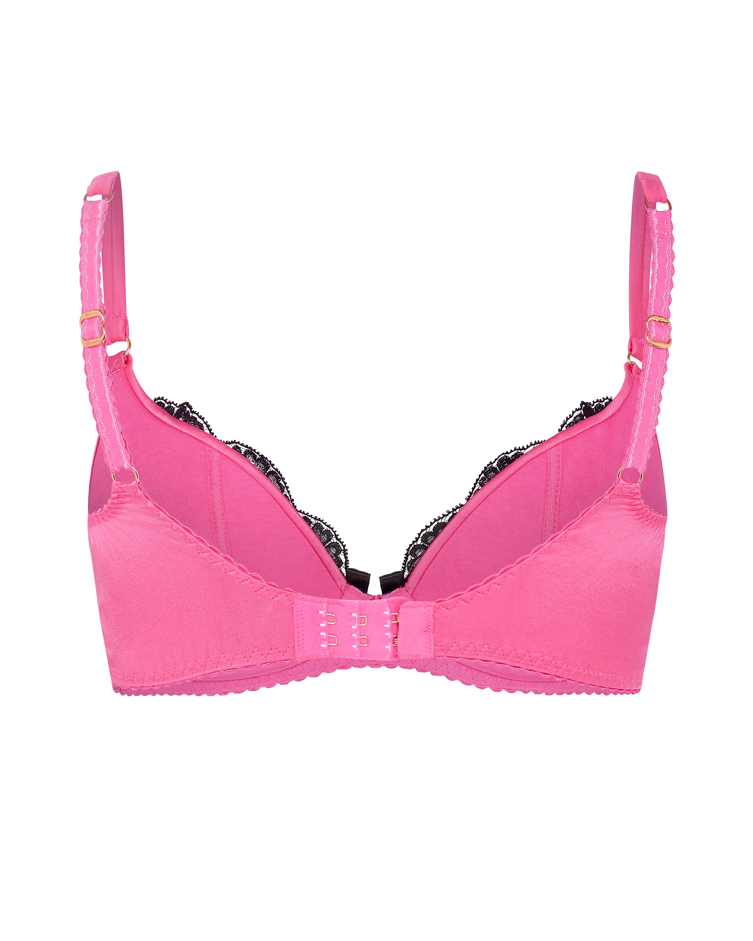 Бюстгальтер Molly в розовом оттенке сочетает плотные чашки с шелковой основой и кружевными вставками. Регулируемые бретели украшены золотистыми элементами, а между чашек расположен аккуратный атласный бантик.