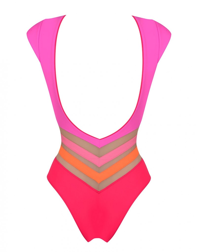 Ощутите летний зной с Zenaya - пляжной коллекцией, в которой невероятно насыщенные оттенки сочетаются с изящными линиями. Яркий купальник дополнен высокой линией декольте, короткими рукавами и глубоким вырезом. На талии неоновые вставки миксуются с контрастной черной сеткой. На спине купальник украшен треугольным вырезом до талии.