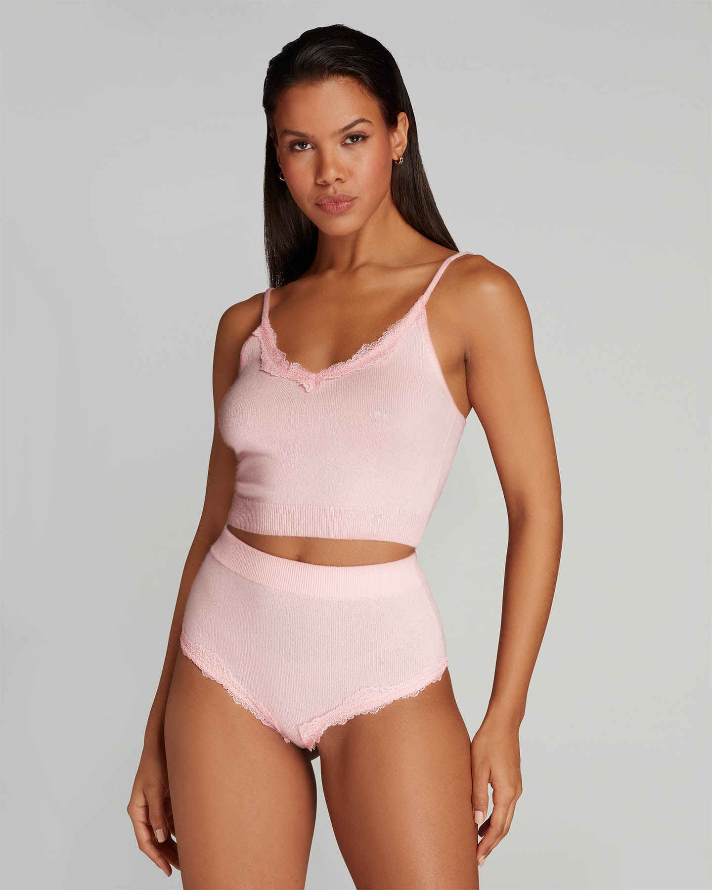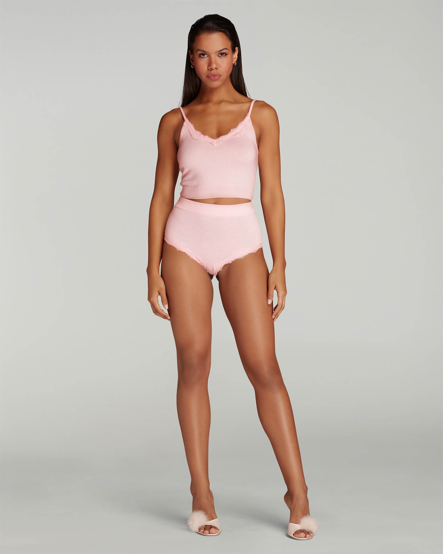 Топ-камисоль Feebee изготовлен из смеси кашемира и шерсти нежного розового цвета. Мягкий трикотаж дополнен эластичным кружевом в вырезе и ребристым низом. Чтобы полностью погрузиться в уют во время отдыха дополните образ трусами из этой же коллекции.
