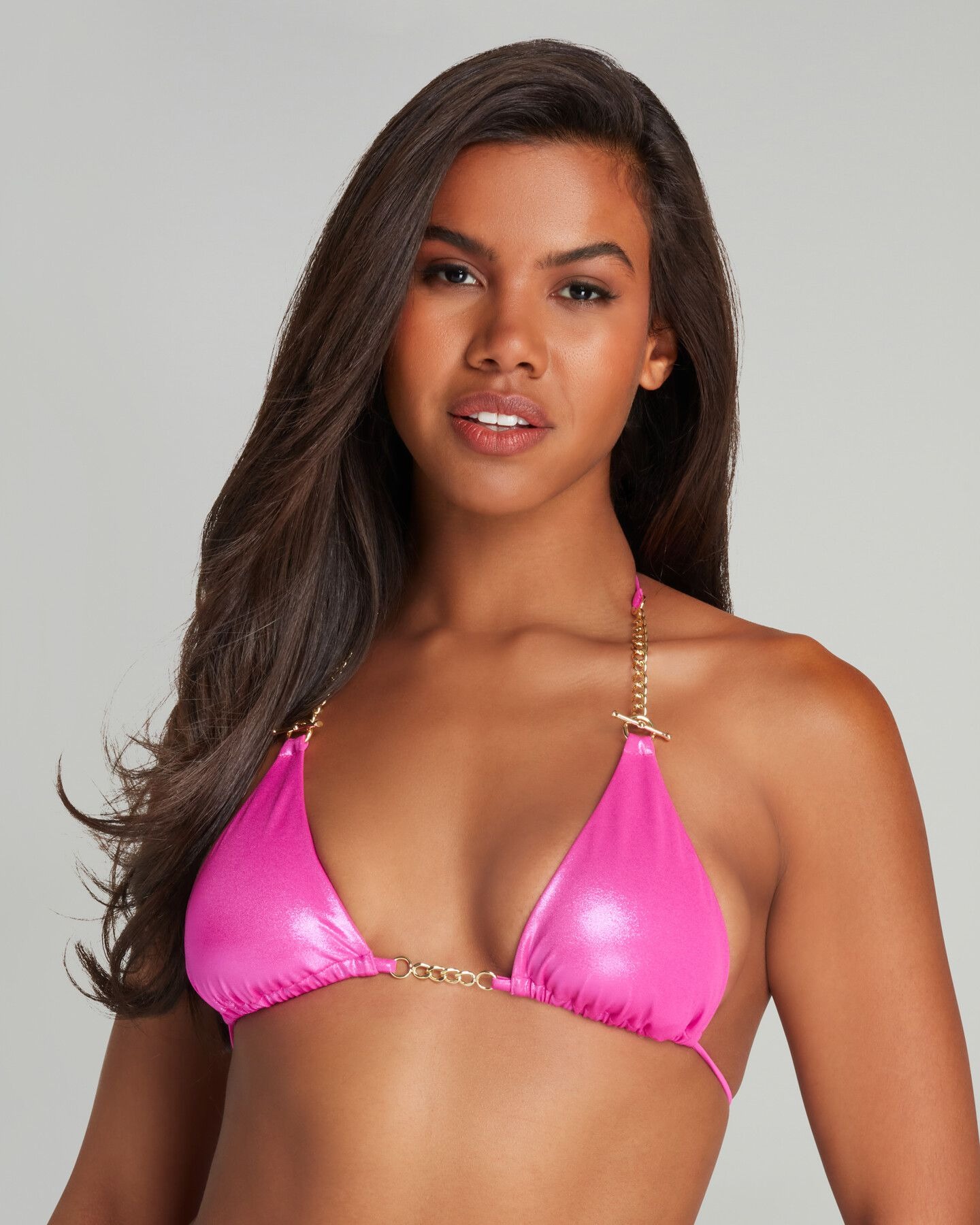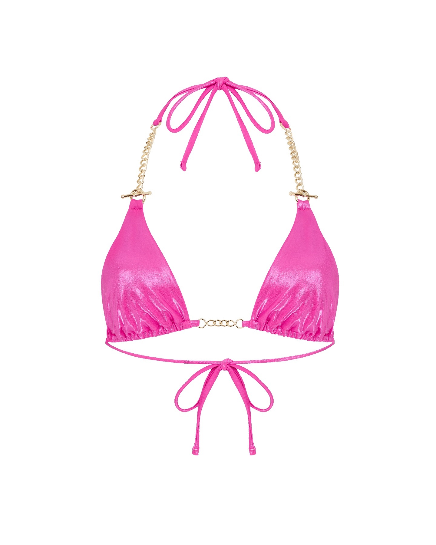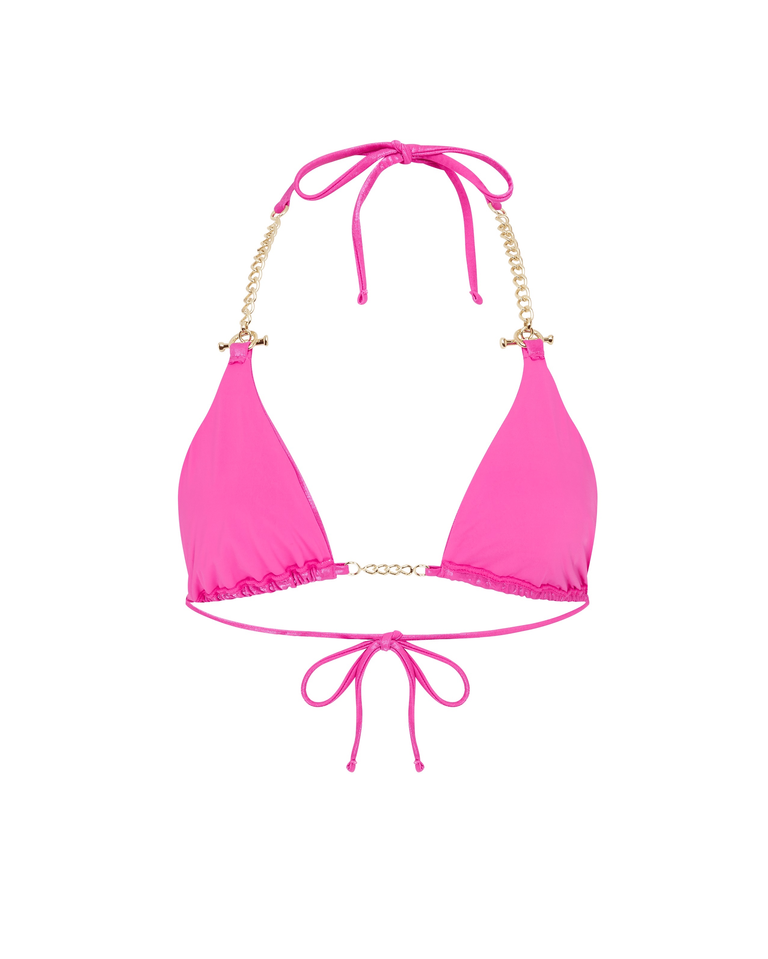 Топ купальника Antronella в насыщенном розовом оттенке с треугольными чашками и позолоченной фурнитурой, стойкой к воде и нагреву. Идеально сочетается с другими изделиями коллекции.