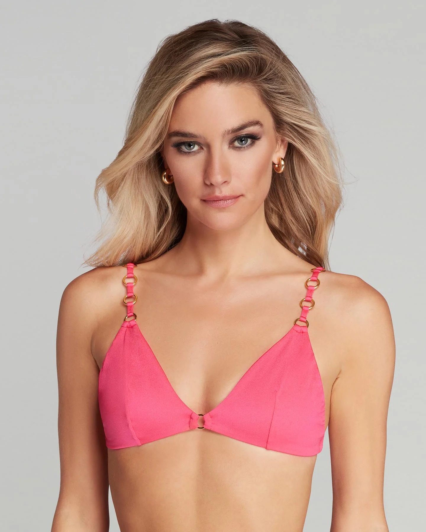Бюстгальтер купальника Ashia с мягкими треугольными чашечками сшит из плотной лайкры розового цвета. Бретели украшены маленькими золотистыми колечками. Фурнитура высокого качества не темнеет со временем и не тускнеет от солнечных лучей. Дополните образ плавками Ashia.