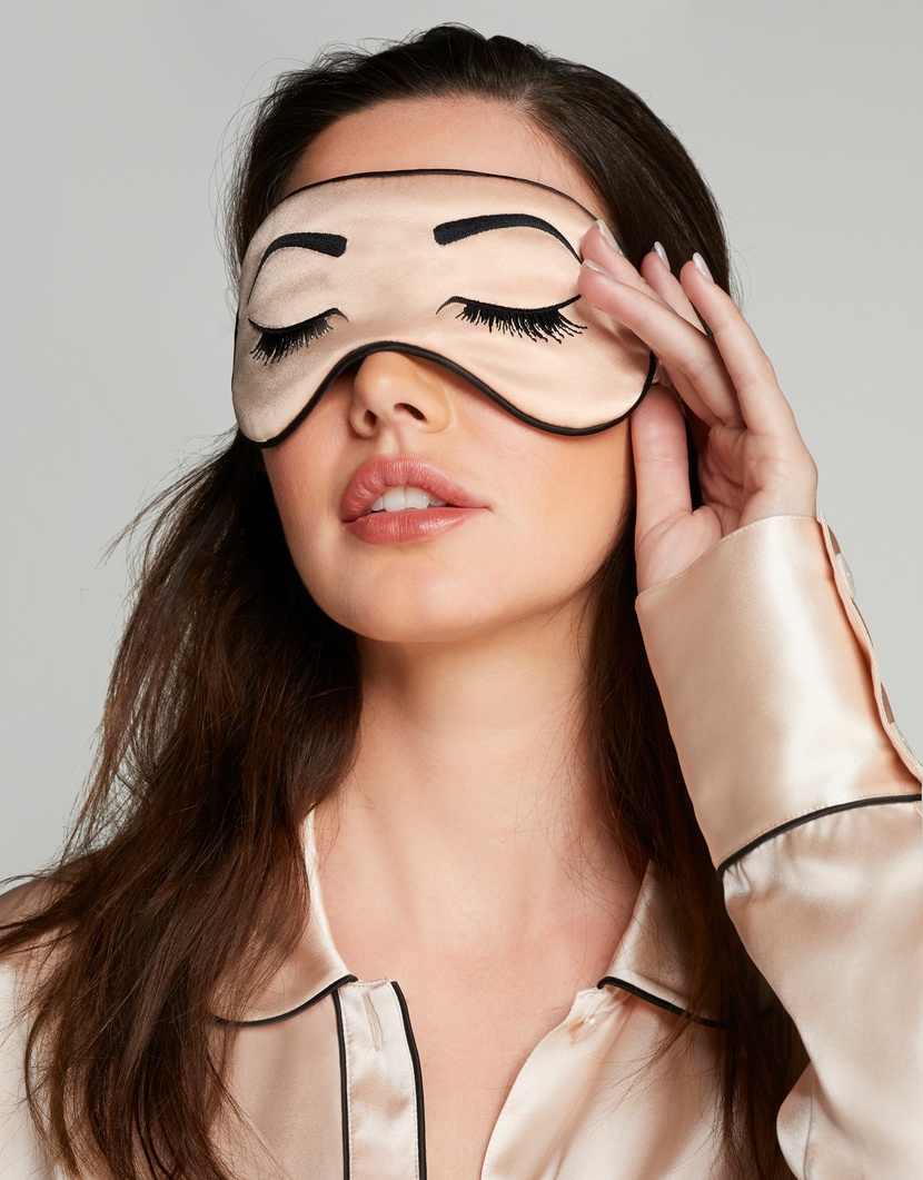 Эта маска для сна выполнена из атласного шелка нежно-розового цвета. Контрастная черная вышивка отсылает к легендарному фильму «Завтрак у Тиффани», о чем свидетельствует и название модели. Окантовка по краю подчеркивает графичность изделия. Крепление сделано с помощью широкой резинки, обернутой мягкой тканью.