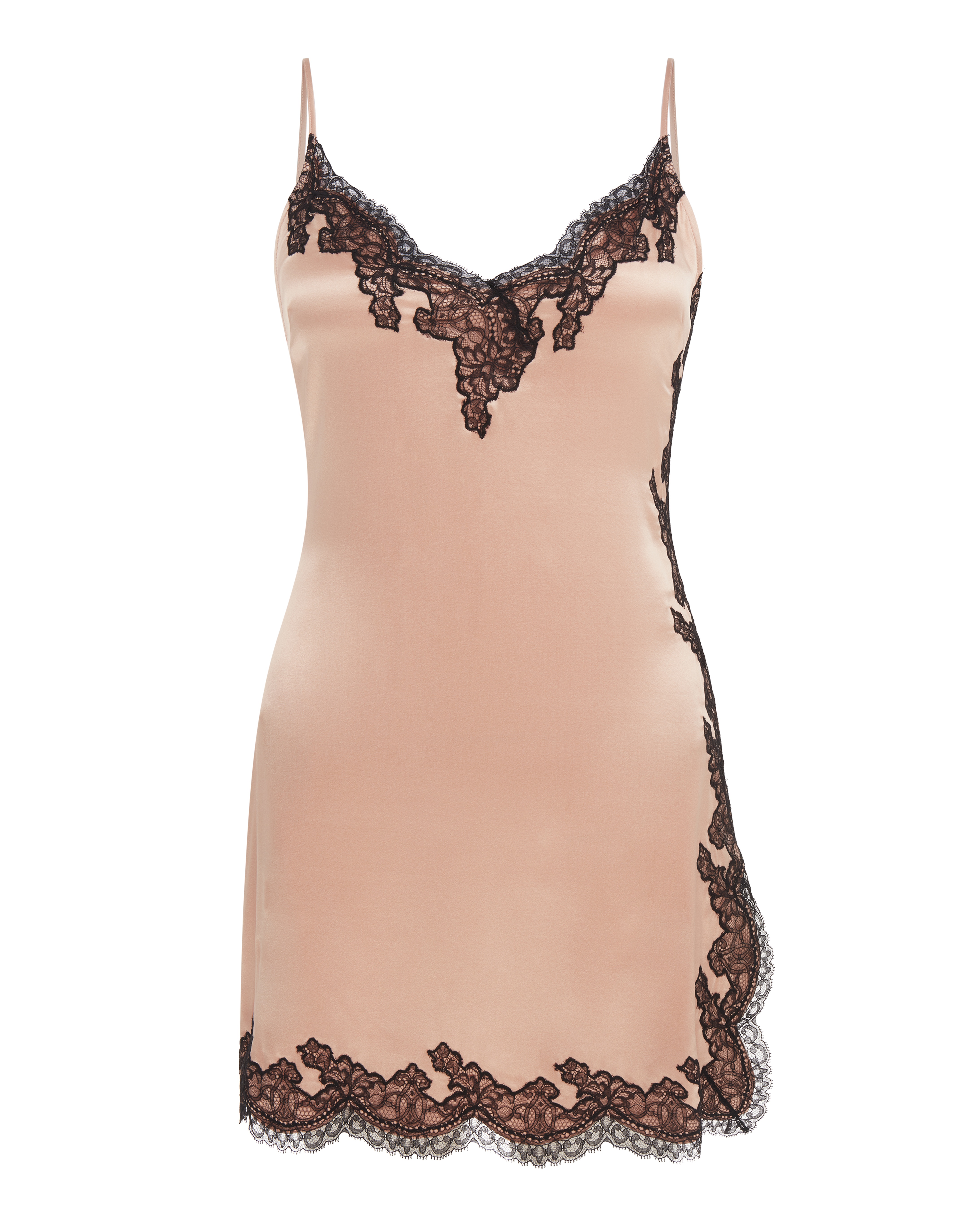 Amelea – роскошная коллекция одежды для дома в винтажном стиле, выполненная в классических цветах Agent Provocateur. Эта сорочка из шелкового стрейч сатина станет находкой для создания романтичного будуарного образа. Сорочку пудрово-розового оттенка украшает оторочка из черного французского кружева. Модель дополнена тонкими бретелями и продольным вырезом с левой стороны.