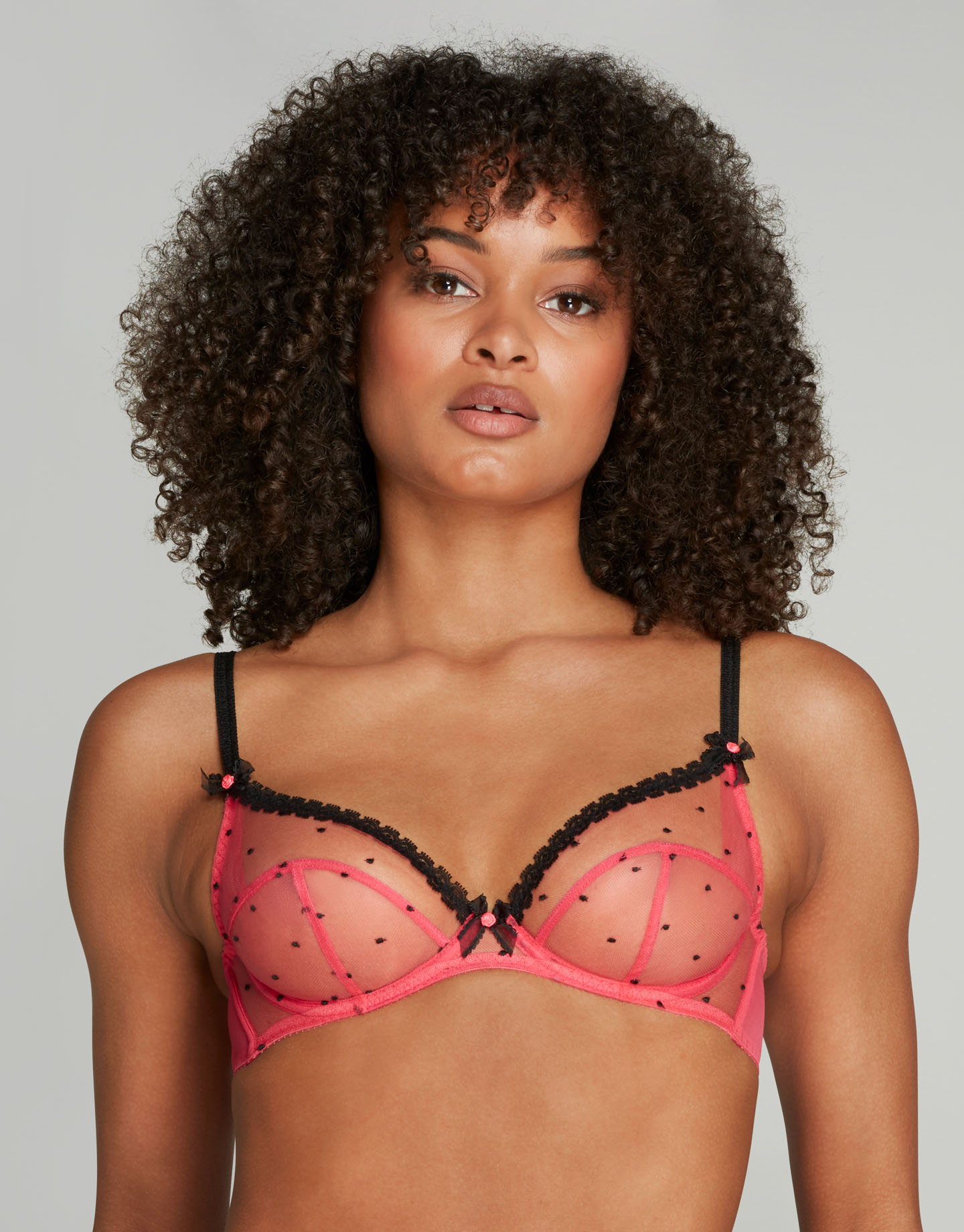 Мягкий бюстгальтер фасона балконет из коллекции Poppie выполнен из прозрачного розового тюля. Полотно украшают фактурные точки пуэн-деспри. Чашечка, состоящая из трех частей, идеально подойдет для пышной груди. Поддержка на косточках фиксирована лентой под грудью. Фигурный V-вырез окантован черной лентой с ресничным краем. Акценты расставлены в виде бантов, обрамляющих линию выреза.
