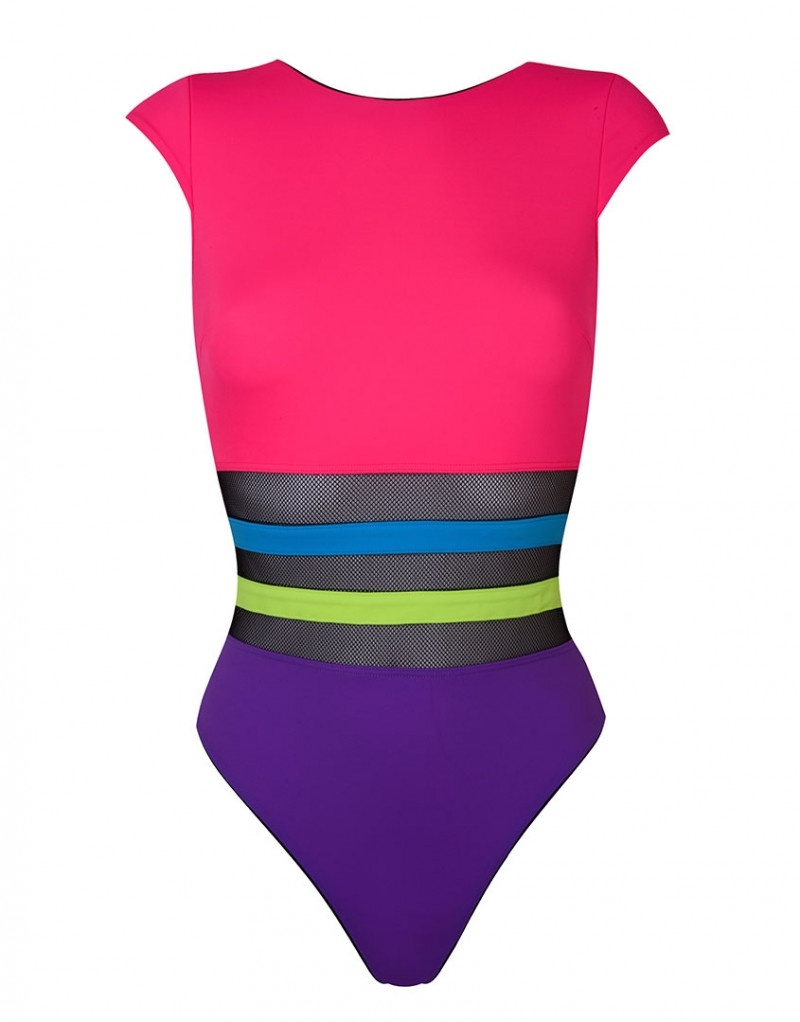 Ощутите летний зной с Zenaya - пляжной коллекцией, в которой невероятно насыщенные оттенки сочетаются с изящными линиями. Слитный купальник с рукавами, закрывающими плечи, украшен на талии неоновыми полосками, обрамленными контрастными панелями из черной сетки. Сзади эти линии образуют геометрический шевронный узор. Высокие плавки и глубокий вырез на спине завершают образ.