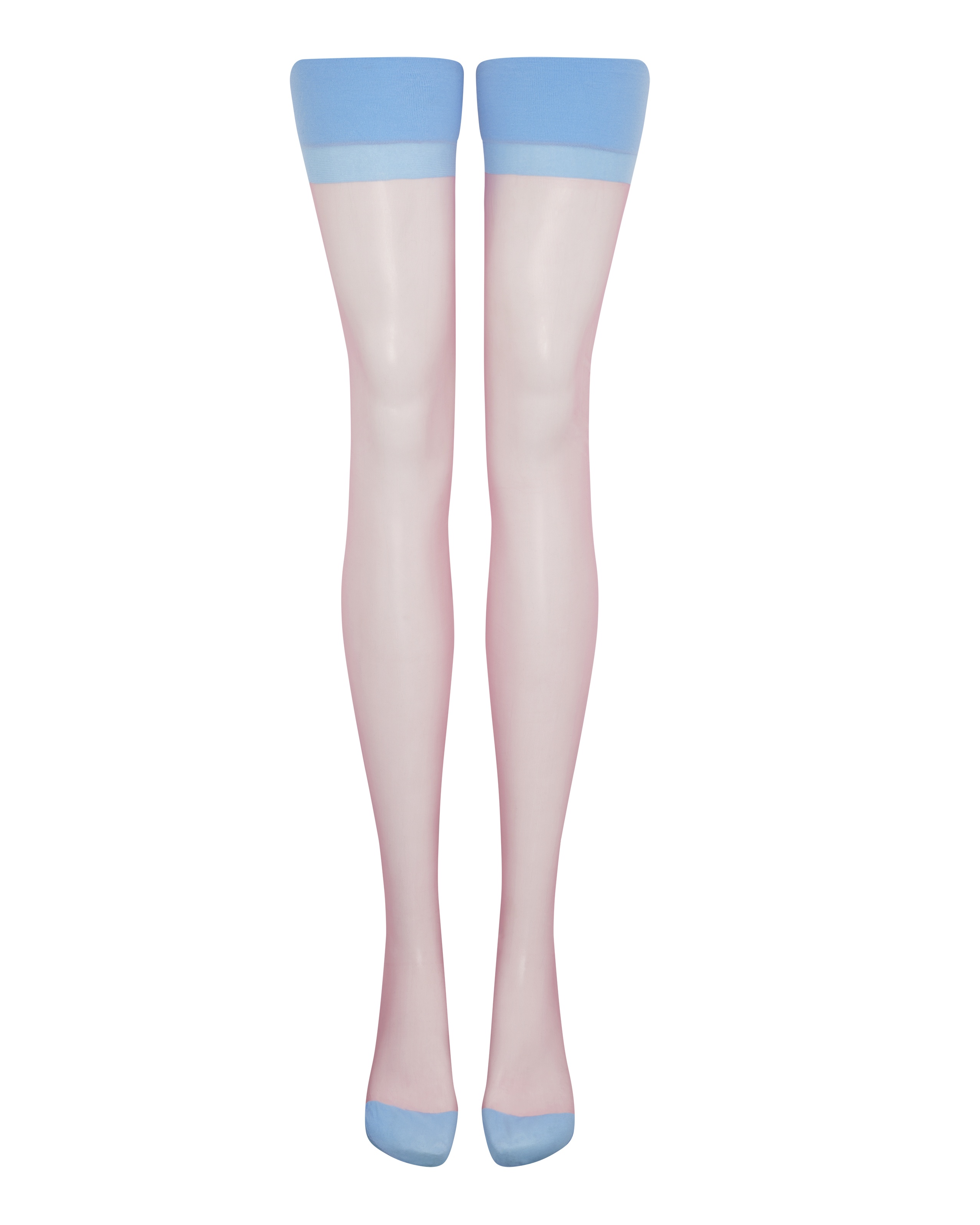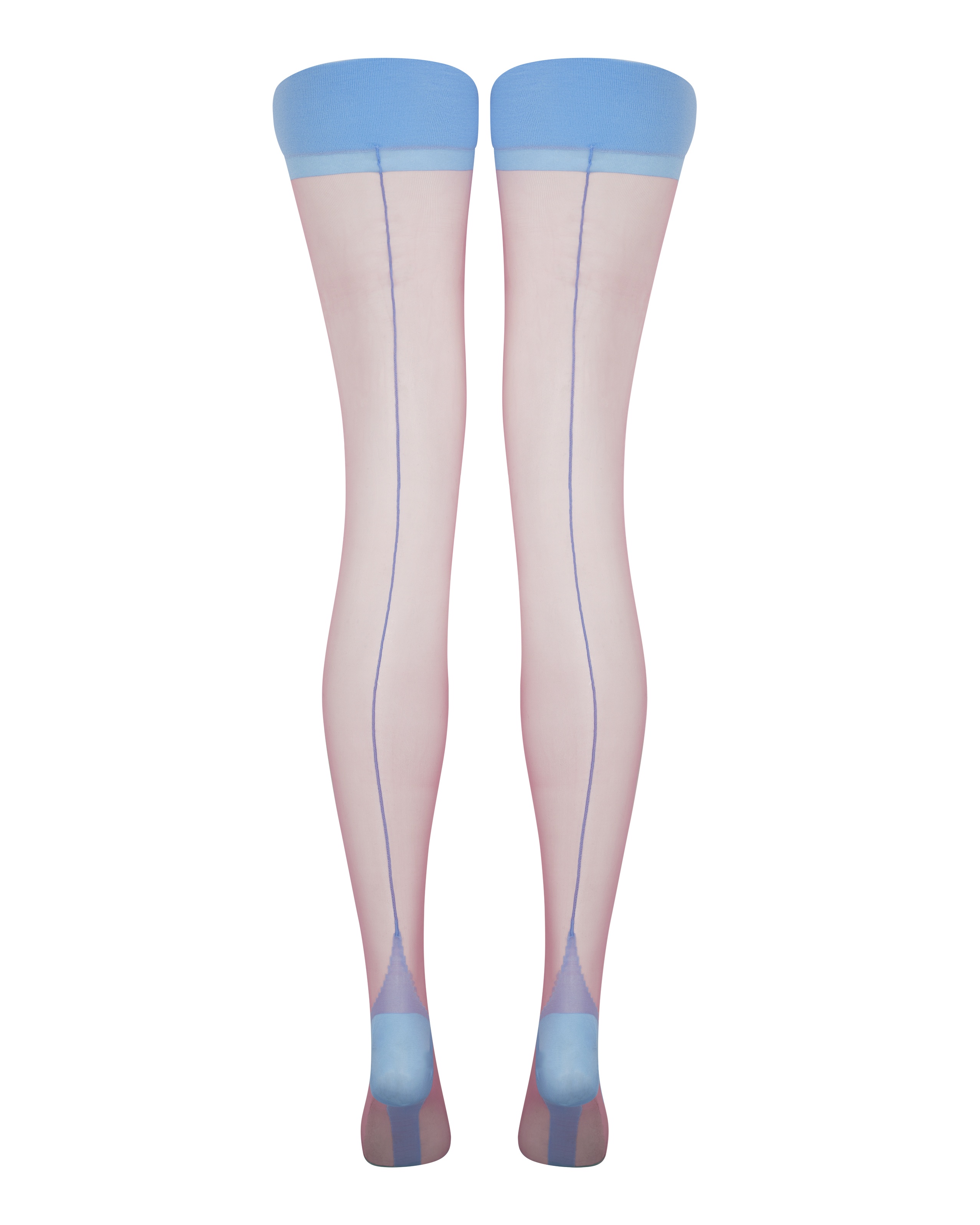 Розово-голубые чулки под пояс Ora создают элегантный образ благодаря продольному шву сзади. Укрепленные пятка и носок добавляют практичности, а нейлоновая ткань сохраняет форму и прочность.