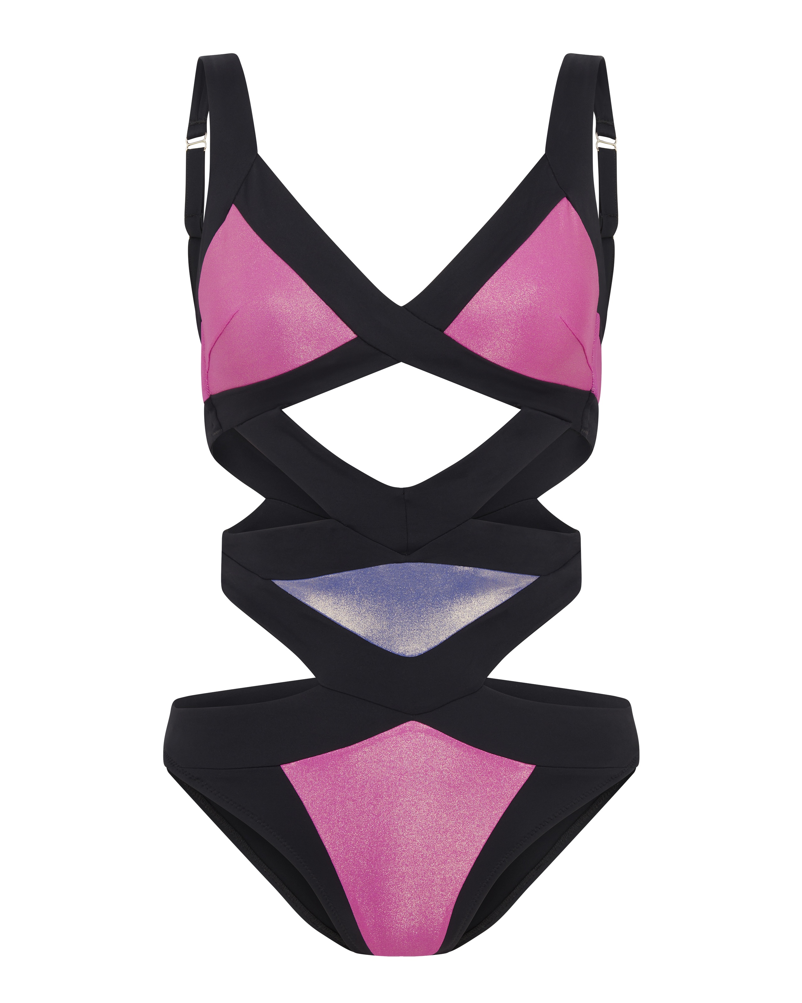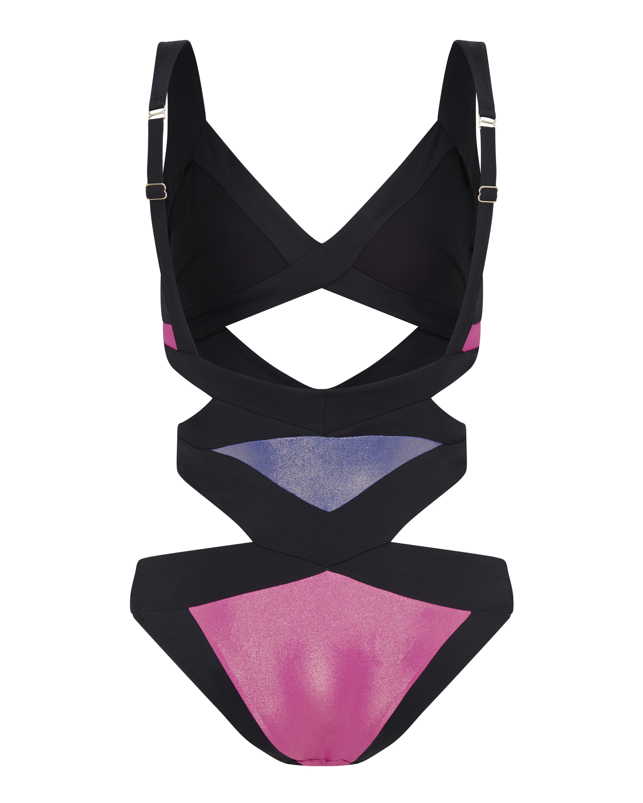Слитный купальник Mazzy выполнен в черном, розовом и синим цветах. Отличительная черта изделия - многоцветные панели с золотистым блеском, которые ловят и отражают свет. Эта модель, ставшая хитом продаж, изготовлена из инновационной итальянской ткани ECONYL®. Купальник оформлен в бандажном стиле, при этом мягкие треугольные чашечки добавляют удобства. Металлическая фурнитура с позолотой и дерзкие вырезы делают образ по-настоящему провокационным.