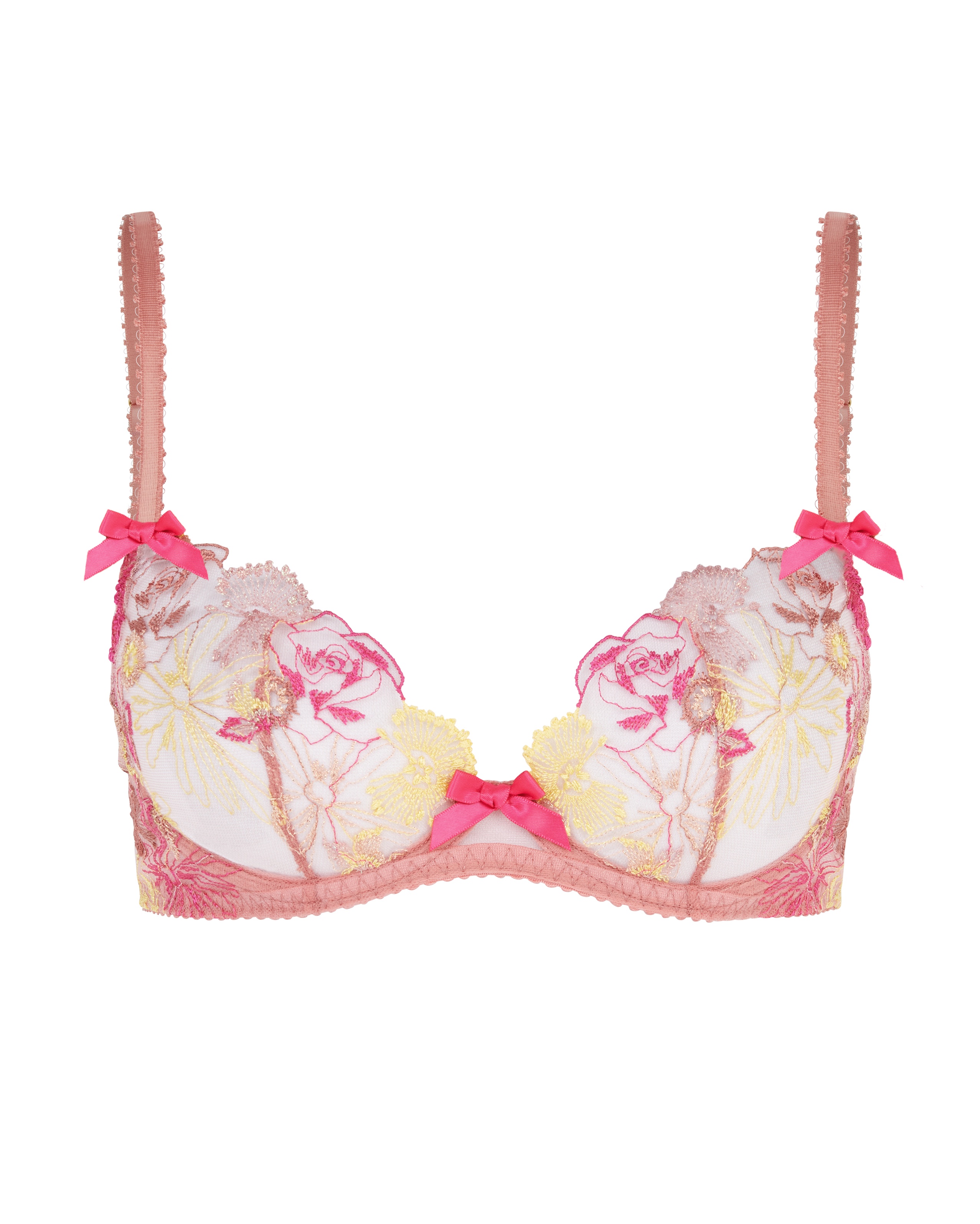Бюстгальтер с мягкими чашечками Zuri, окрашенный в розово-желтые тона, декорирован вышивкой с цветочными мотивами. Изготовлен из тонкого итальянского тюля с деталями на бретелях, покрытыми настоящим золотом. Сочетайте с другими элементами коллекции для создания полного образа.