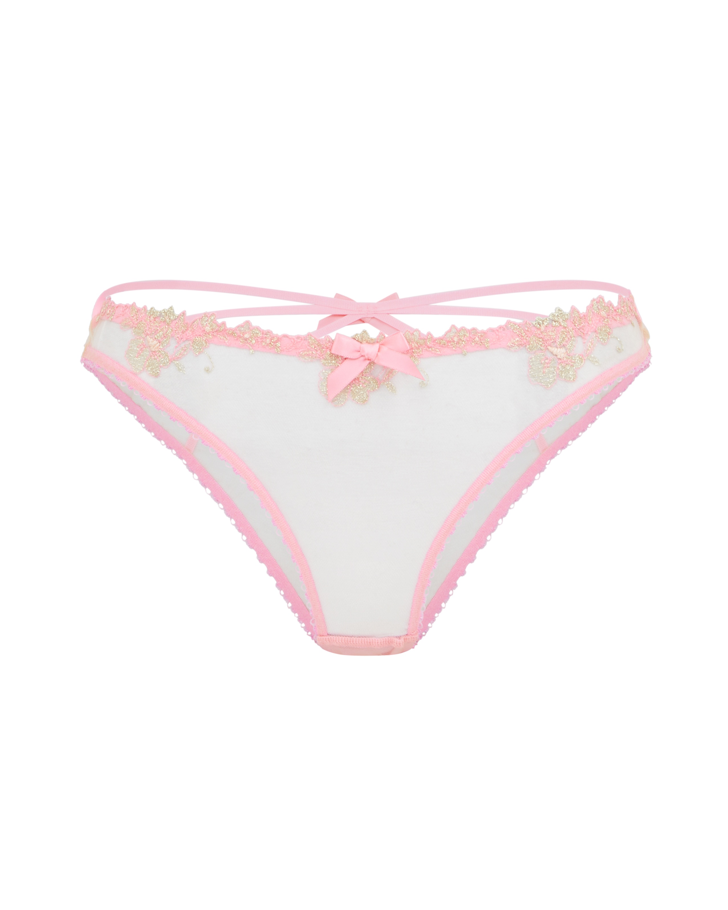 Розовые классические трусы Tessy выполнены из тонкого тюля и украшены швейцарской вышивкой с добавлением золотистых нитей. Модель с озорными вырезами и декоративными элементами на задней части подчеркивает красоту силуэта. Эти трусы станут прекрасным дополнением к элементам той же серии Tessy, обеспечивая привлекательный и женственный вид.