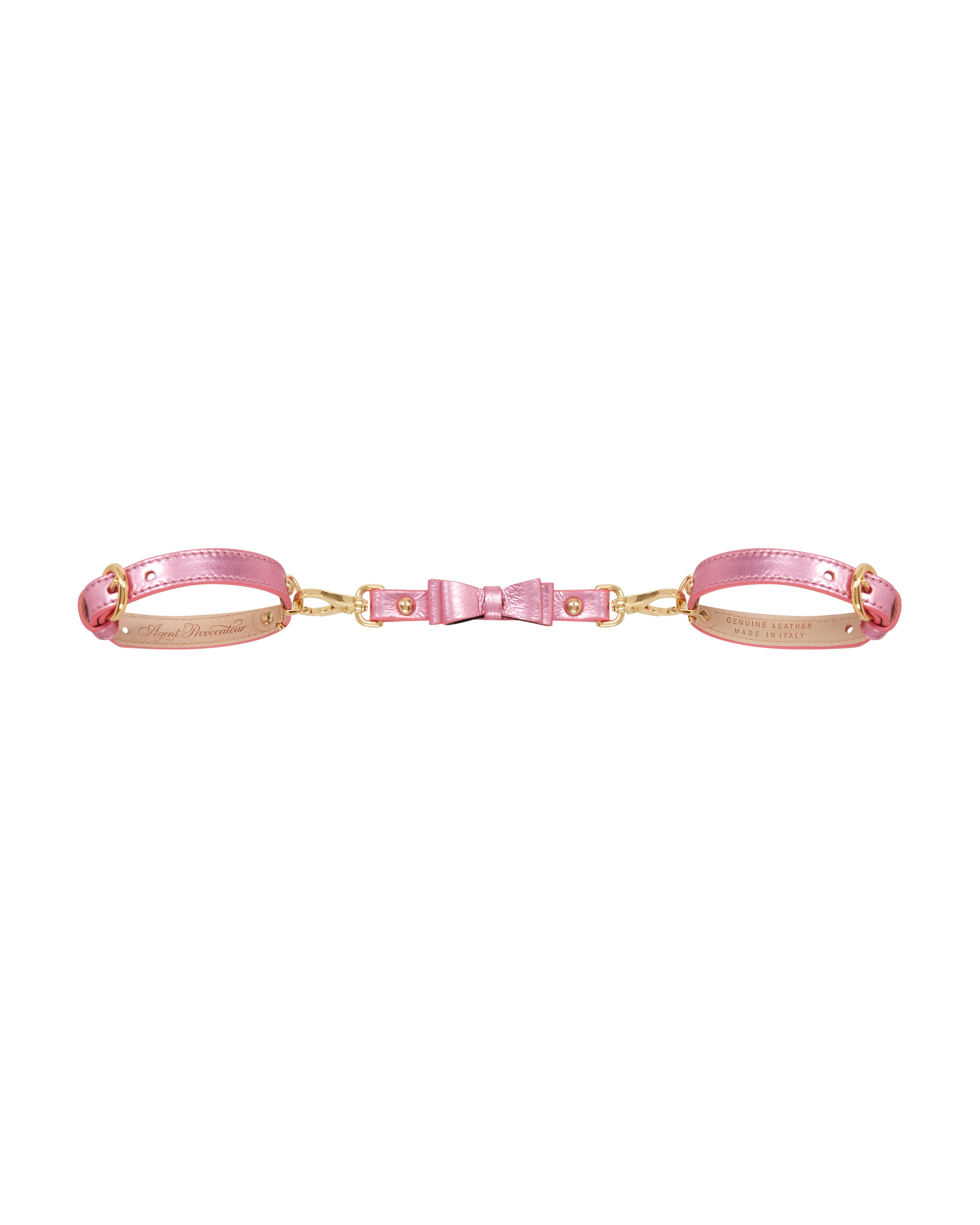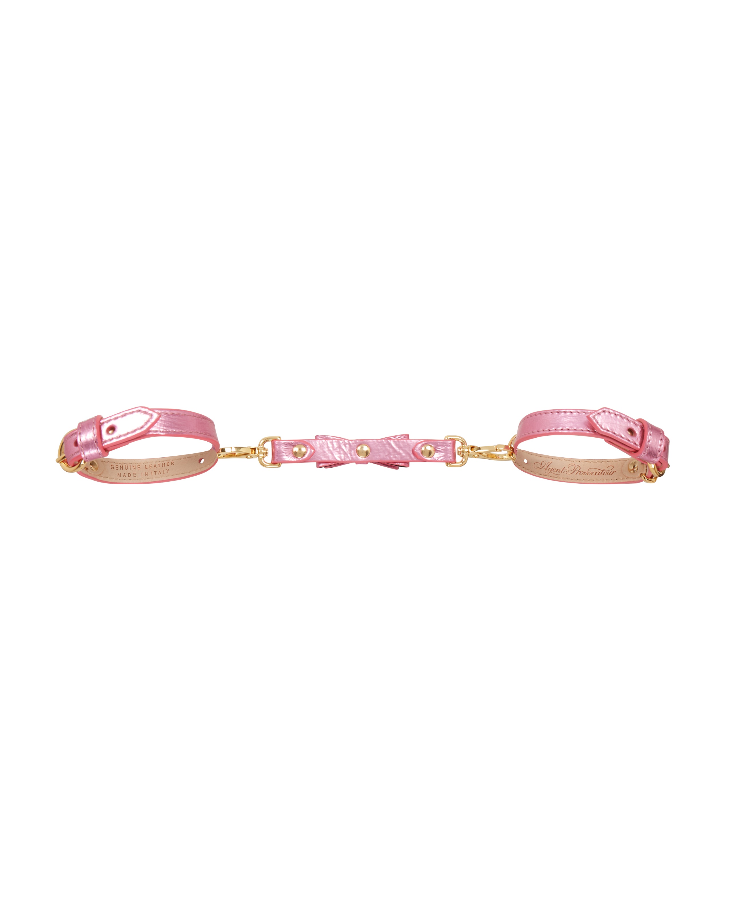 Манжеты Steevie вручную изготовлены в Италии из розовой металлизированной кожи с подкладкой из лакированной кожи. Украшены роскошной золотой фурнитурой и игривым бантом. Объедините с ошейником Steevie, чтобы определить правила вашей игры. Со съемным поводком вы сами решаете, куда заведет вас Steevie.