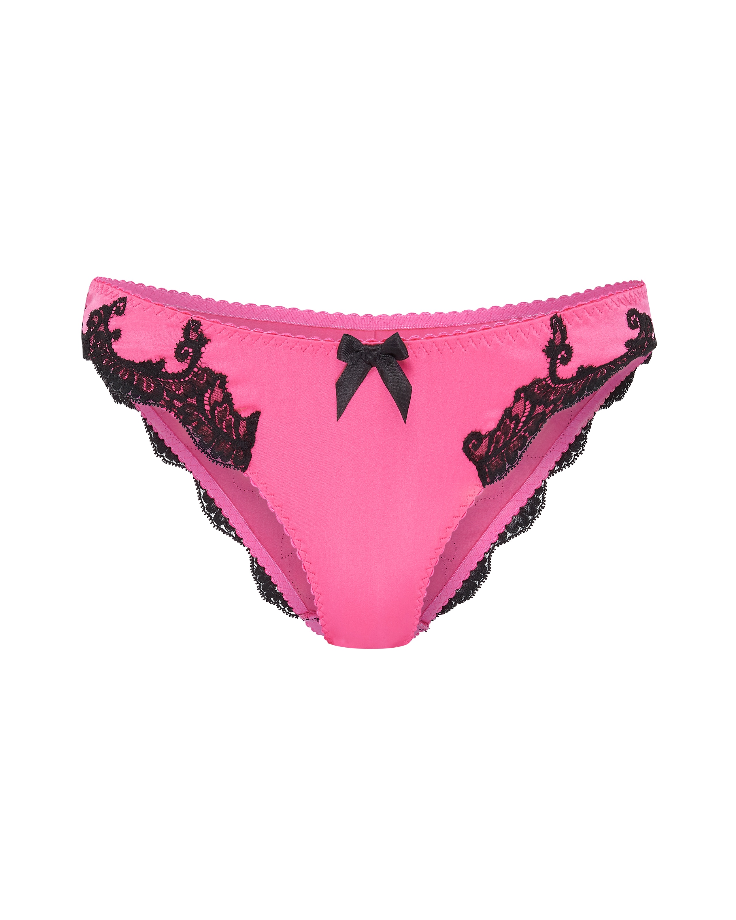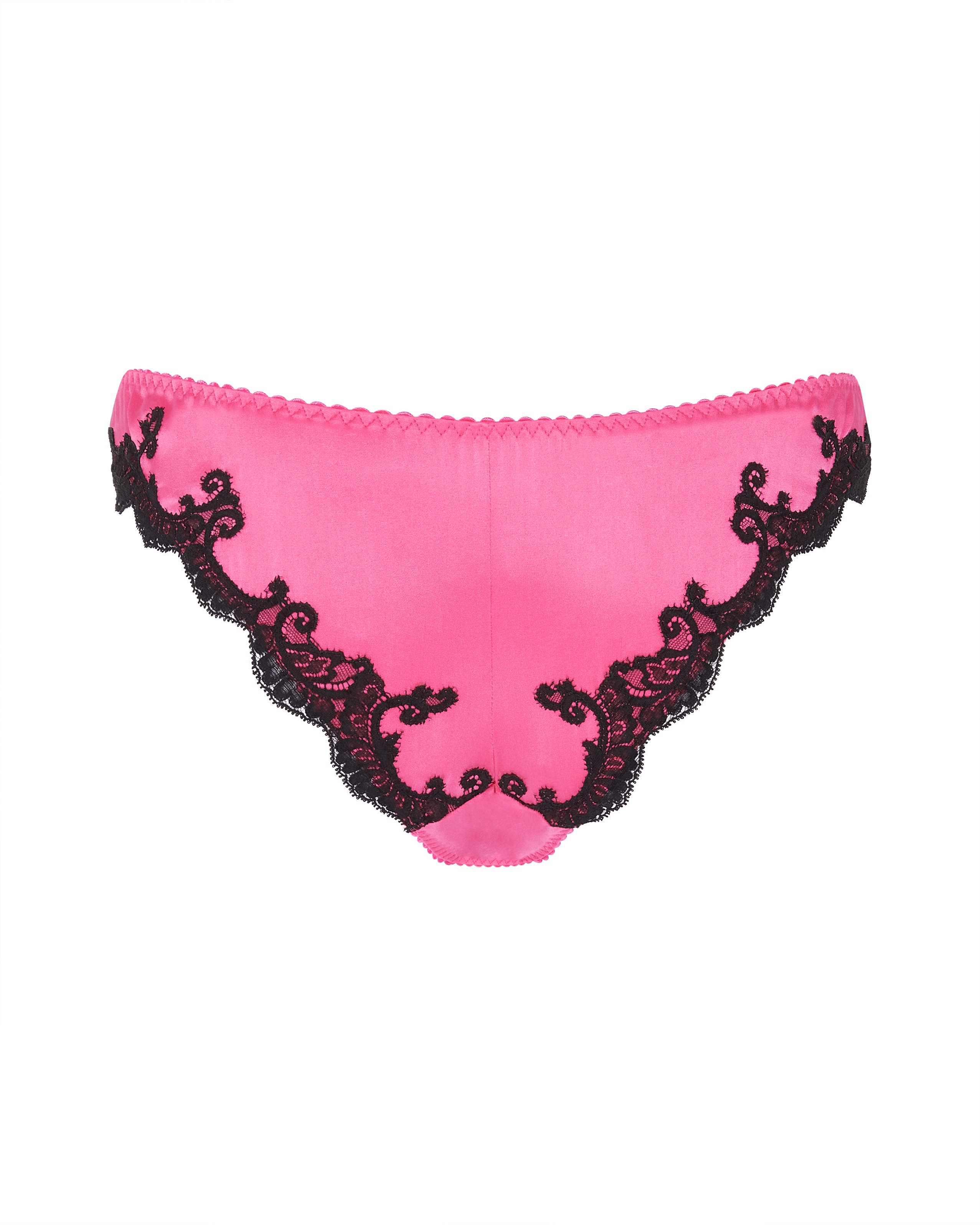 Классические трусы Molly из розового шелкового атласа украшены вставками из черного французского кружева. Завершающий штрих — изящный бантик на талии.