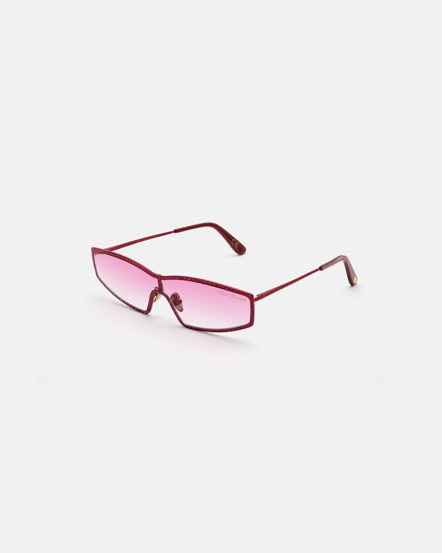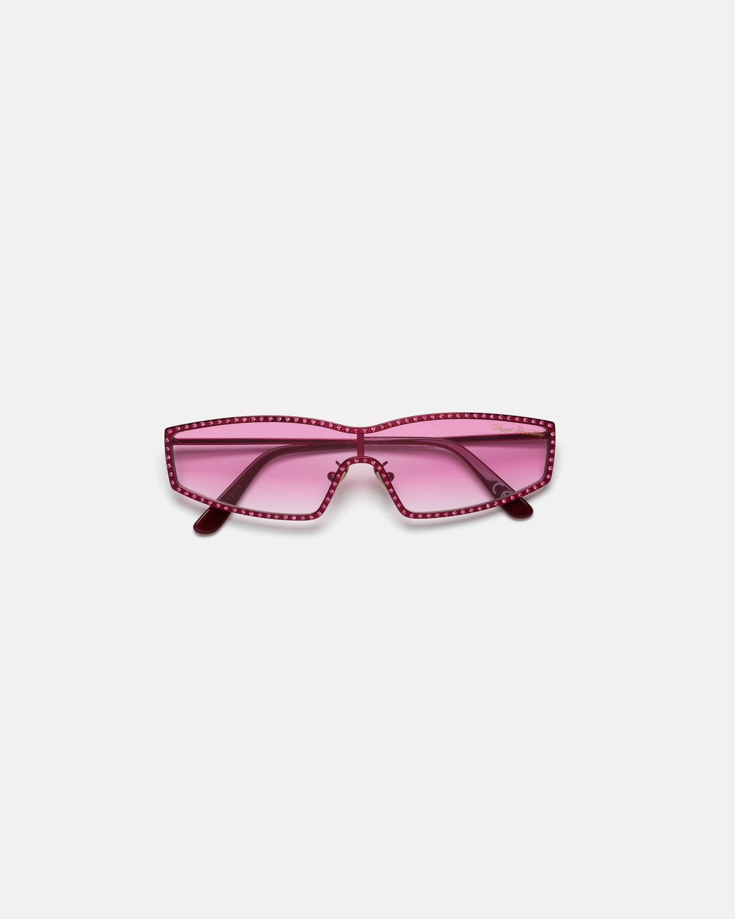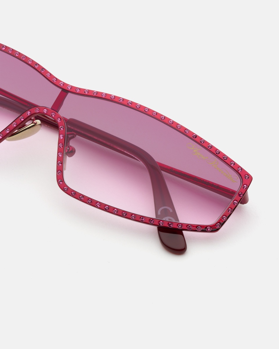 Солнцезащитные очки в прямоугольной оправе выполнены в розовом цвете. Модель из коллекции Scarlette усеяна кристаллами в тон оправе. На линзах розовая тонировка. На дужке разместился логотип бренда.