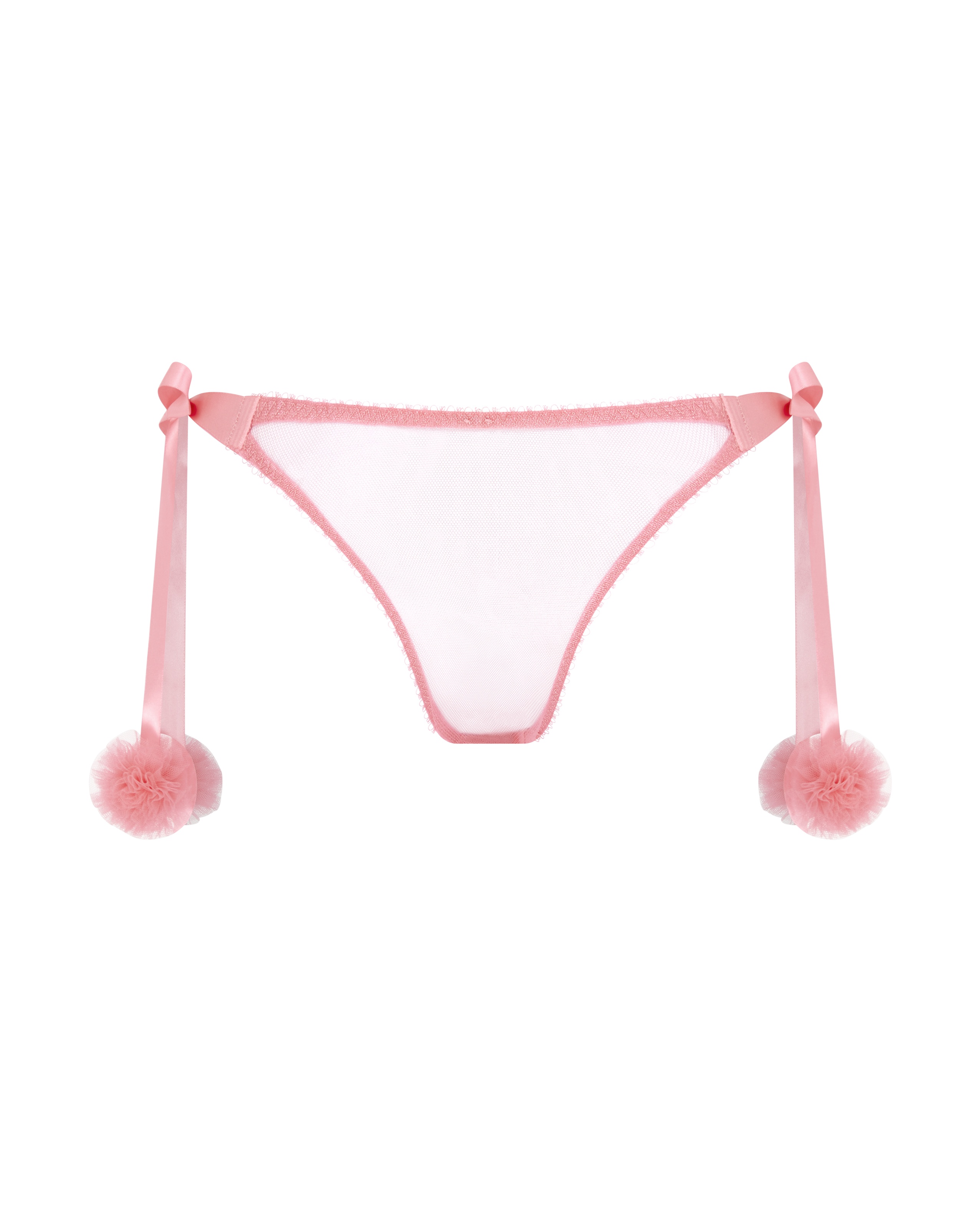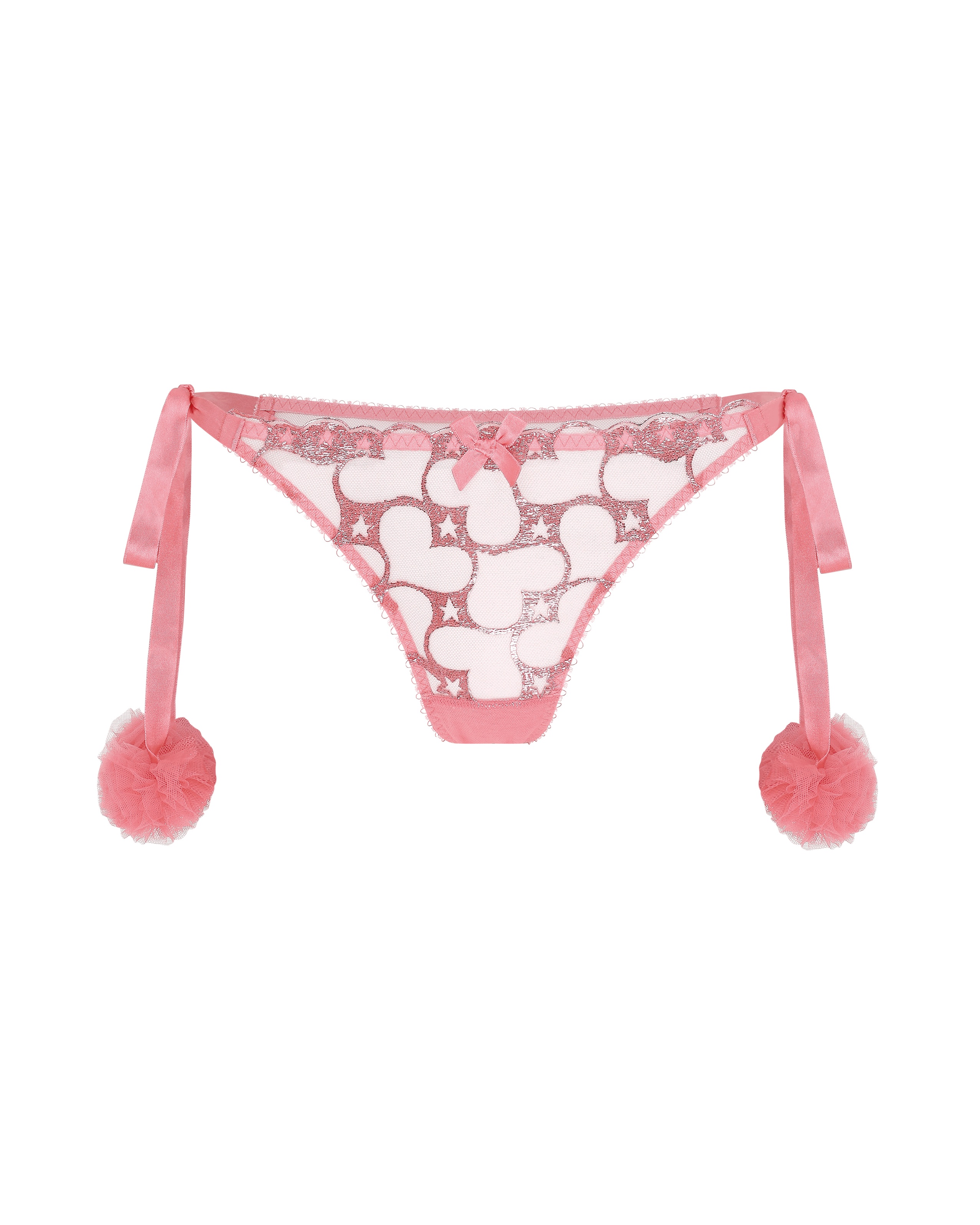 Трусы на завязках Bobbi с атласными лентами и игривыми помпонами из рифлёного тюля. Полупрозрачная задняя часть в стиле бразилиана и вышивка с блестящими звёздами и сердцами делают образ уникальным. Сочетайте их с другими изделиями из коллекции Bobbi.