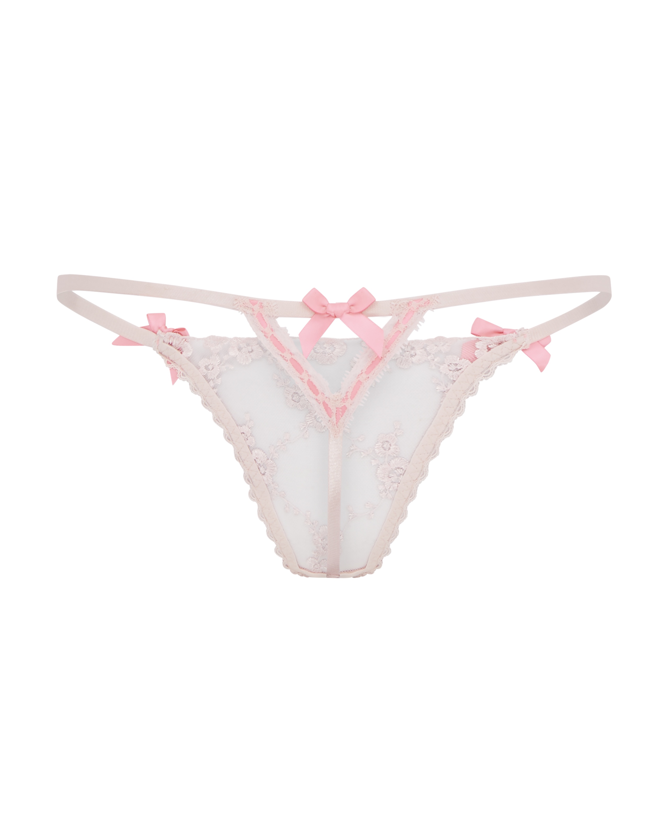 Дерзкие розовые стринги Adelie в стиле танга украшены нежной вышивкой в виде цветов вишни, украшенной радужной фольгированной отделкой, придающей изделию мерцающий, неземной вид. Модель создана, чтобы идеально сочетаться с остальными предметами коллекции Adelie, дополняя ансамбль, который излучает мечтательный женственный шарм.