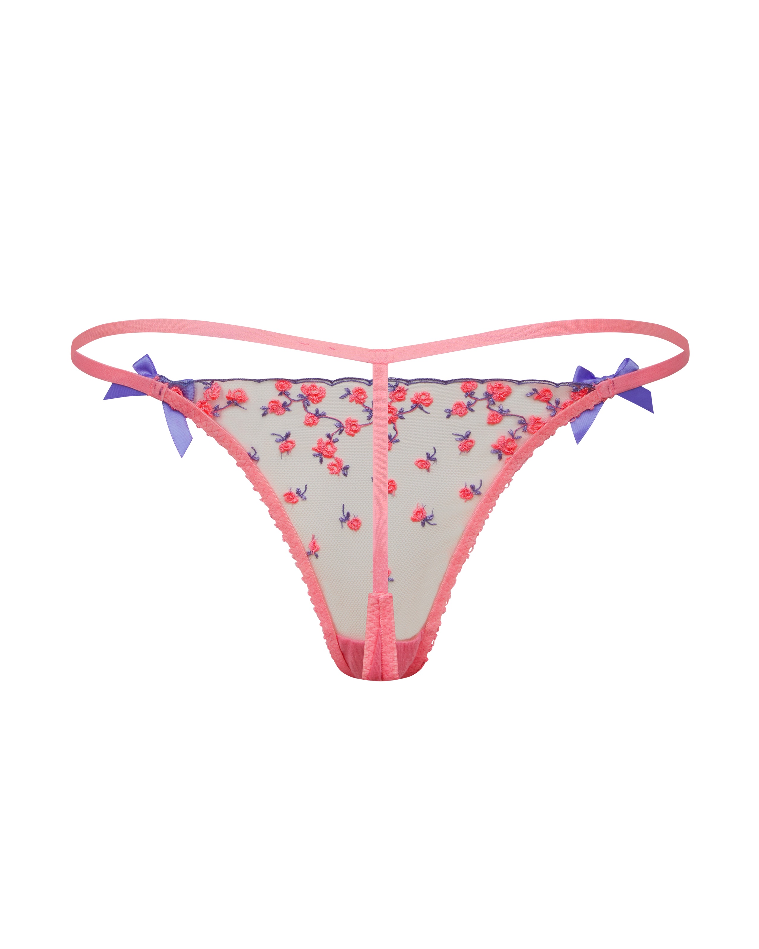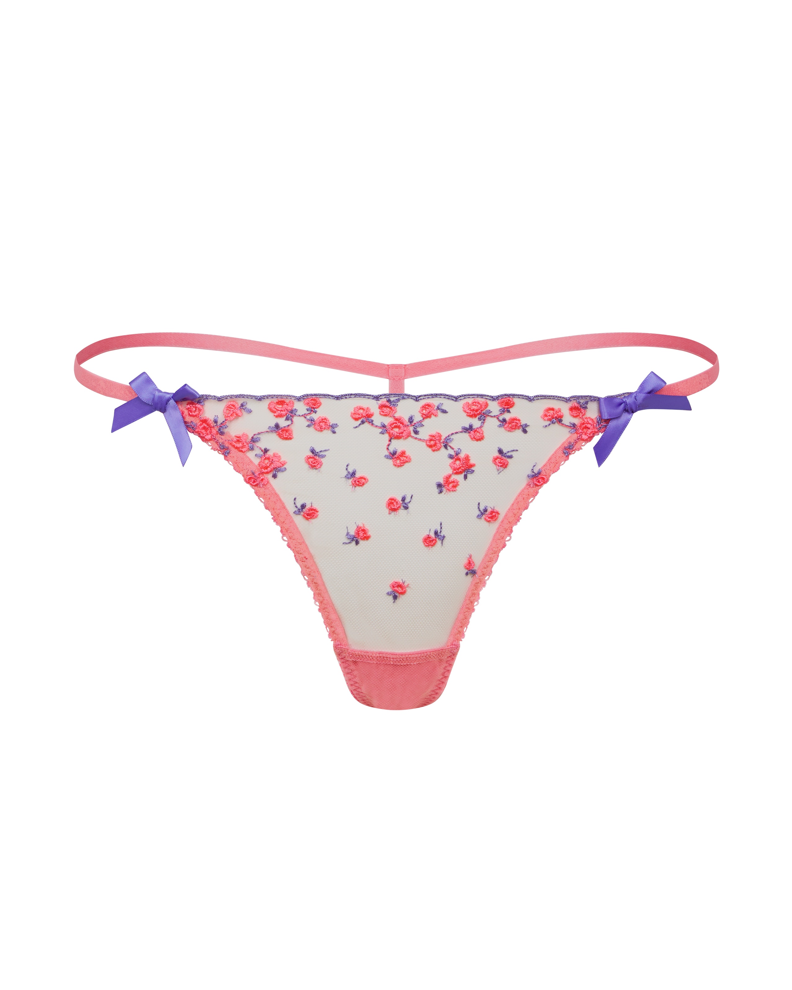 Стринги Lissa: розово-сиреневая палитра, ажурная австрийская вышивка, открытые бока. Эластичные детали для комфорта. Финальный штрих ансамбля Lissa.
