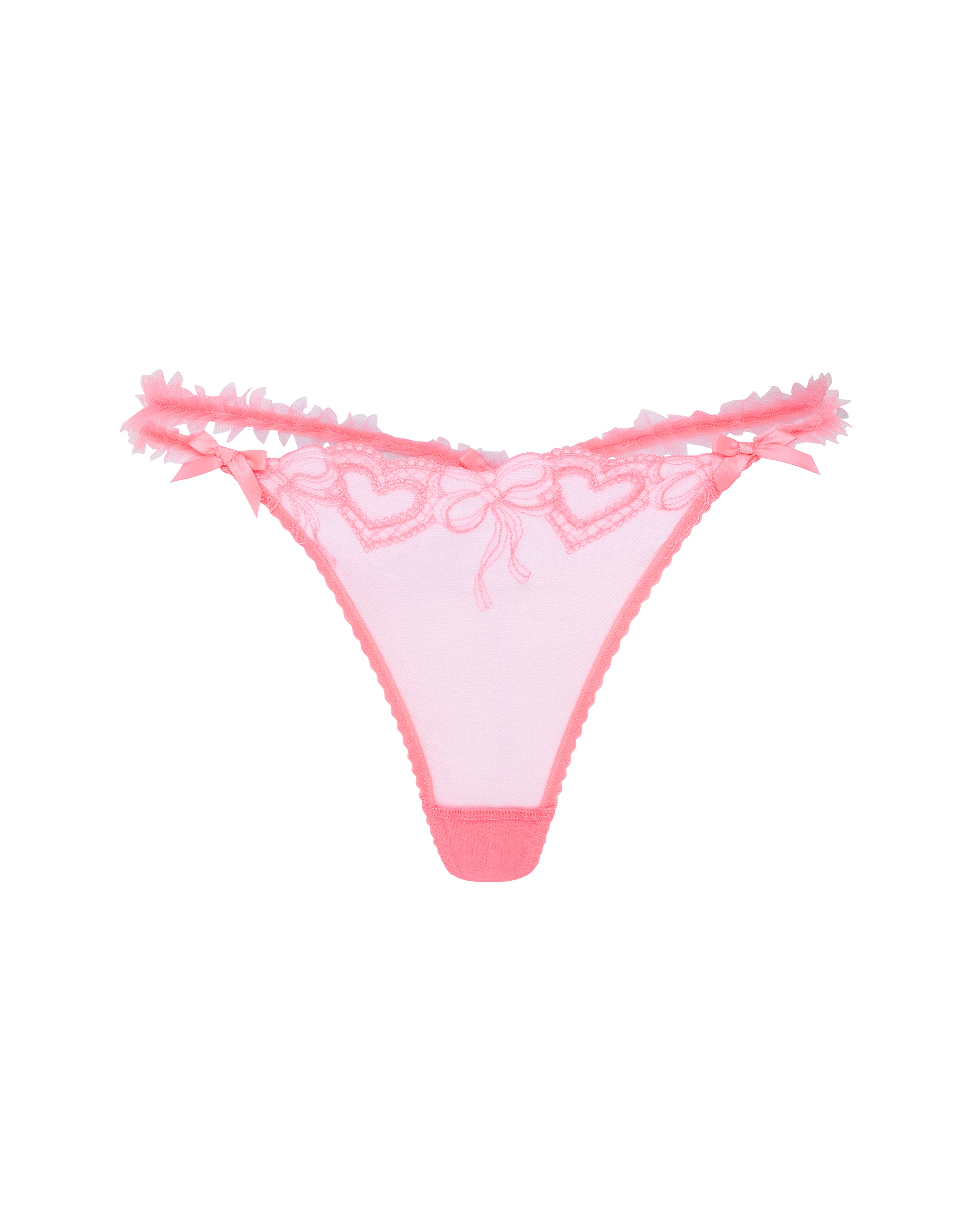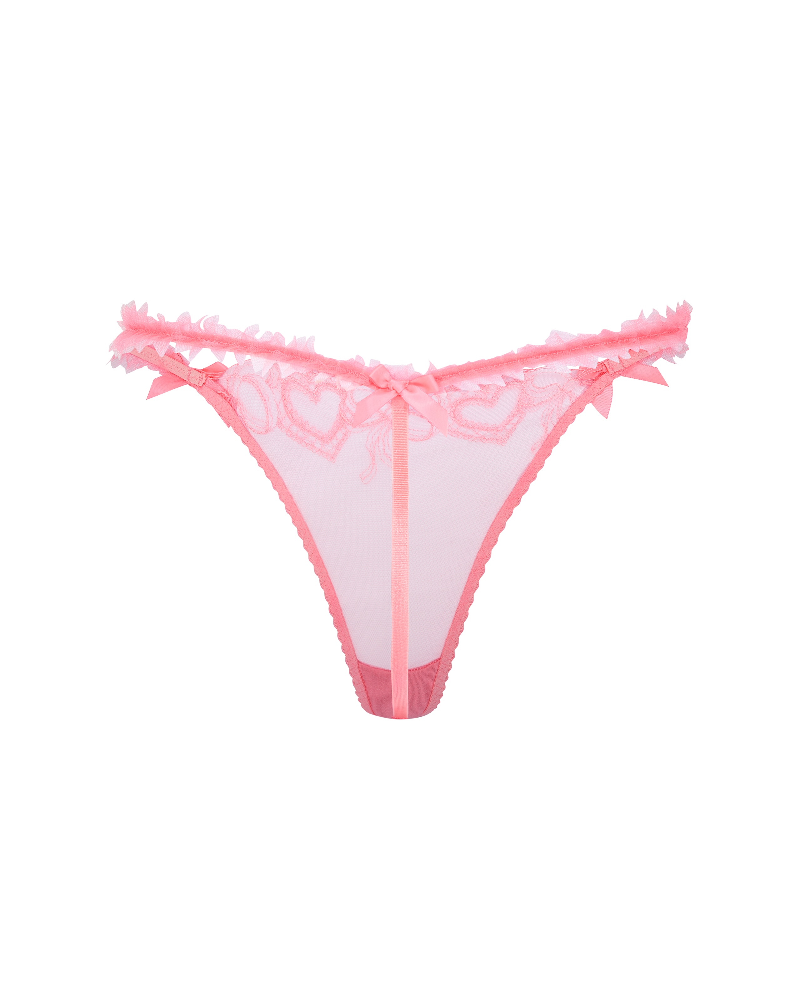 В коллекции Mimie представлены нежные стринги с швейцарской вышивкой с изящными сердечками и бантами. По краям дополнены воздушной оборкой из тюля. Добавьте пояс и бюстгальтер из этой же коллекции, чтобы создать цельный комплект.