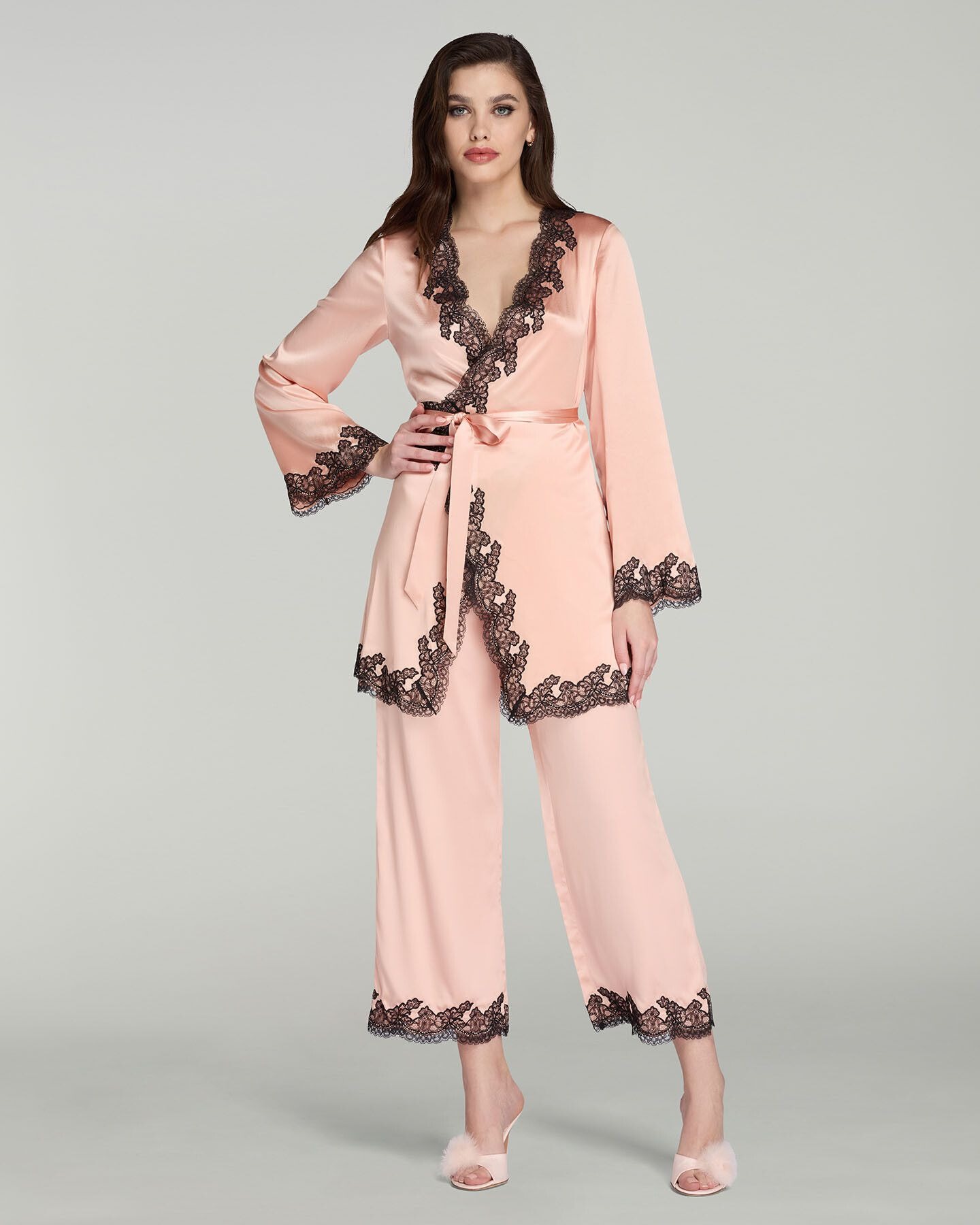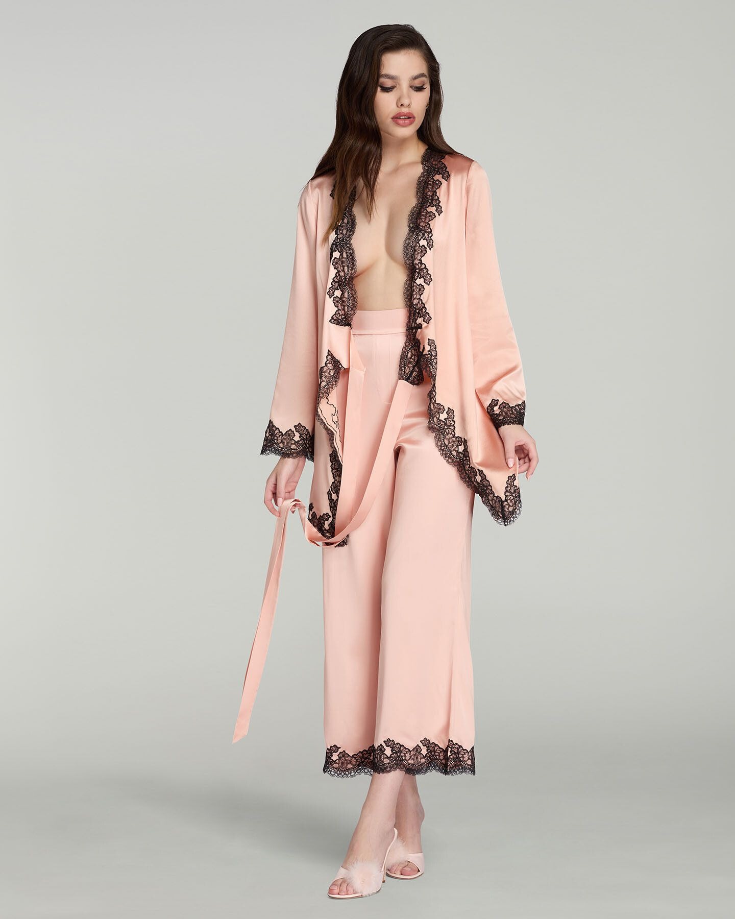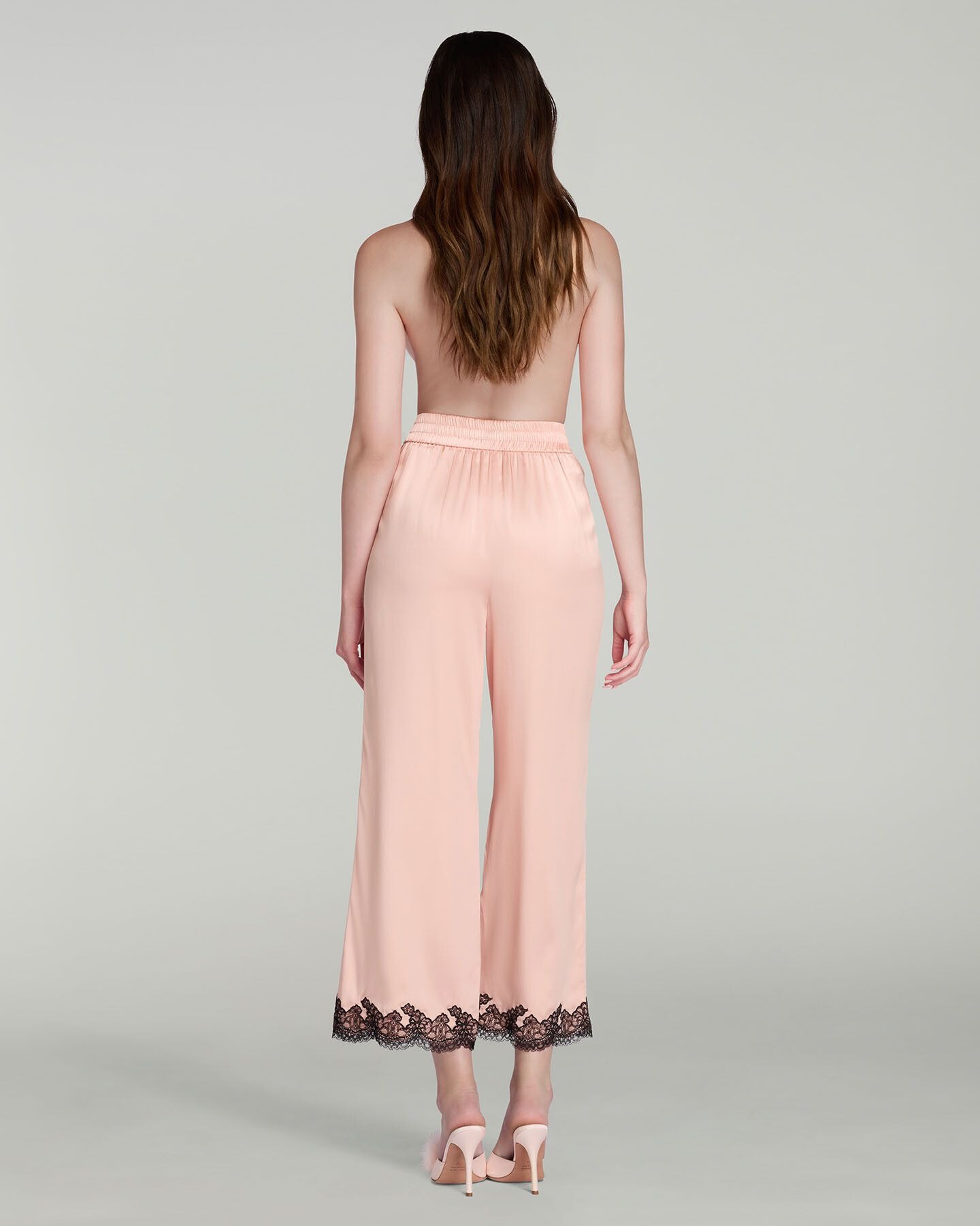 Укороченные домашние брюки Amelea выполнены из струящегося шелкового атласа. Бледно-розовый оттенок подчеркнут контрастным резным кружевом. Высокая посадка на талии фиксирована с помощью гладкого пояса спереди, оснащенного резинкой сзади.