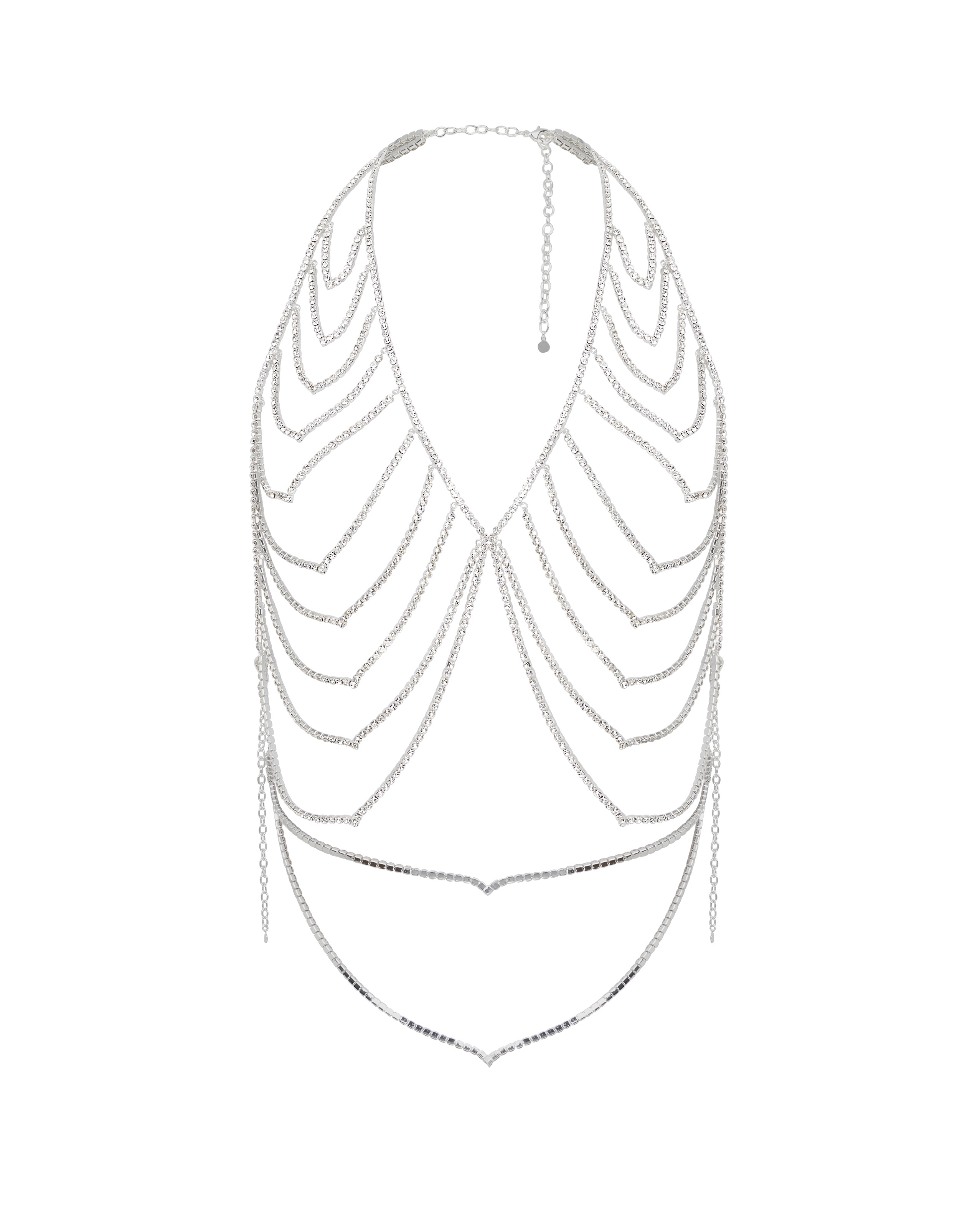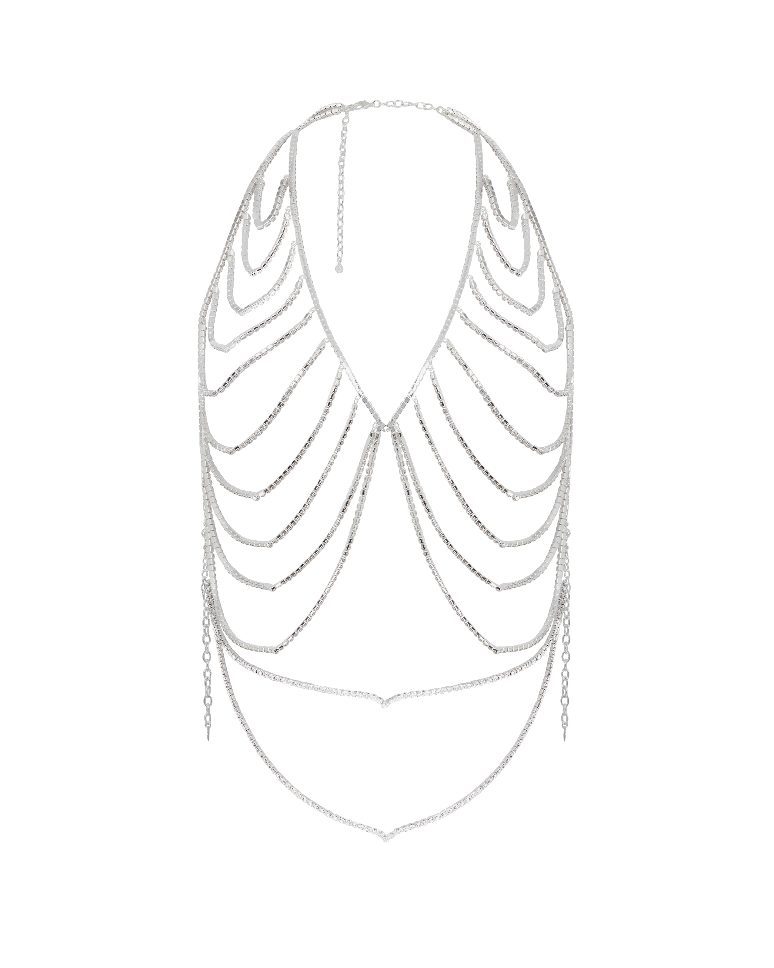 Жилет-цепочка Elliotte с серебристым покрытием и драпировкой цепочками, плавно обтекающими силуэт. Застежки регулируются на шее и по бокам. Носи его с нижним бельем, платьем или на голое тело.