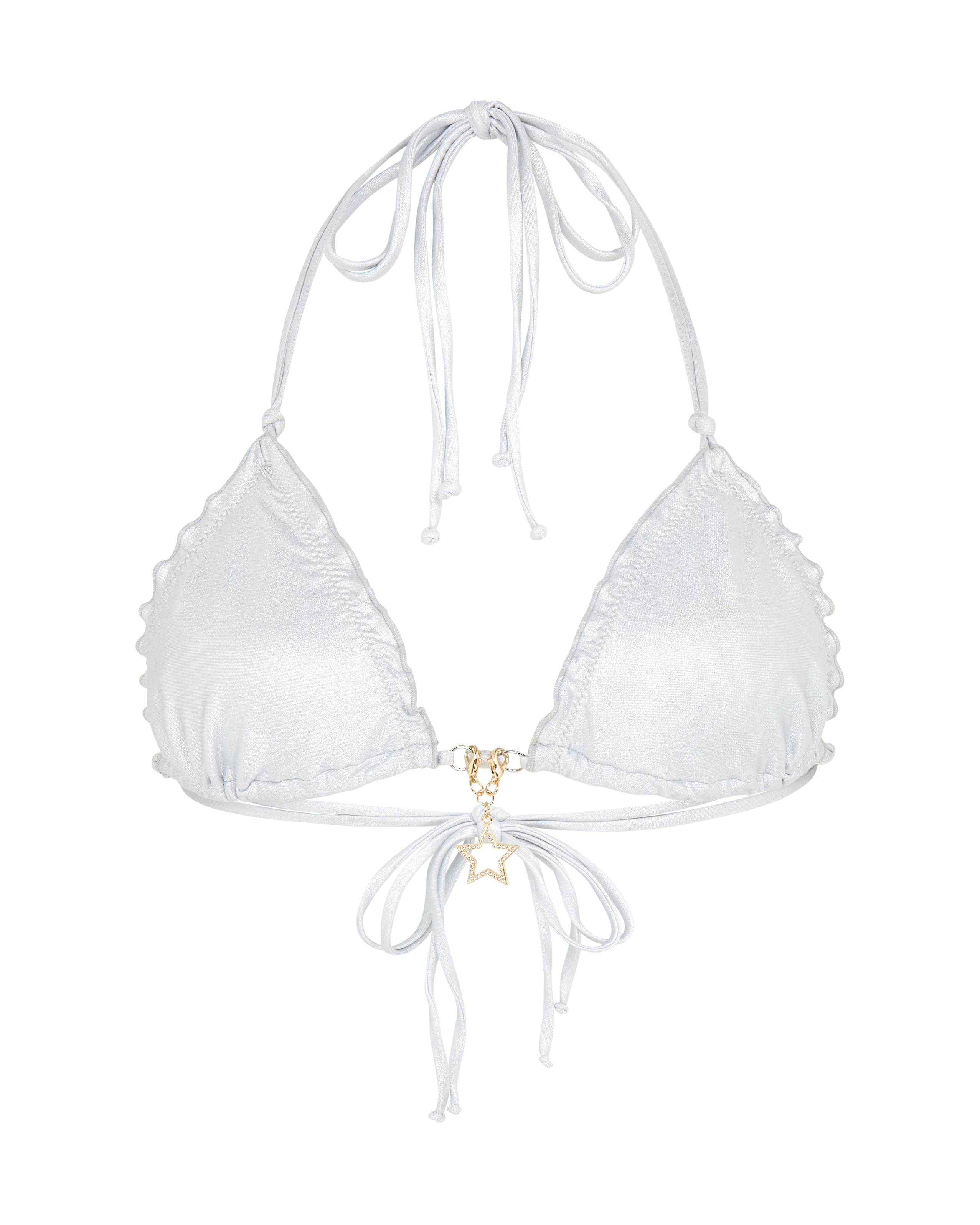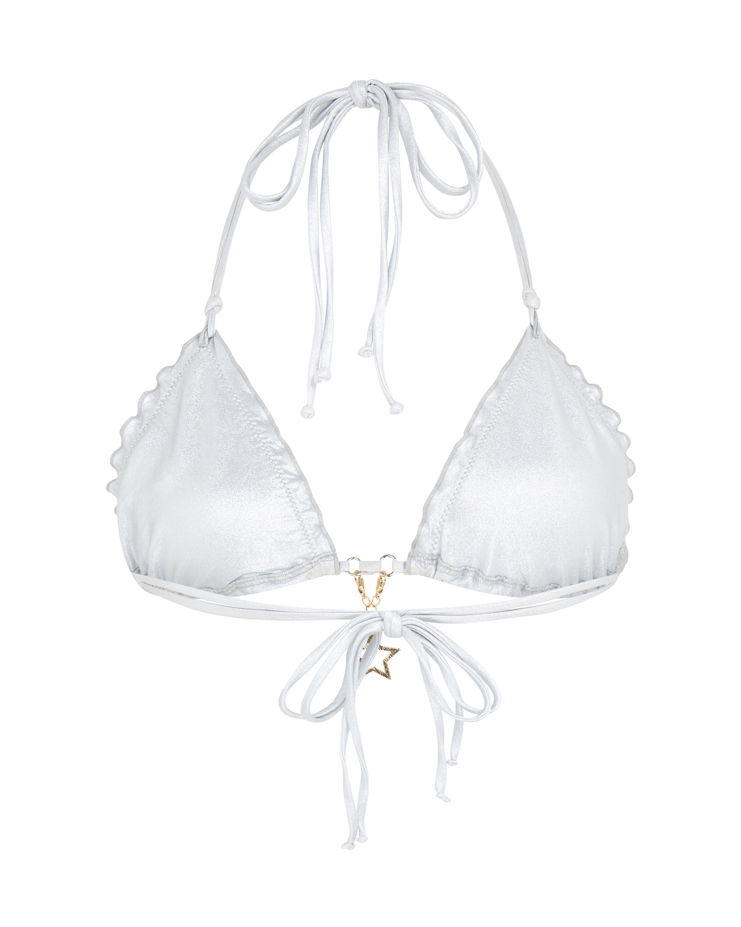 Топ купальника Berry с треугольными чашками и регулируемой сборкой подчеркивает грудь. Итальянская ткань с металлическим блеском и кристаллическая подвеска между чашками. Топ гармонично сочетается с плавками из этой же коллекции.