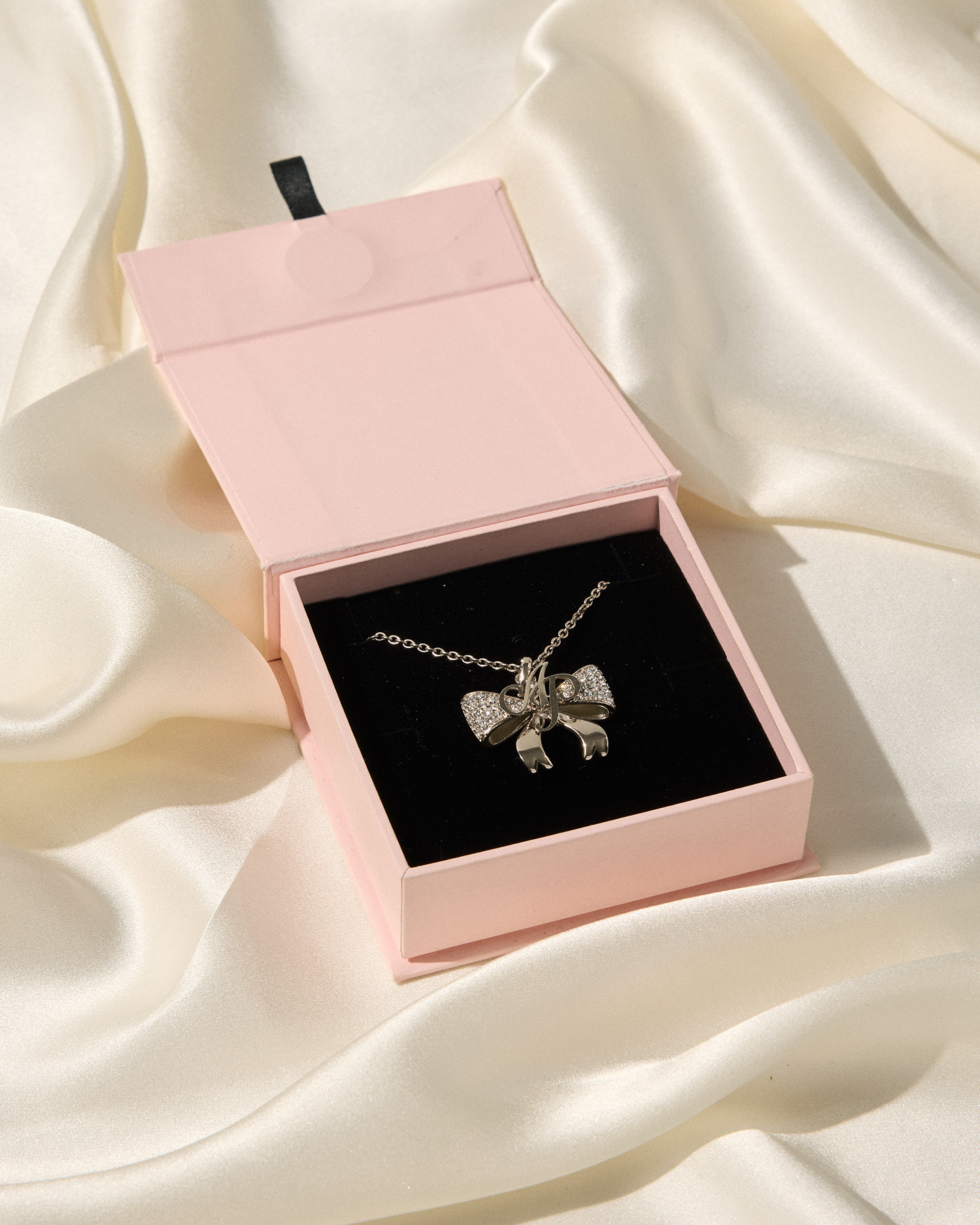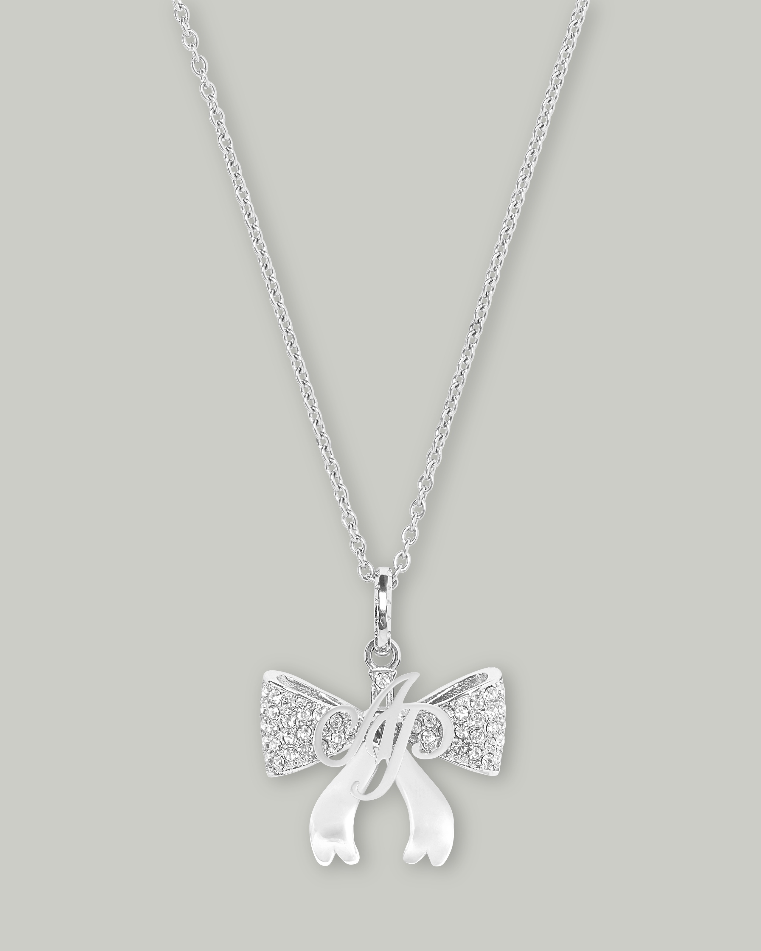 Серебристое ожерелье Brietta: подвеска с кристальным бантом и логотипом. Регулируемая цепочка, покрытие с добавлением настоящего золота.