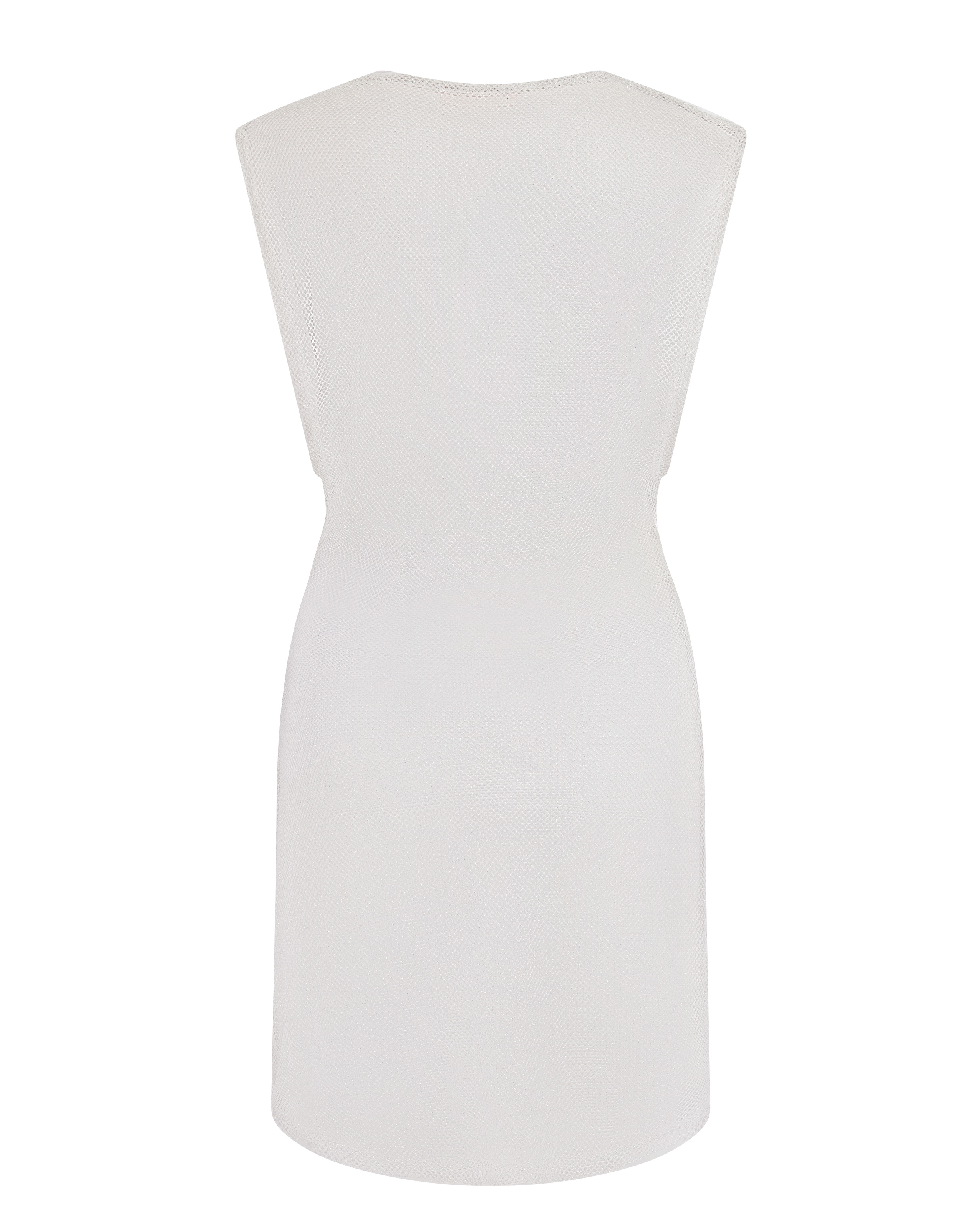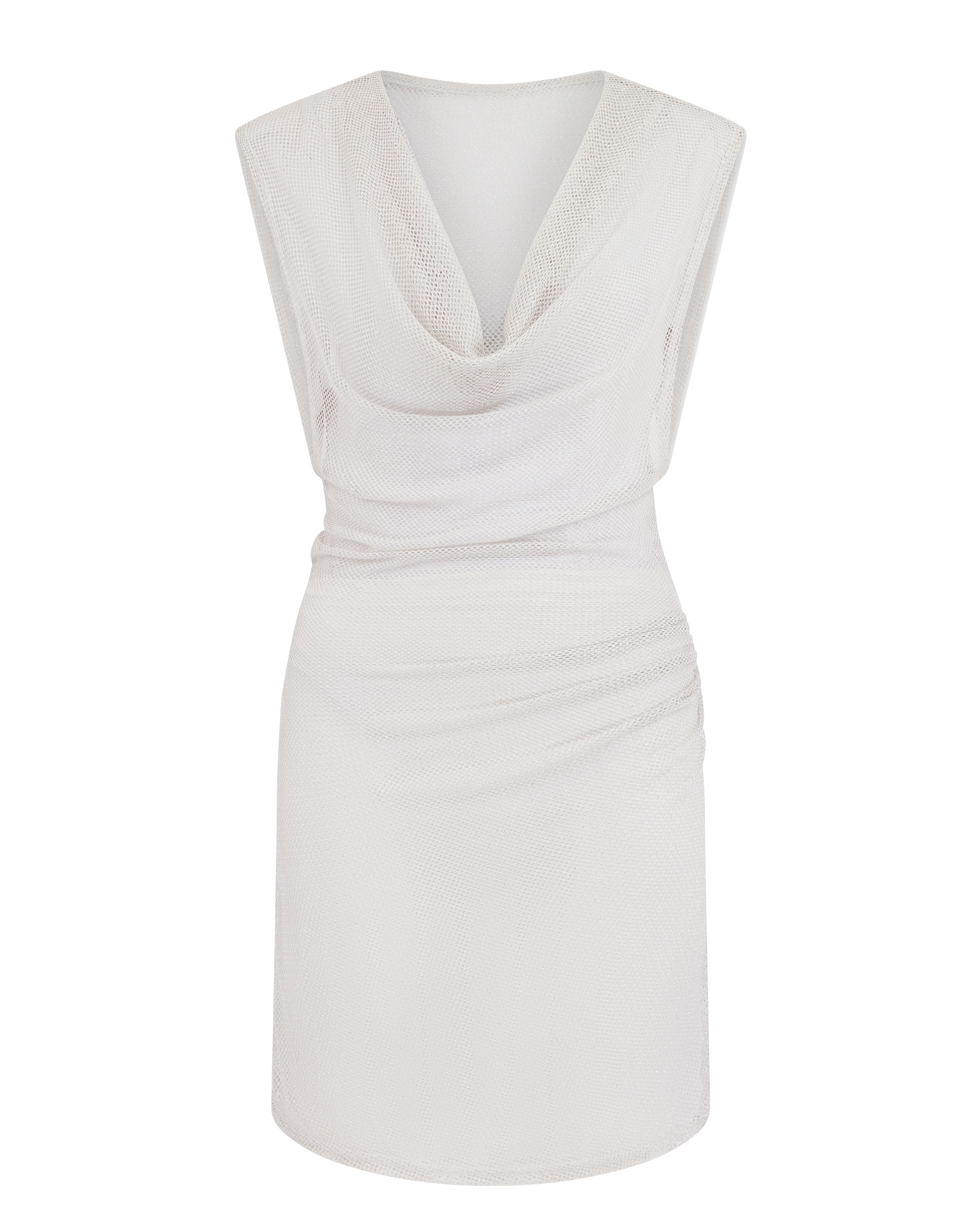 Пляжное платье Orina в холодном серебристом цвете сшито из легкой прозрачной сетки, украшенной мерцающими металлическими нитями. Асимметричная сборка с одного бока и провокационный разрез до бедра. Модель без застежек для мгновенного преображения. Добавьте ноту футуризма в свой образ с коллекцией Orina.
