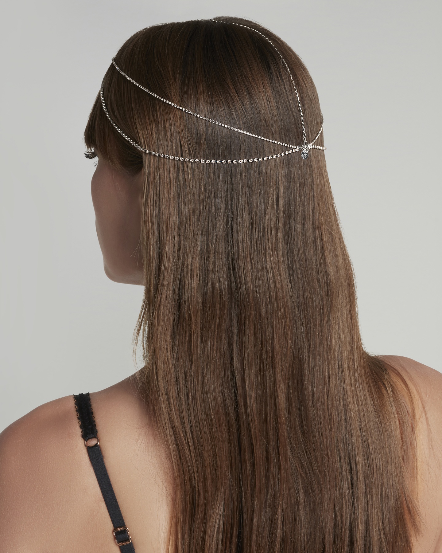 Серебристое украшение на голову Laynie украшено кристаллами персикового оттенка разного размера. Покрытие из настоящего серебра. Регулируемая застежка на затылке обеспечивает идеальную посадку. Сочетайте с цепочкой на тело и поясом Laynie для создания гламурного образа.