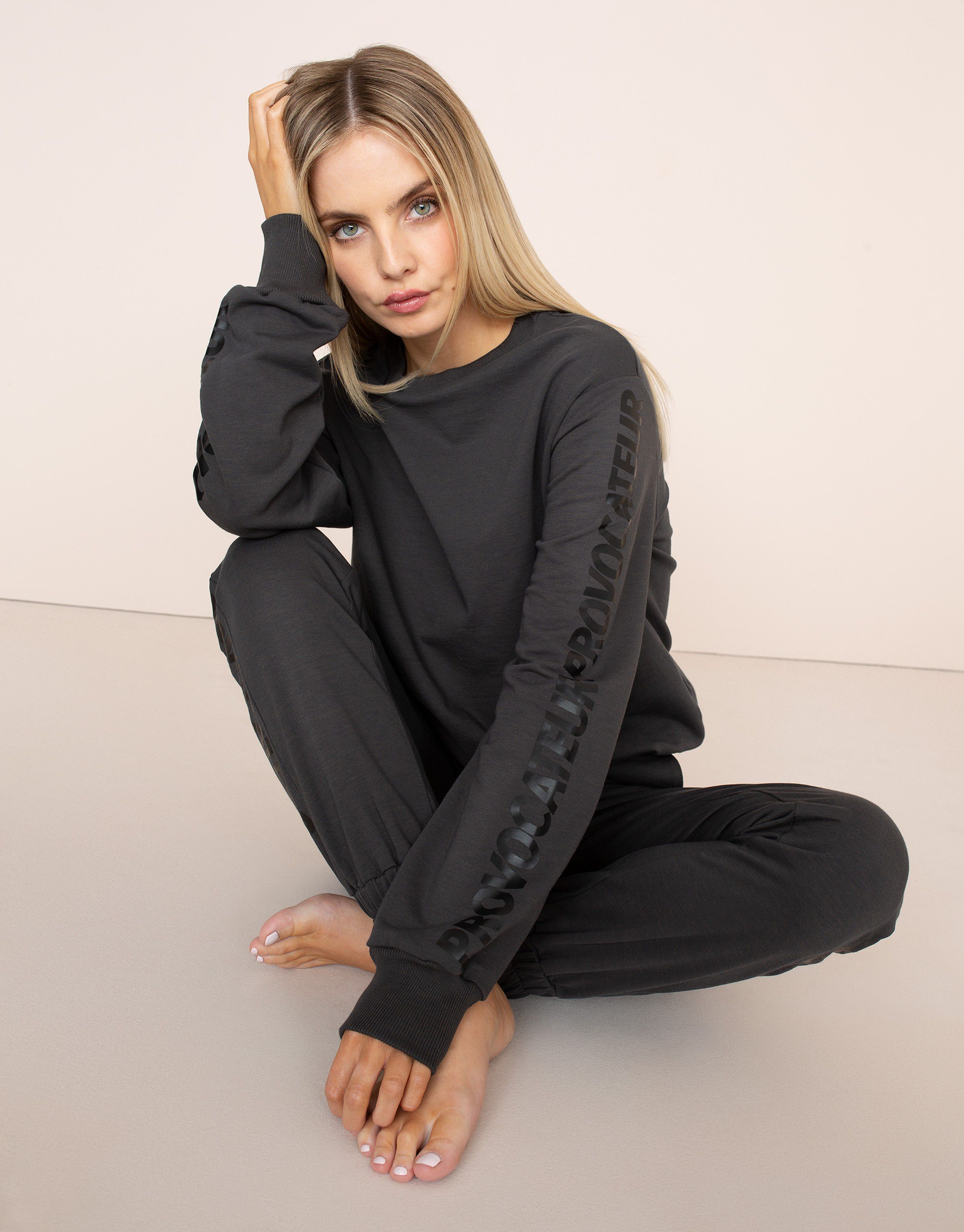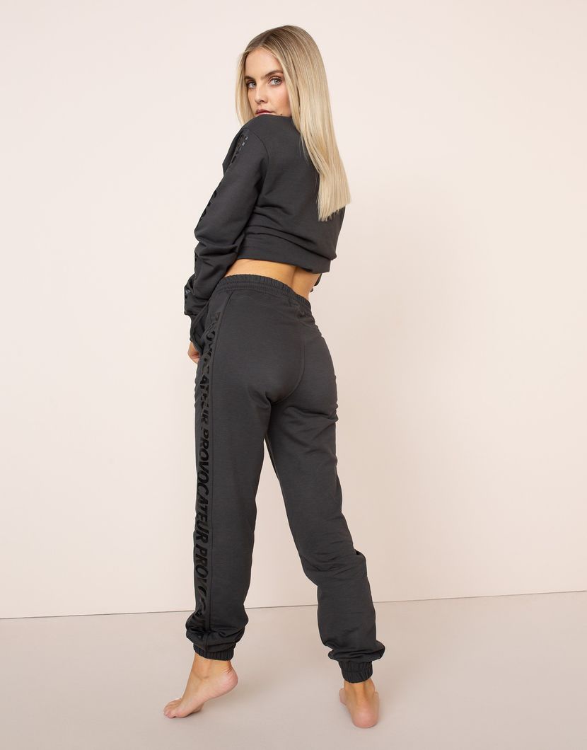 Джоггеры Logan из темно-серого хлопкового трикотажа. Оттенок графита подчеркнут черным логотипом, напечатанном на лампасах. Черный шнурок, продетый в кулиску на поясе, дополняет общее стилистическое решение. Карманы в боковых швах, эластичные манжеты и свободный крой. Дополните идеальный домашний комплект свитшотом из коллекции Logan.