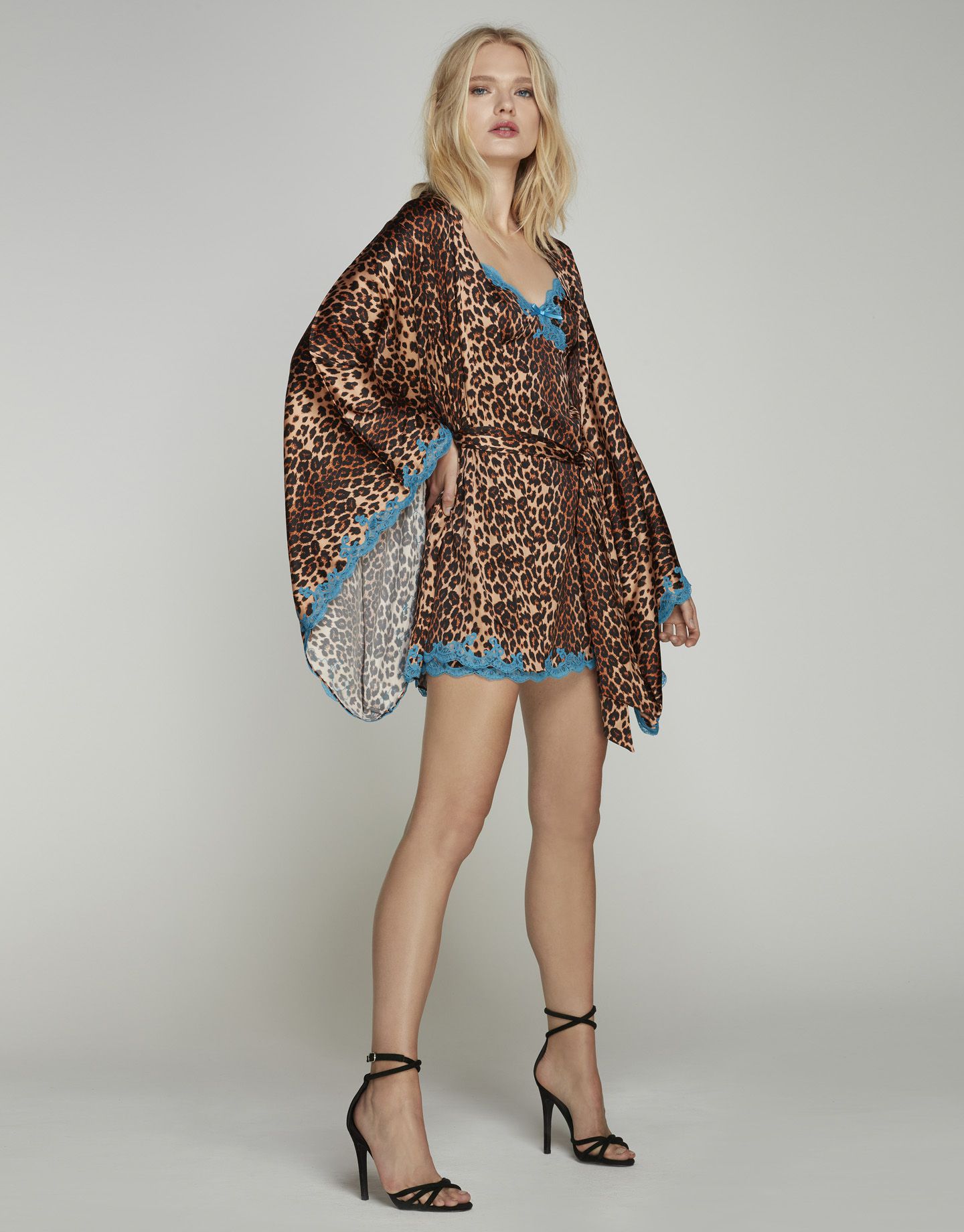 Одна из культовых моделей бренда - комбинация Molly выполнена из эластичного шелка с леопардовым принтом. Треугольные чашечки с вытачками и отрезом под грудью обеспечиваю мягкую поддержку. Окантовка ярко-голубым французским кружевом - реверанс эпохе 80-х, когда сексуальность граничила с экстравагантностью. Дополните домашний образ халатом-кимоно из этой же коллекции.