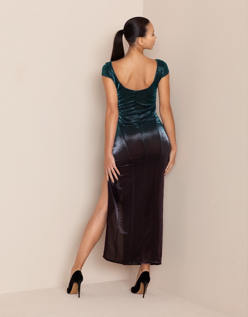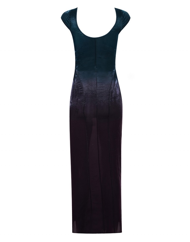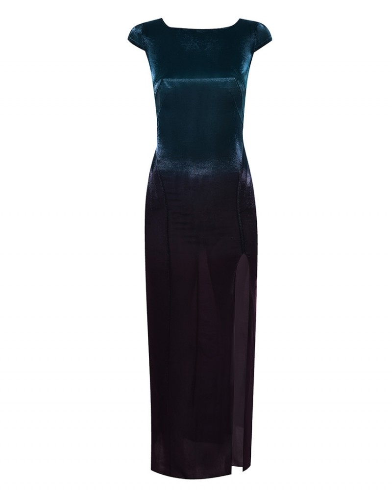 Модель выполнена из мерцающей светоотражающей фактуры. Благодаря эффекту омбре благородный сине-зеленый оттенок плавно переходит в темно-серый. Облегающий силуэт дополнен короткими рукавами и глубоким разрезом.