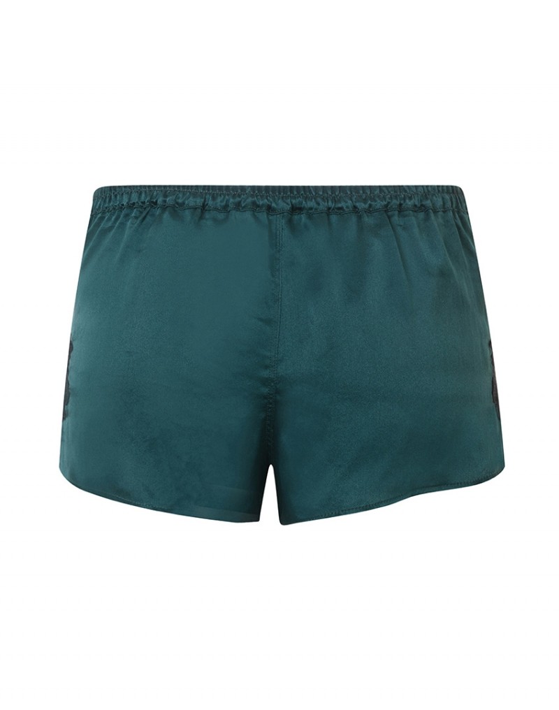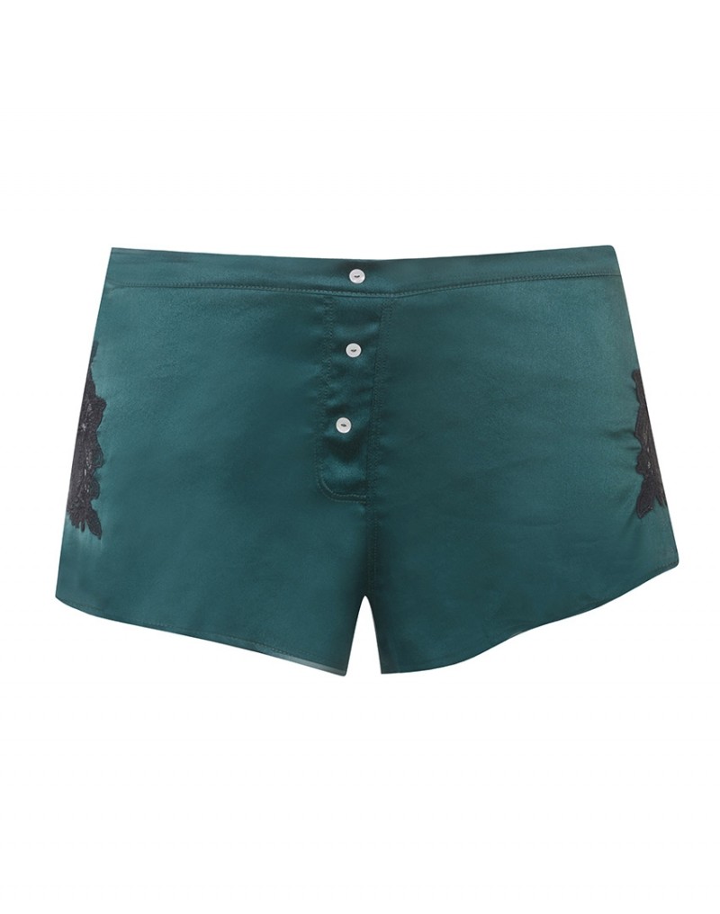 Шортики выполнены из шелка насыщенного изумрудного оттенка, украшены черным кружевом на бедрах и тремя декоративными пуговицами.