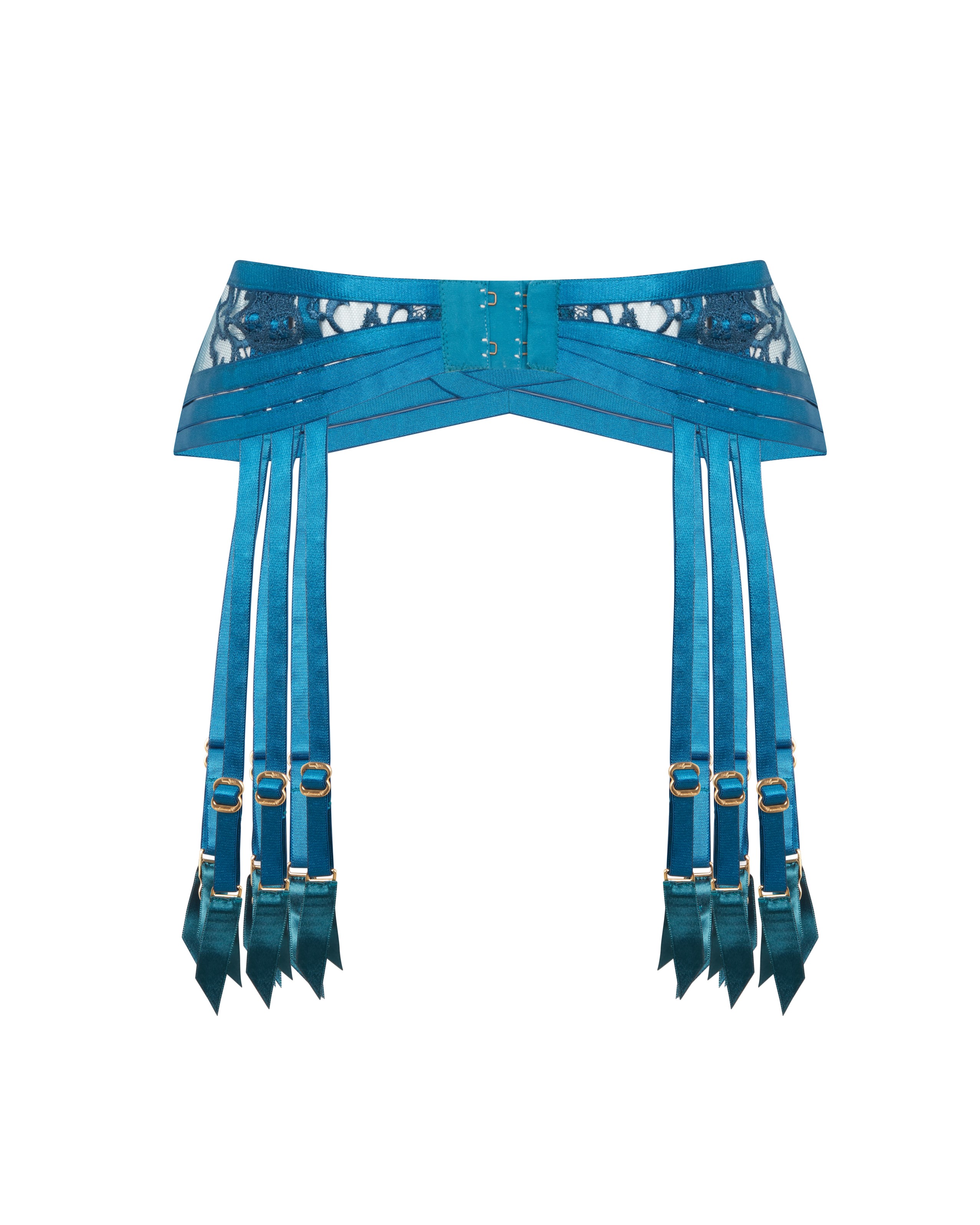 Пояс для чулок Dioni сине-зеленого цвета с швейцарской лазерной вышивкой и мерцающей подвеской с кристаллом Preciosa® по центру. Шесть подвязок с позолоченной фурнитурой завершают этот аксессуар, созданный приковывать внимание — особенно в паре с полным комплектом Dioni.