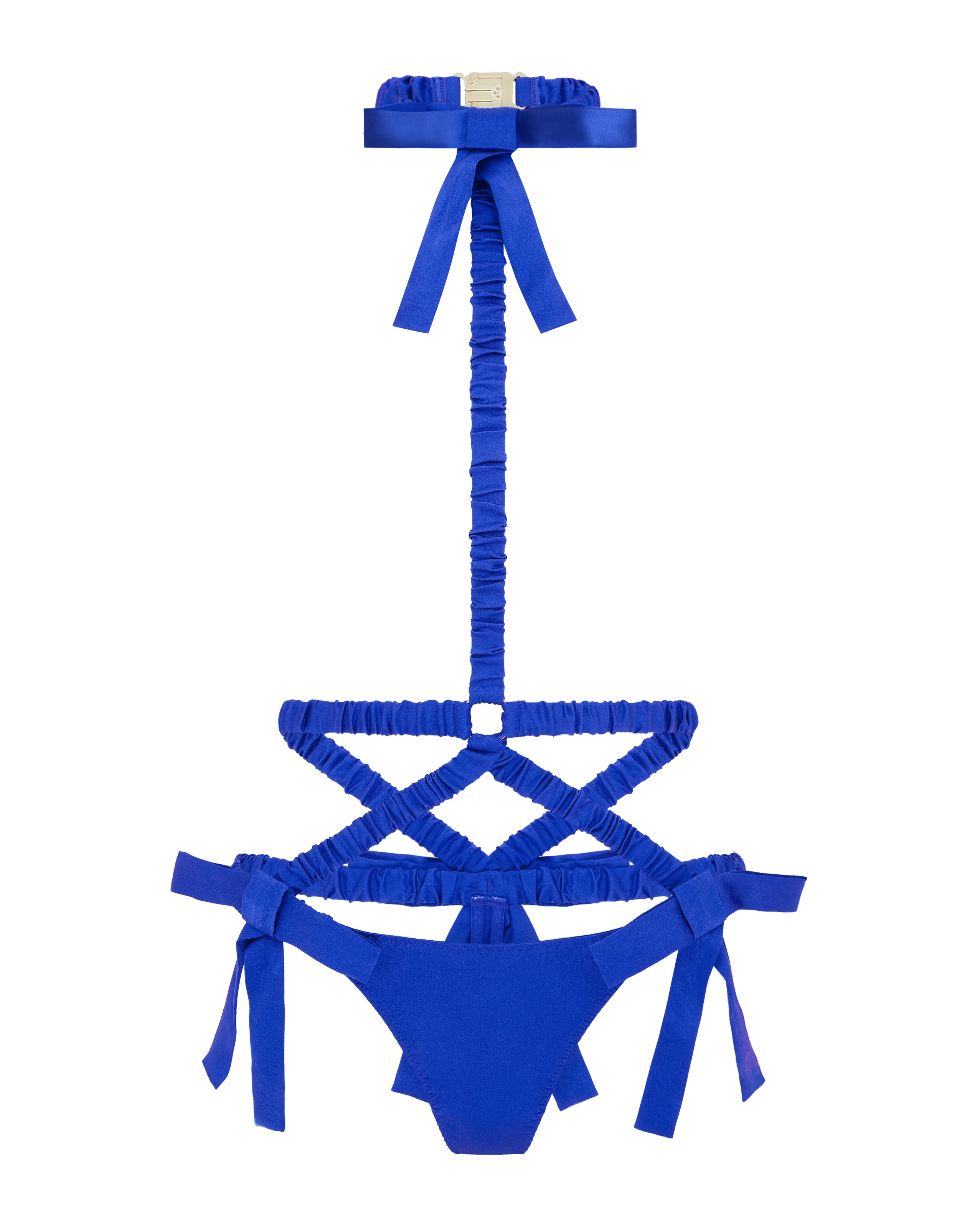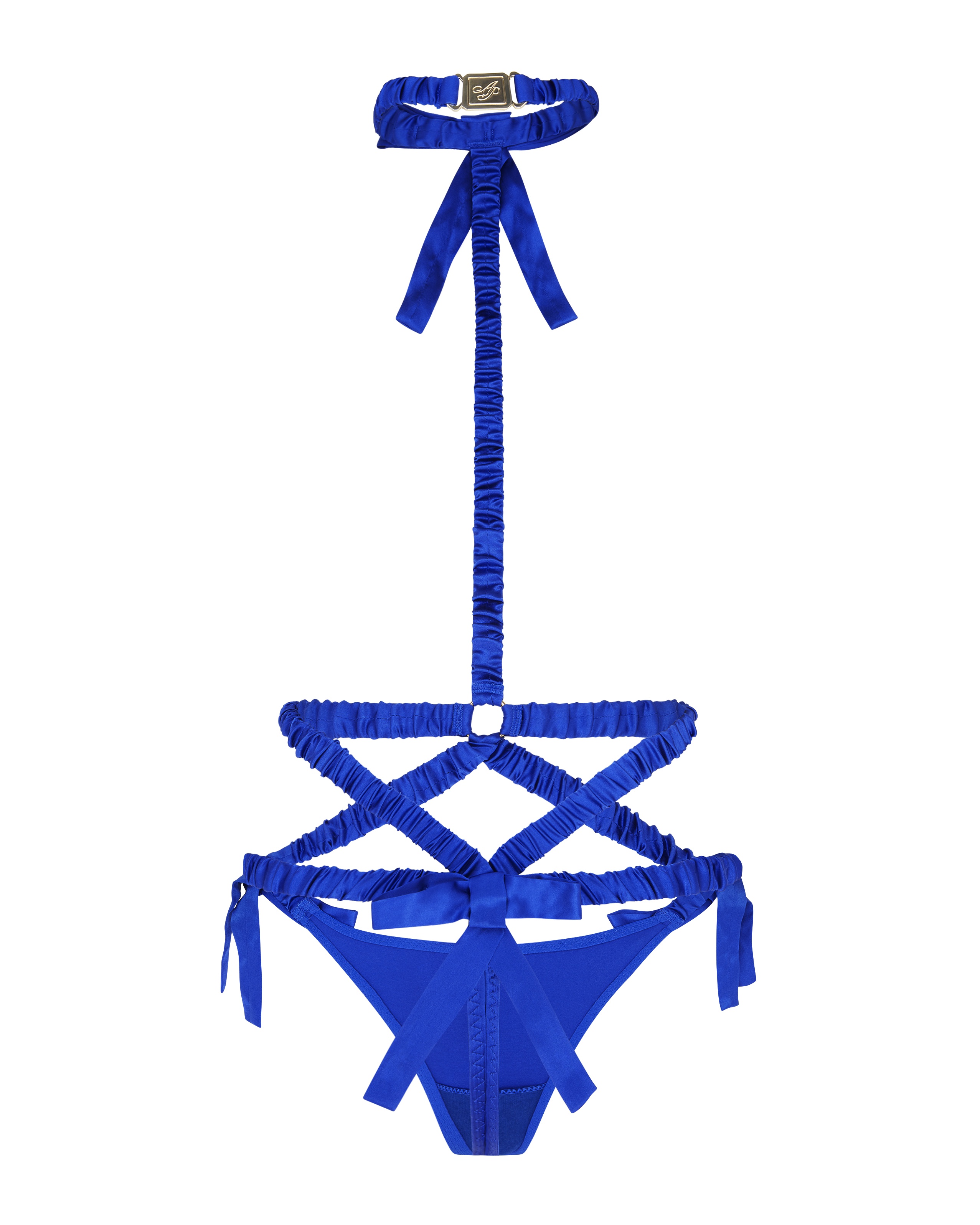 Синее боди Birthday выполнено из шелковых ремешков, подчеркивающих фигуру. Большие банты украшают шею и бедра. Встроенные трусики обеспечивают комфорт при носке. Дополните образ любимыми накладками AP для завершения образа.