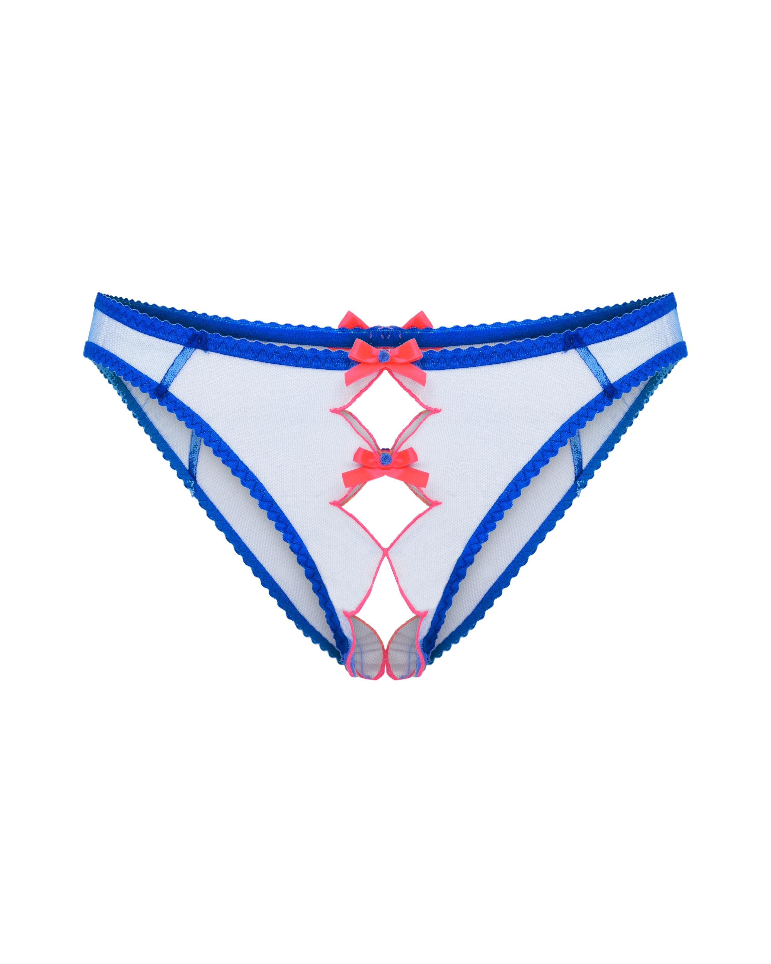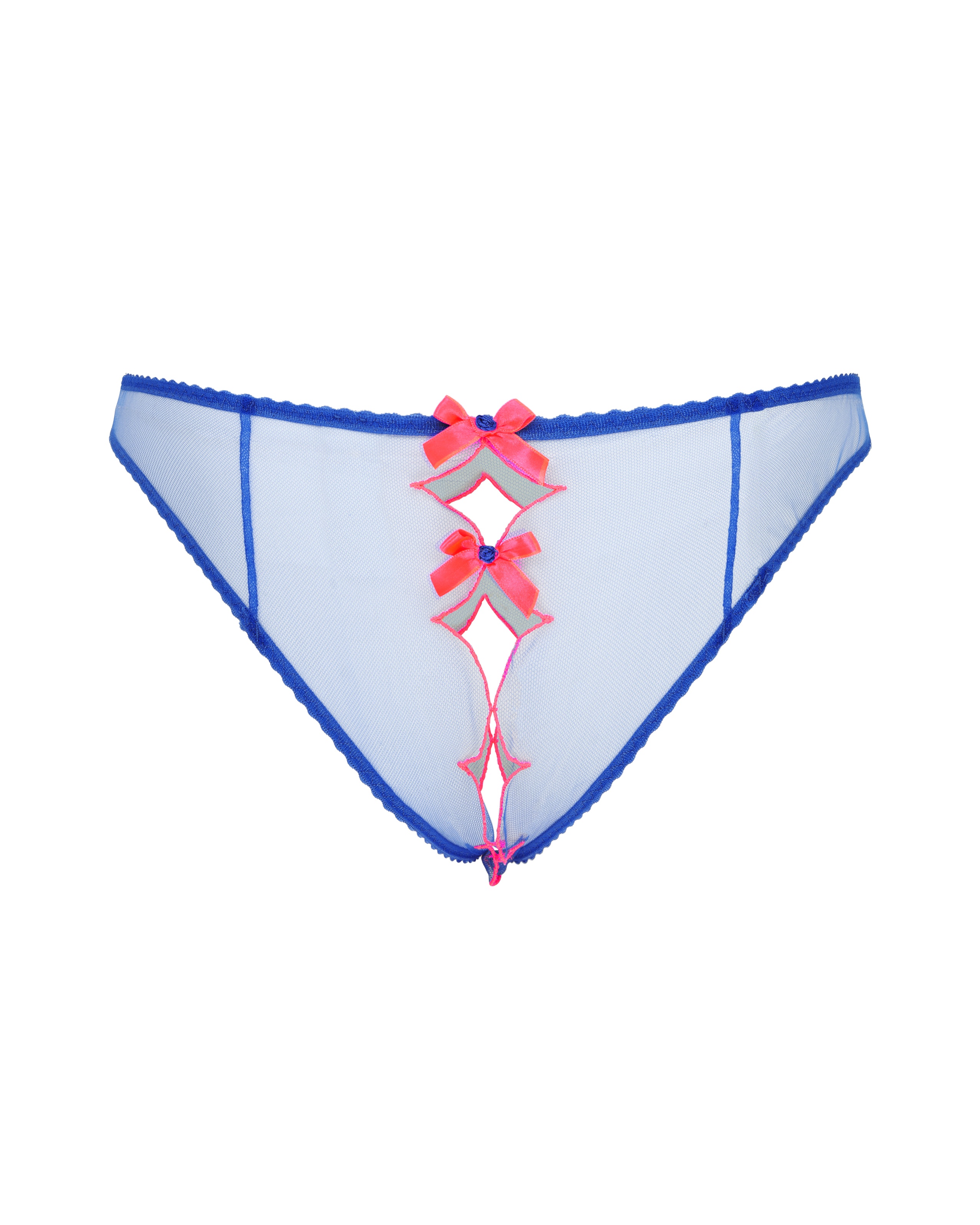 Французские трусы Lorna синего цвета с прозрачной основой из тюля и швейцарской вышивкой в неоново-розовом цвете по краям. Открытая ластовица добавляет пикантности, а роскошные французские швы и атласные банты с маленькими розочками завершают изысканный вид. Сочетайте с другими элементами коллекции Lorna для создания яркого и привлекательного образа.