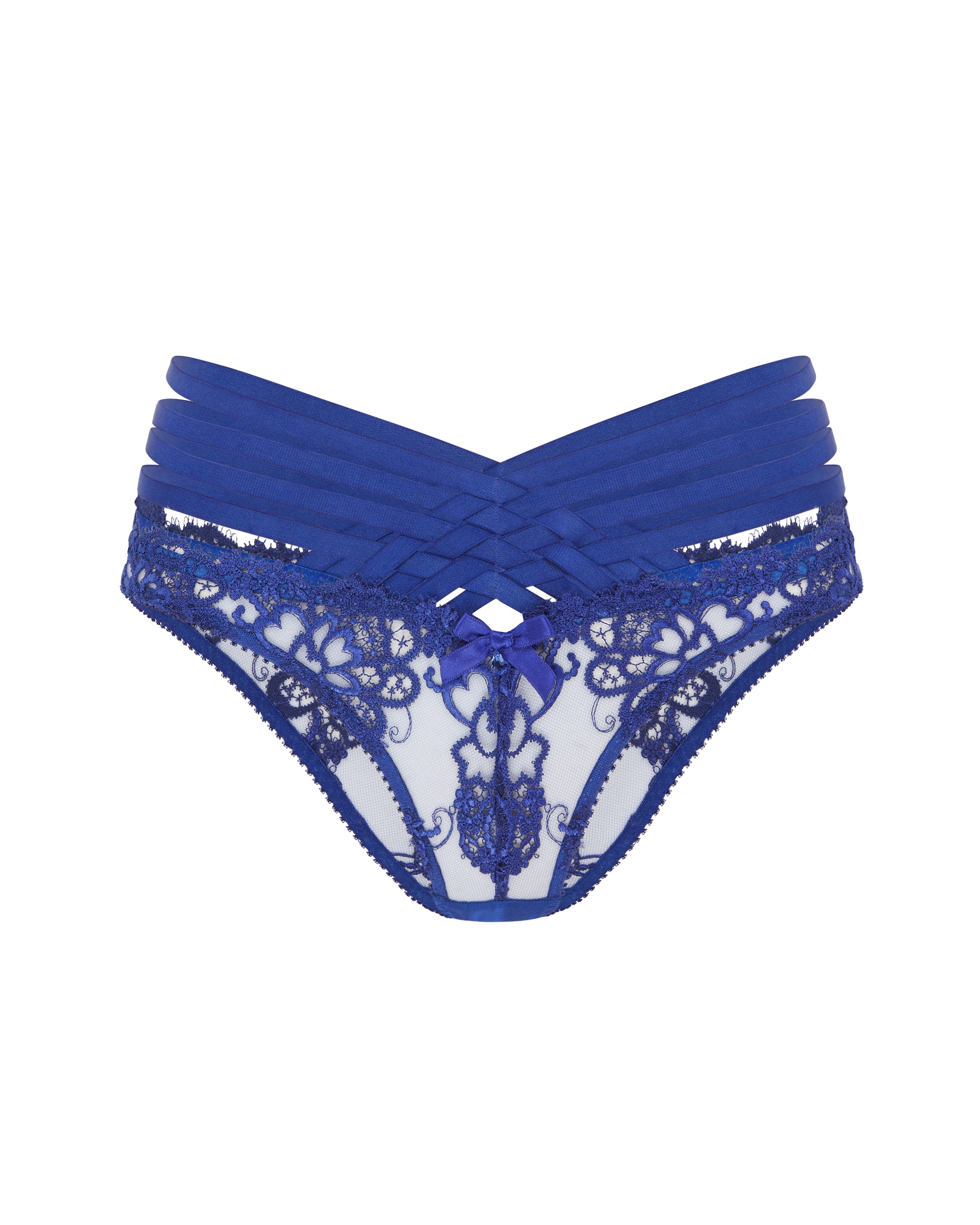 Синие классические трусы Dioni с изысканной швейцарской лазерной вышивкой гипюром. Детали из ремешков создают плетеный узор вокруг талии и спины, а финальные штрихи – атласный бант и капелька из кристалла Swarovski®. Носите с остальными изделиями из коллекции Dioni для создания привлекательного образа.