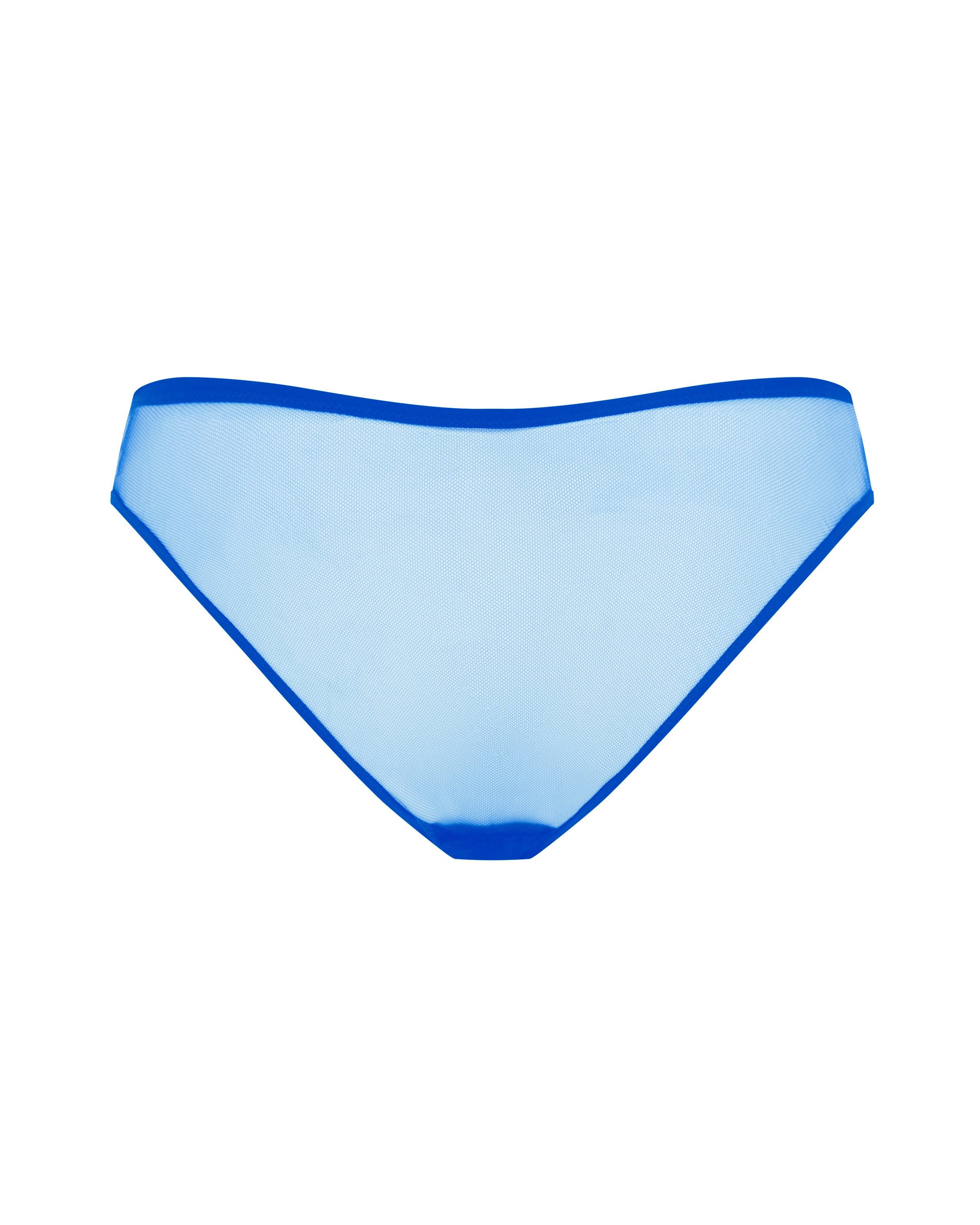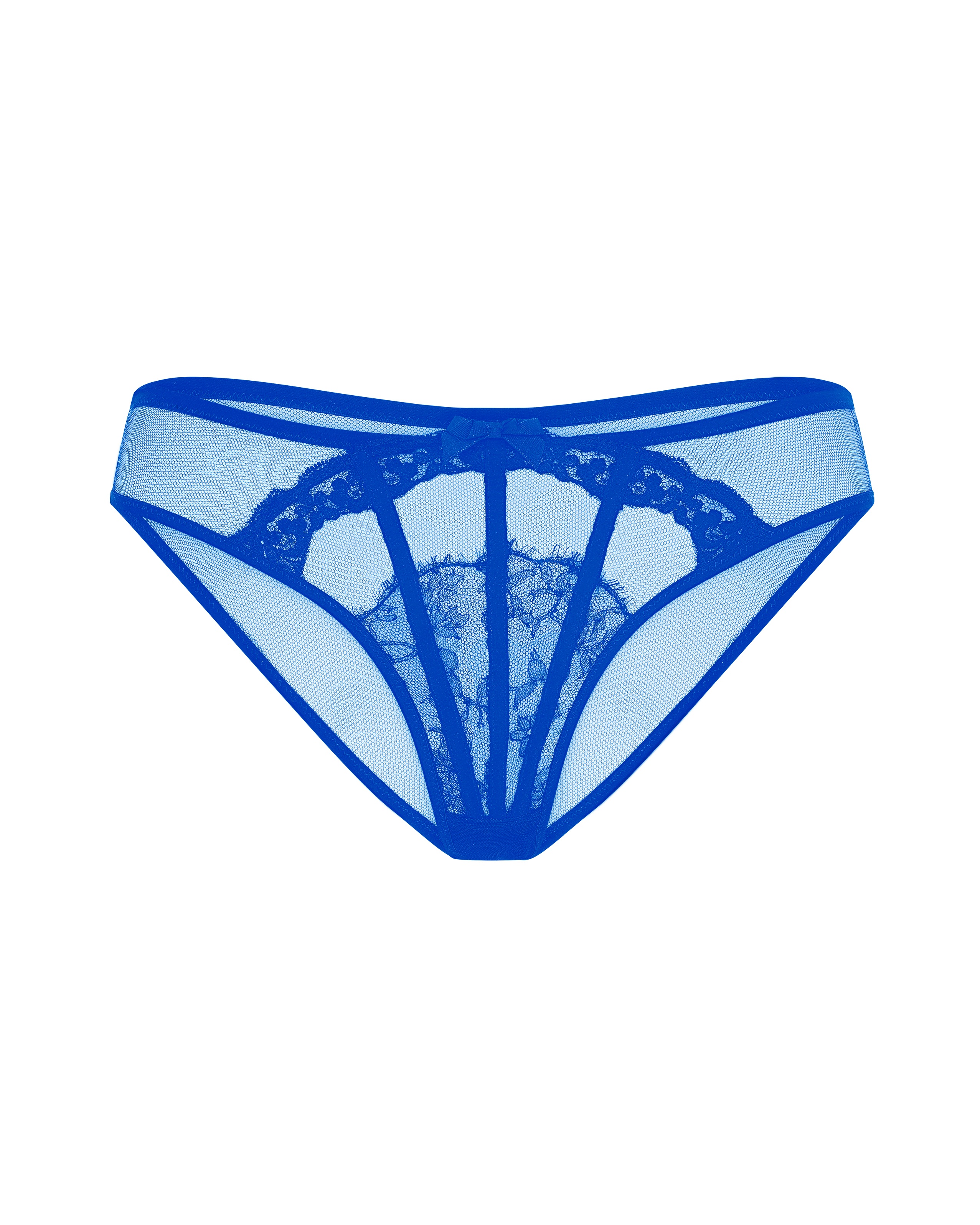 Классическая модель трусов Mariann в кобальтовом цвете. Легкий итальянский тюль, изящное кружево и декоративные банты из тафты — сочетание традиционного кроя с изысканной отделкой.