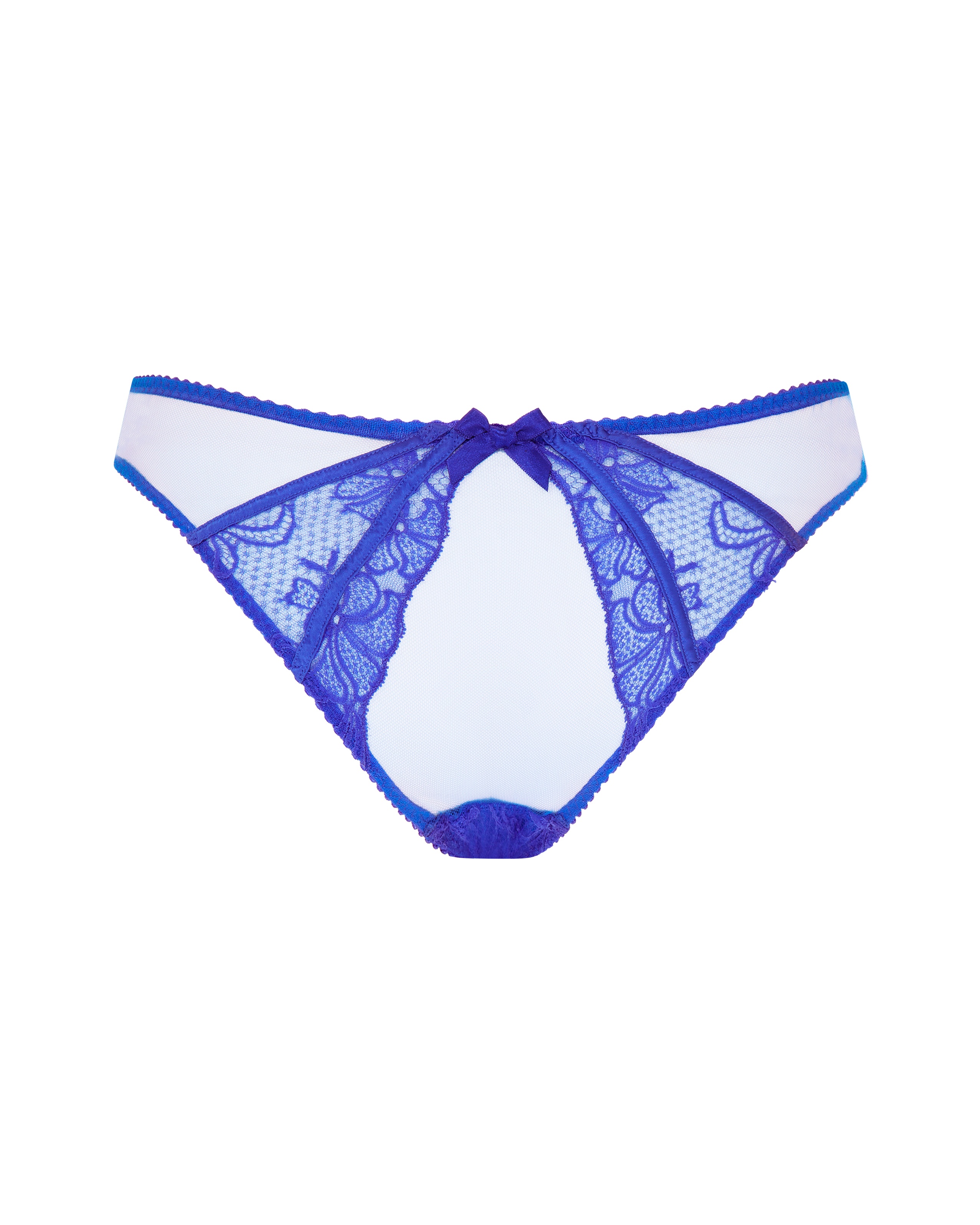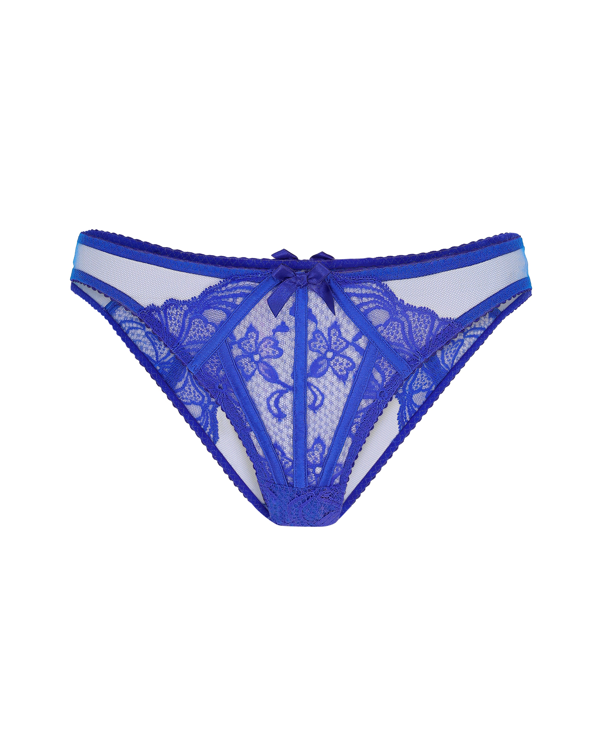 Синие классические трусы Rozlyn из прозрачного тюля с кружевной вставкой спереди и шелковыми швами. Украшением служит атласный бантик в центре.
