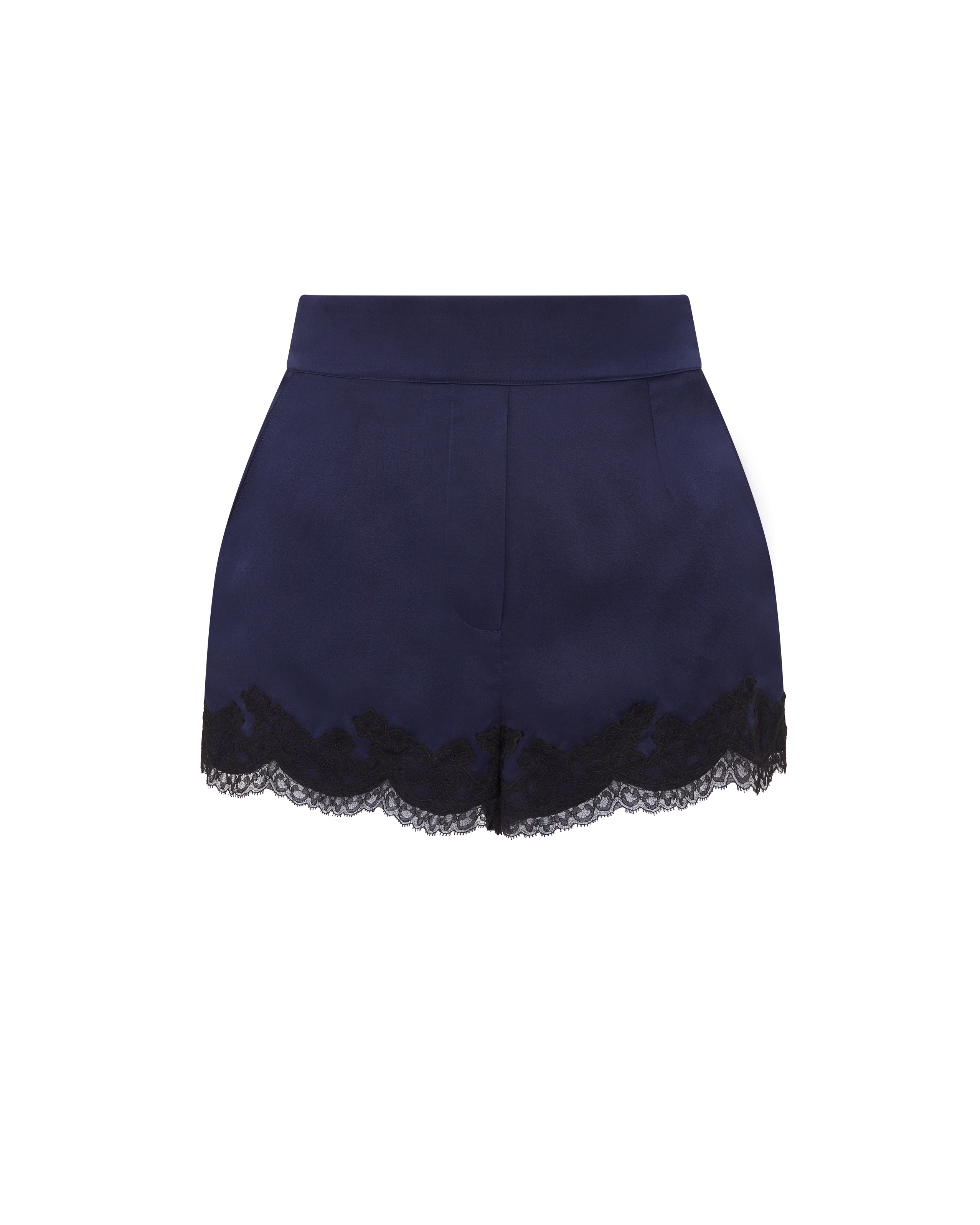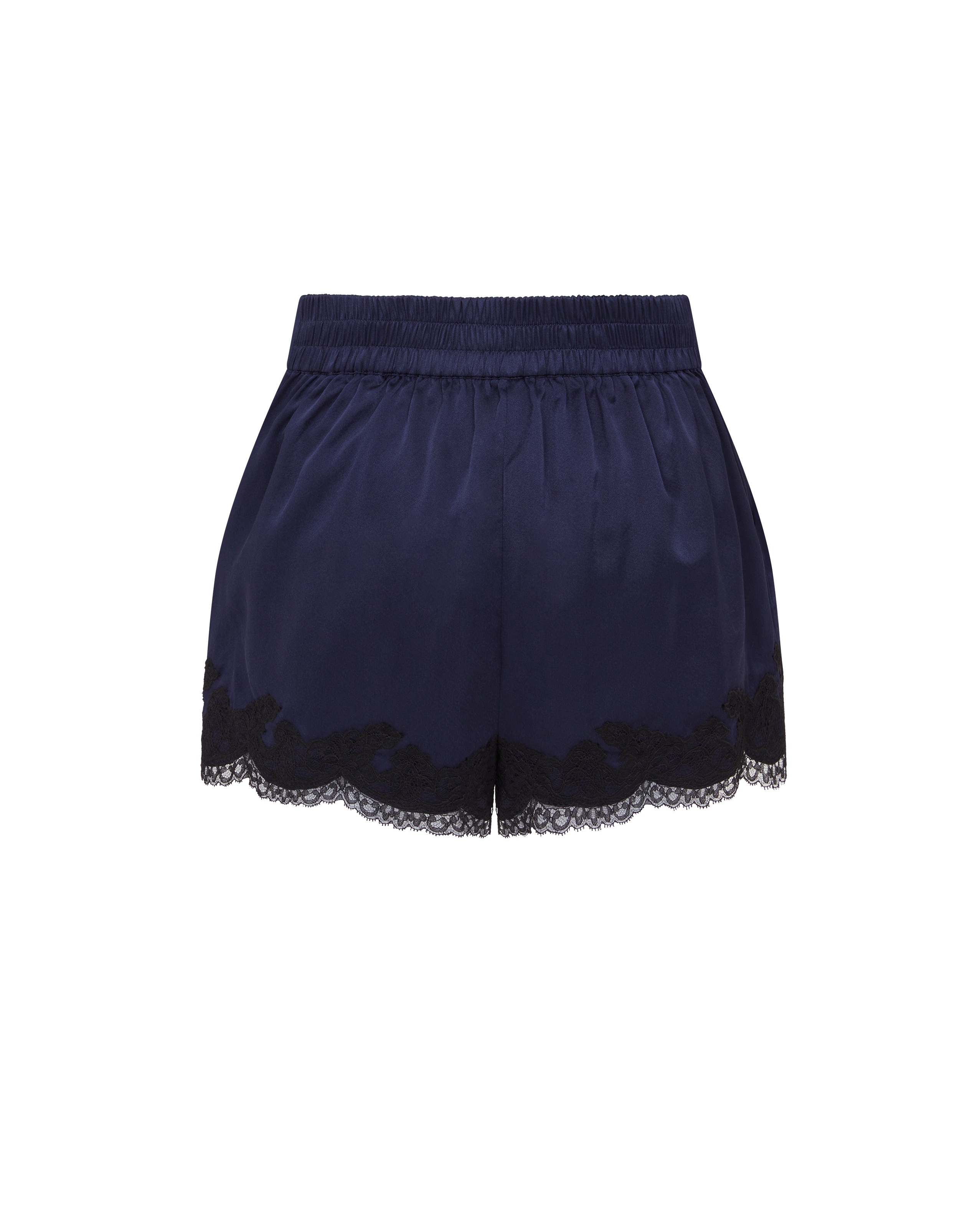 Шорты Amelea из эластичного шелкового атласа в темно-синем цвете украшены кружевом Leavers. Мягкий пояс создает ощущение легкости и уюта.