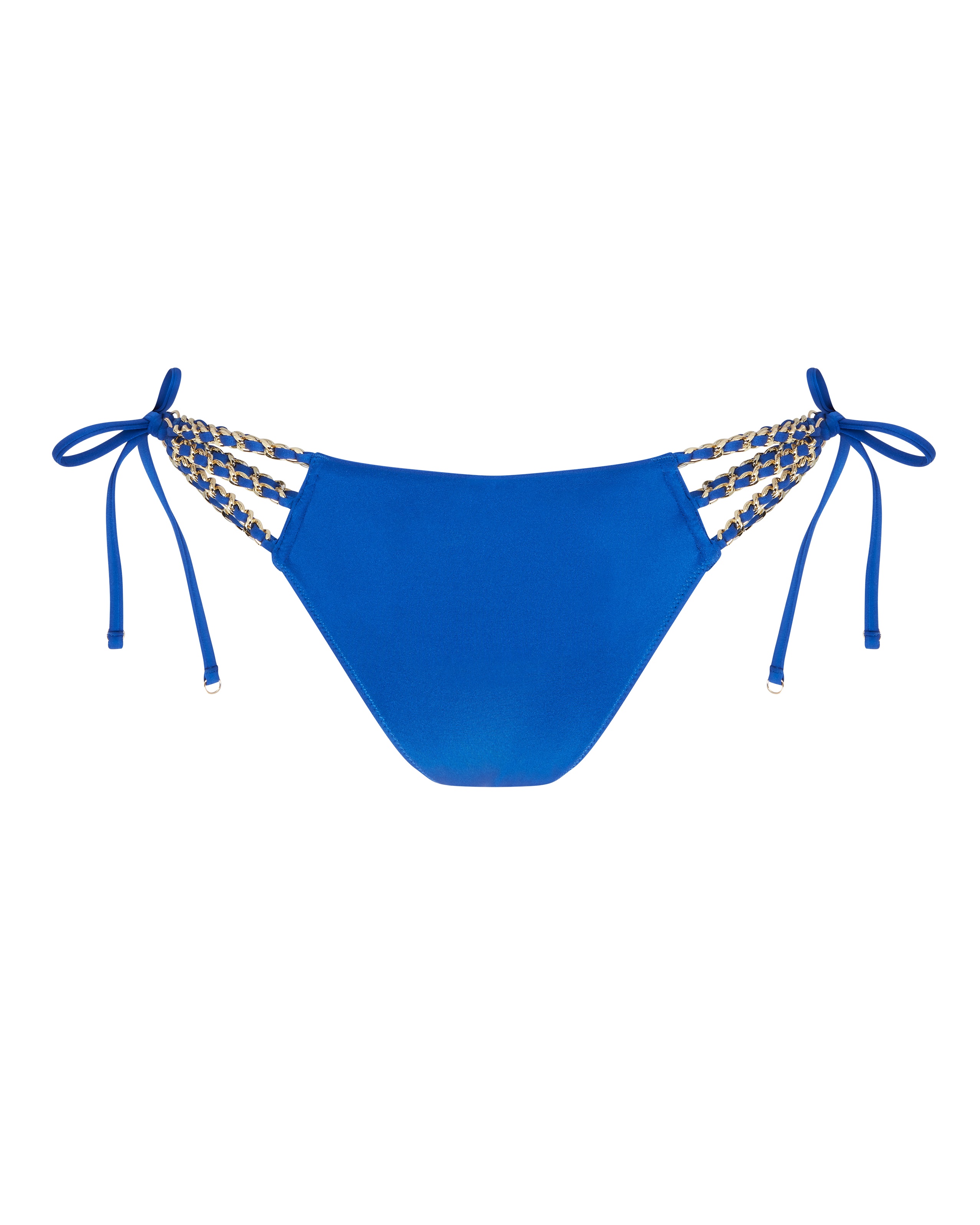 Плавки купальника Montie синего цвета с завязками по бокам для регулировки и стиля лоу-райз. Сшиты из роскошной итальянской купальной ткани. Идеально завершат ваш пляжный образ в паре с топом Montie.