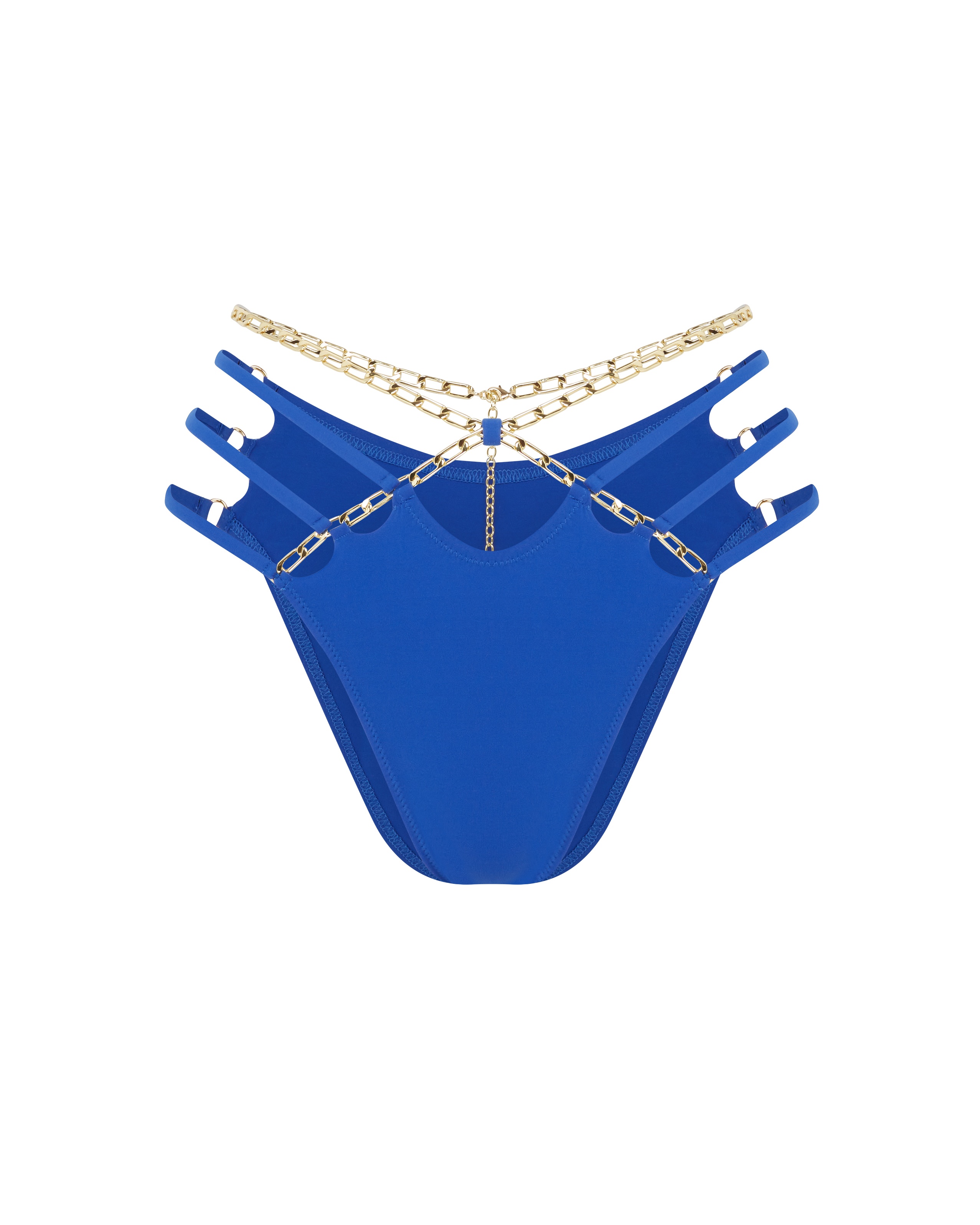 Плавки-бикини Tazzie синего цвета с высокой талией и фигурными вырезами на бедрах выполнены из итальянской купальной ткани. Деталь из позолоченной цепочки с термо- и водостойким покрытием. Сочетайте с соответствующим топом Tazzie для завершения образа.
