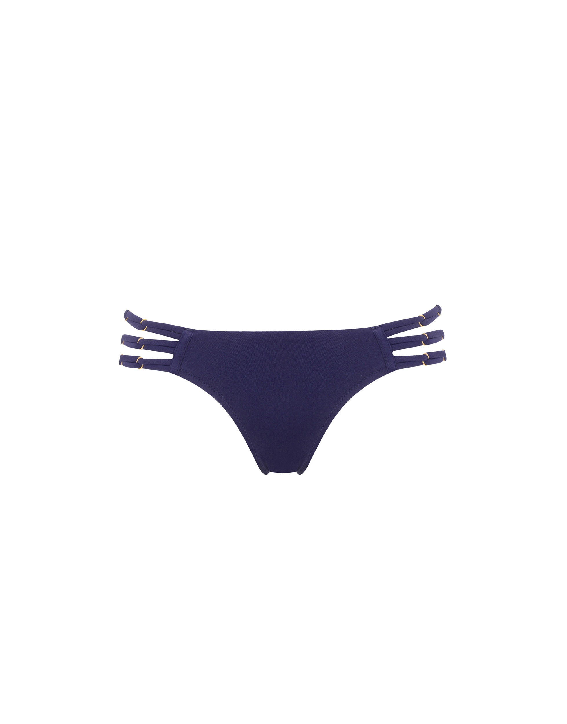 Плавки c заниженной талией представлены в благородном темно-синем оттенке. Ремешки, украшенные золотыми кольцами, формируют изящные вырезы по бокам.