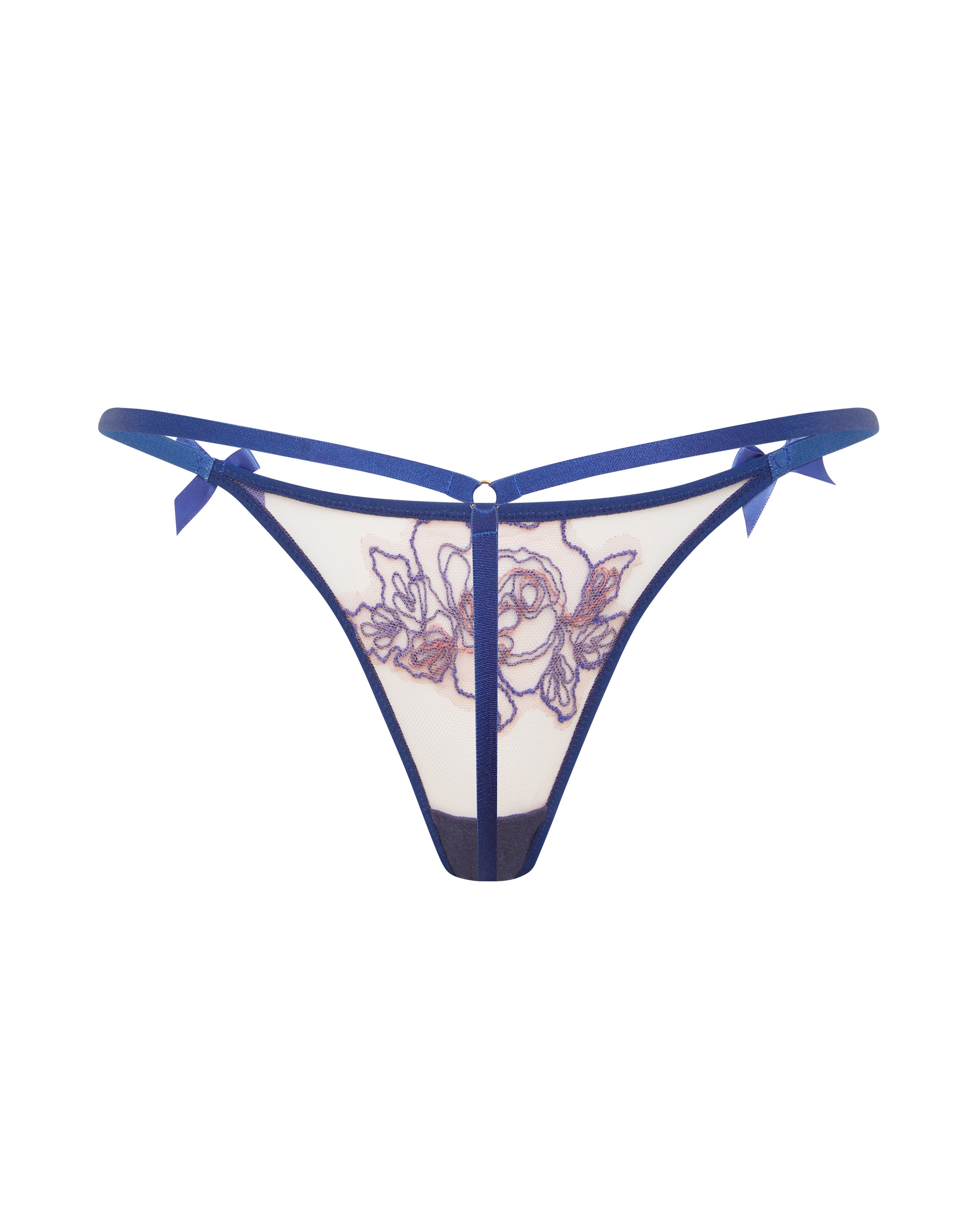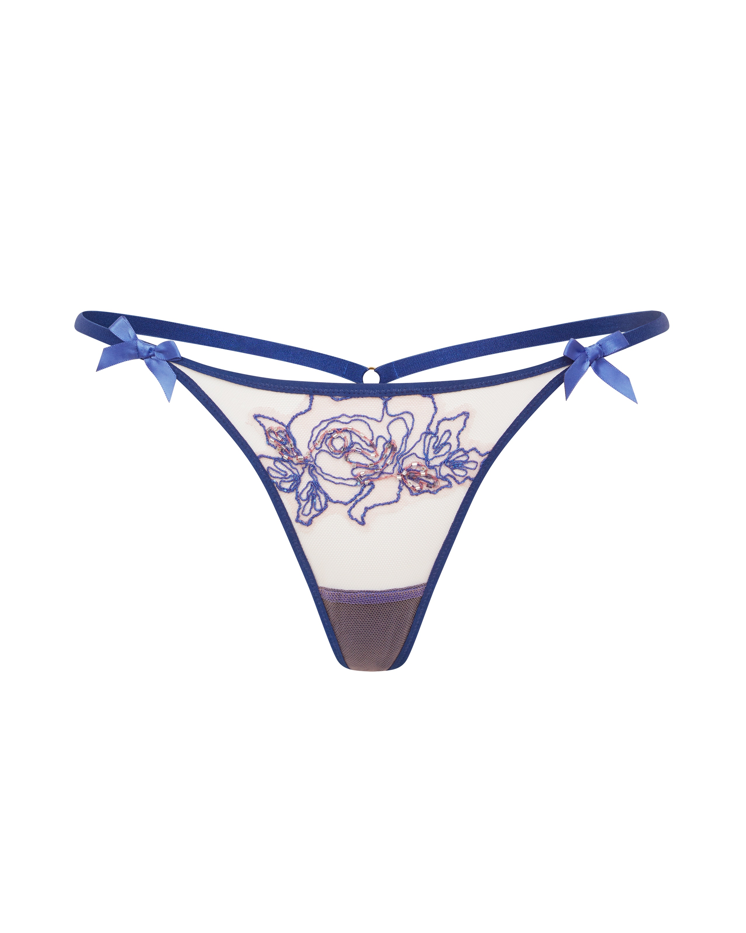 Трусы стринги Lindie сине-розового цвета с низкой посадкой из тонкого итальянского тюля. Украшены ручной цветочной вышивкой с использованием эксклюзивного для AP бисера банджо. Объедините с коллекцией Lindie для создания завораживающего образа.