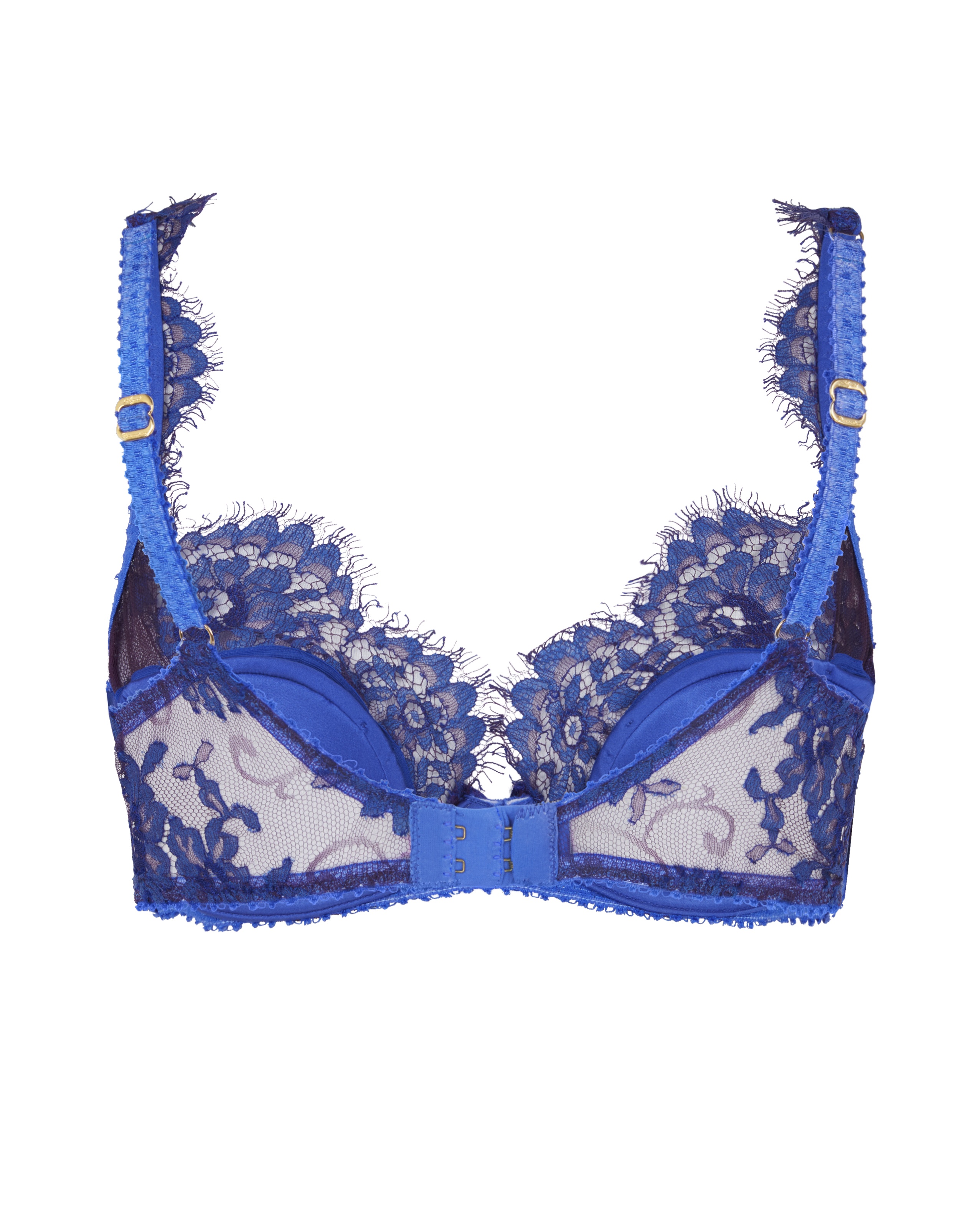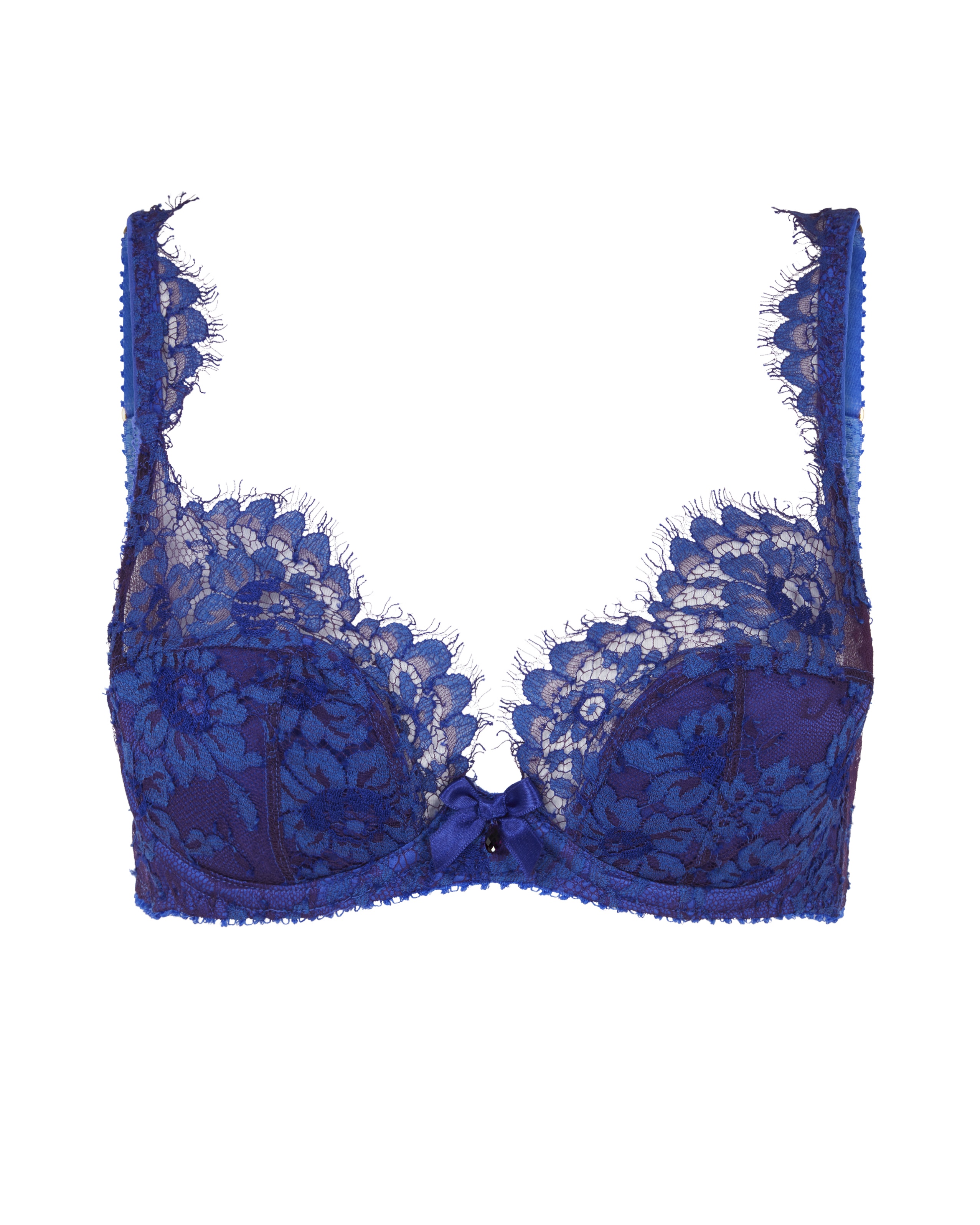 Бюстгальтер Carline глубокого кобальтового оттенка с косточками и глубоким вырезом: чашки из шелкового атласа покрыты цветочным французским кружевом Leavers. Атласный бант со стразом Swarovski®, позолоченная фурнитура, ажурный рубчик по краю и застежка-крючок сзади обеспечивают роскошный вид. Носите с другими предметами Carline для гламурного образа.