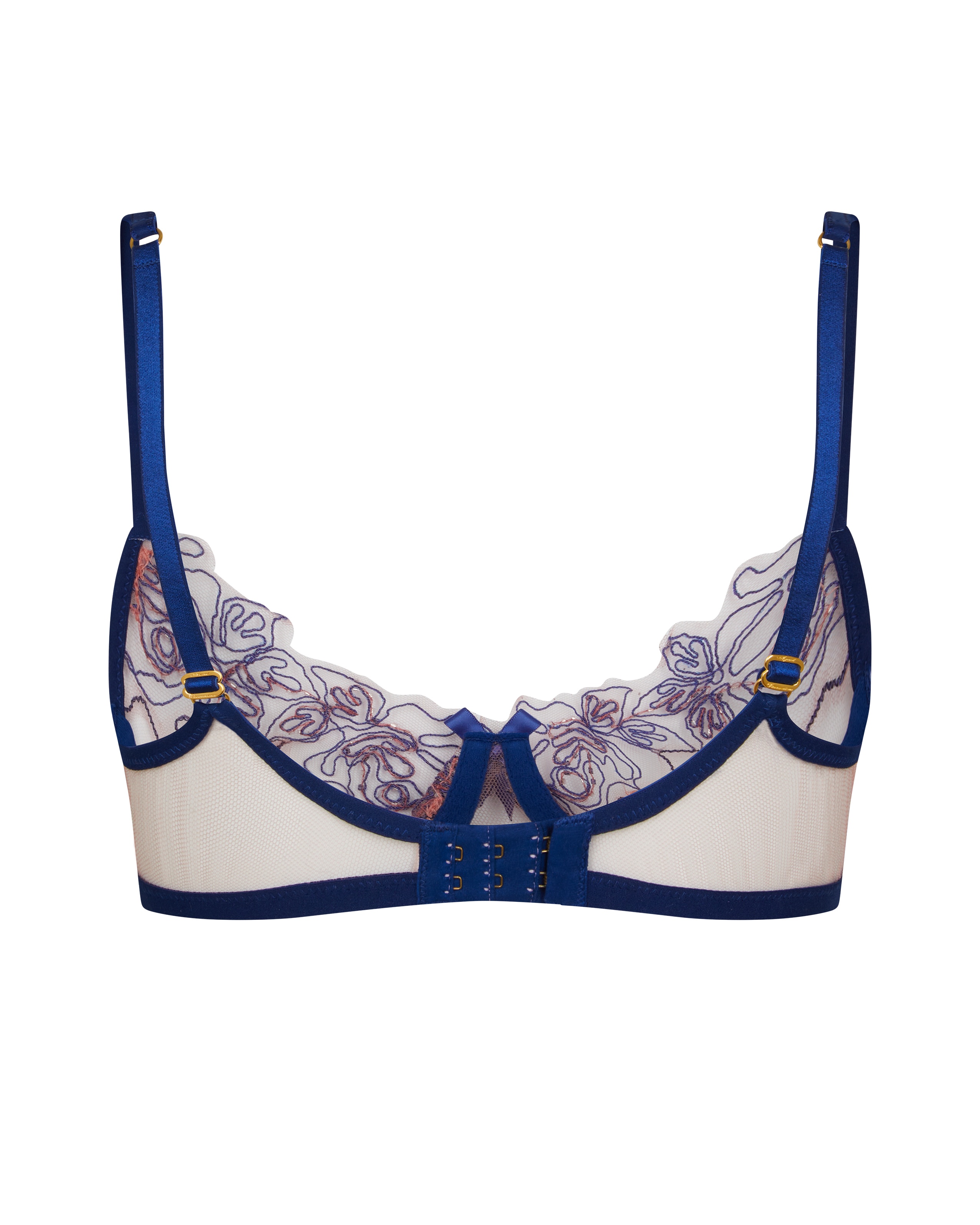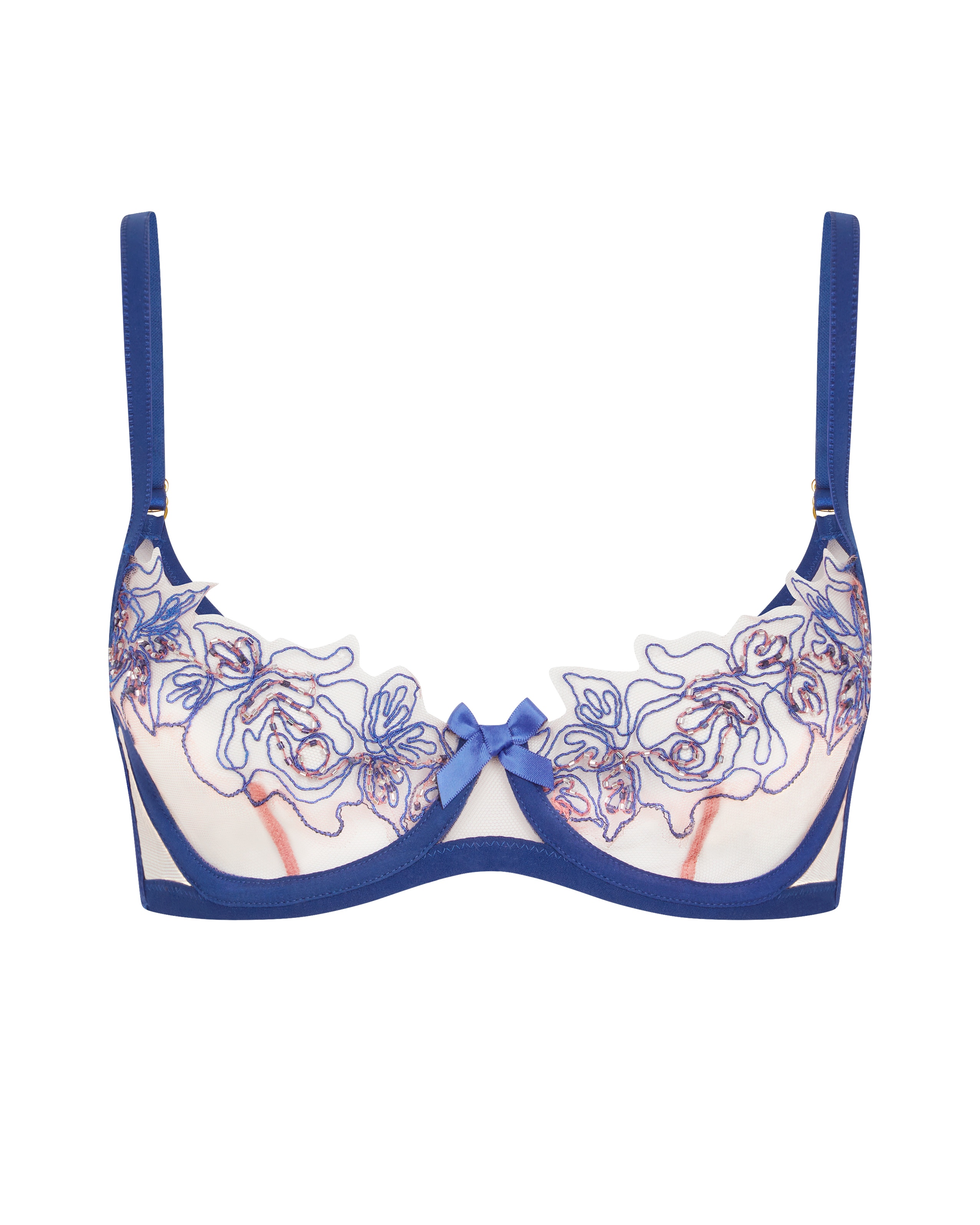 Бюстгальтер Lindie сине-розового цвета с чашками половинного покрытия и глубоким вырезом. Классическая форма с косточками и вытачками, основа из тонкого итальянского тюля. Ручная цветочная вышивка эксклюзивным бисером банджо. Дополните образ комплектом Lindie для пленительного эффекта.