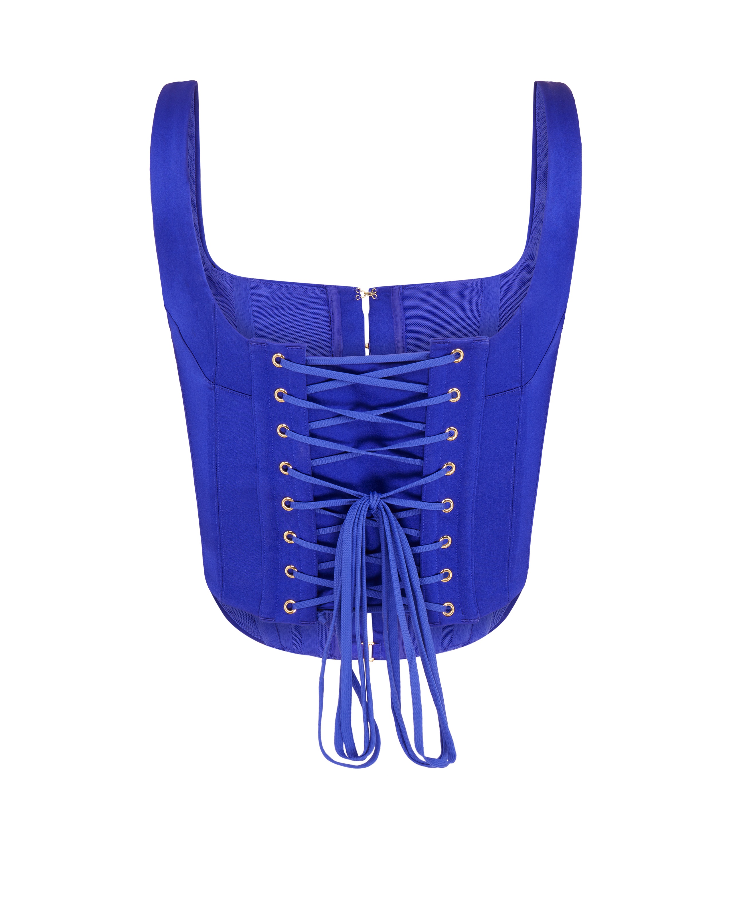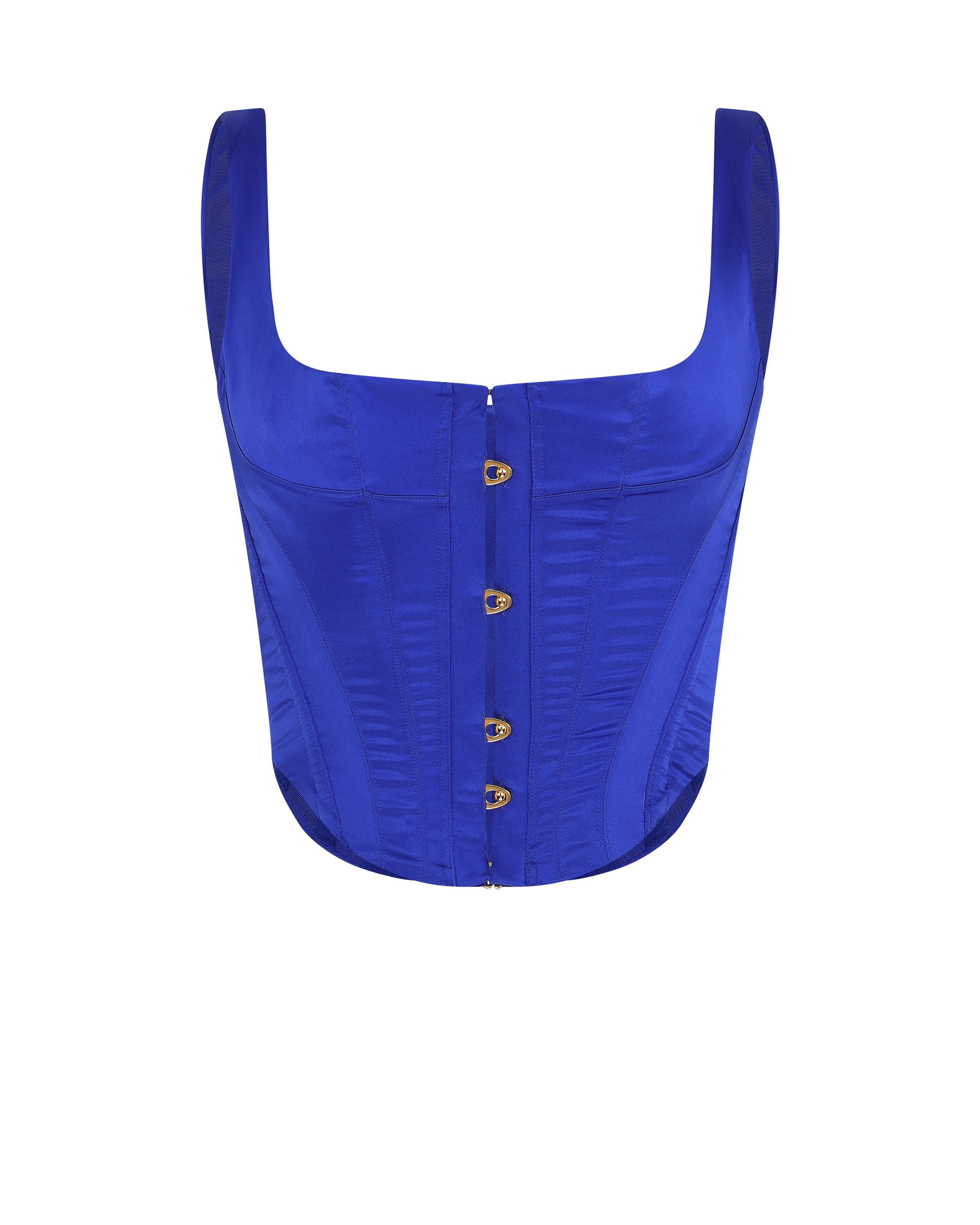 Синий корсет Zena выполнен из роскошного шёлкового атласа. Модель с косточками и вставками идеально подчёркивает фигуру, а застёжка-буск спереди и шнуровка на спине добавляют классический акцент.