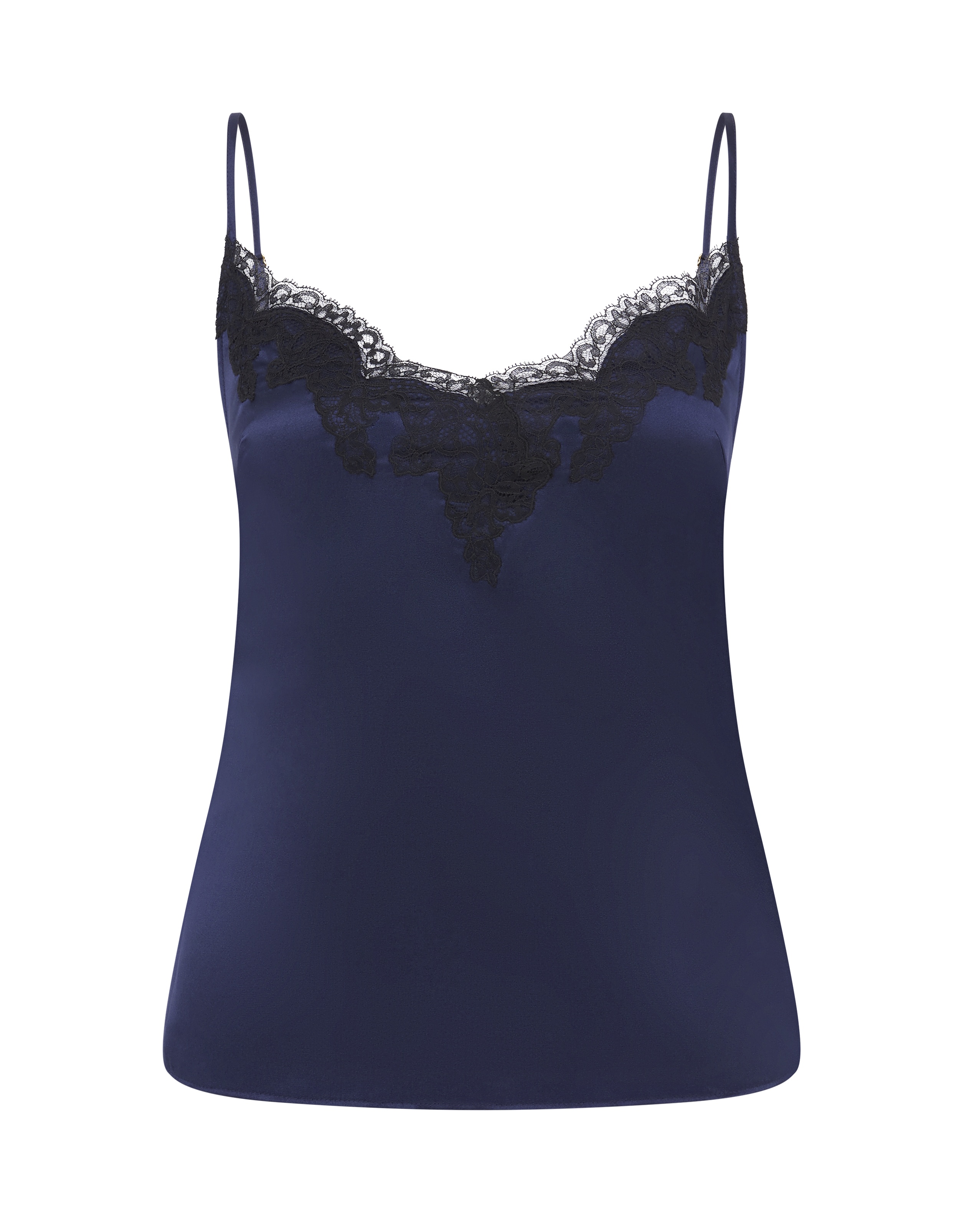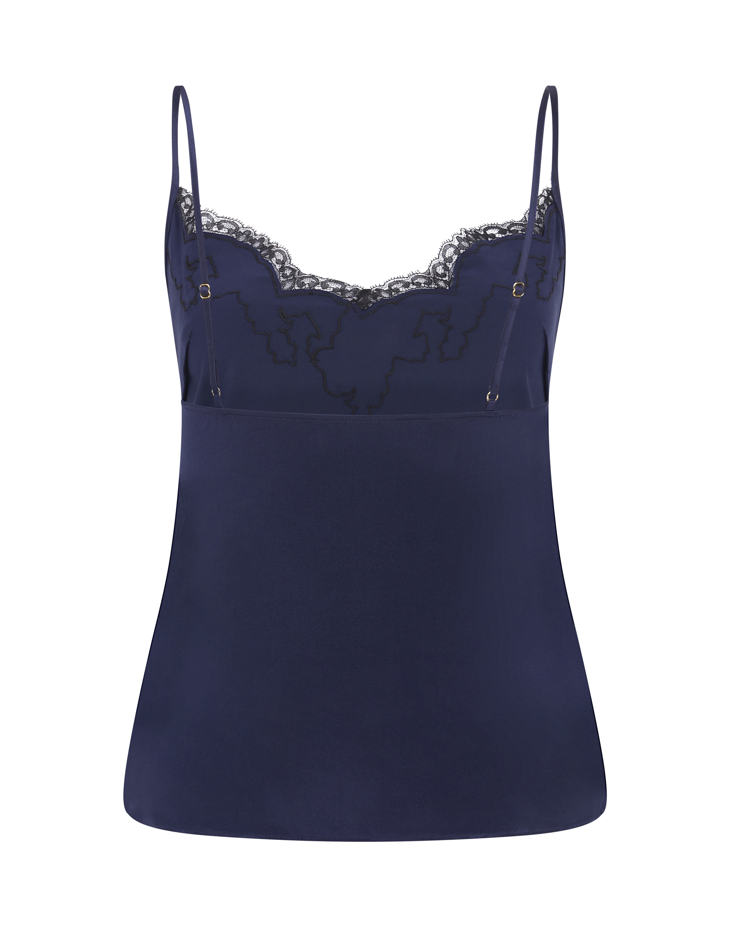 Топ Amelea из эластичного шелка в темно-синем оттенке украшен ажурной кружевной отделкой. Легкие бретели регулируются для идеальной посадки.
