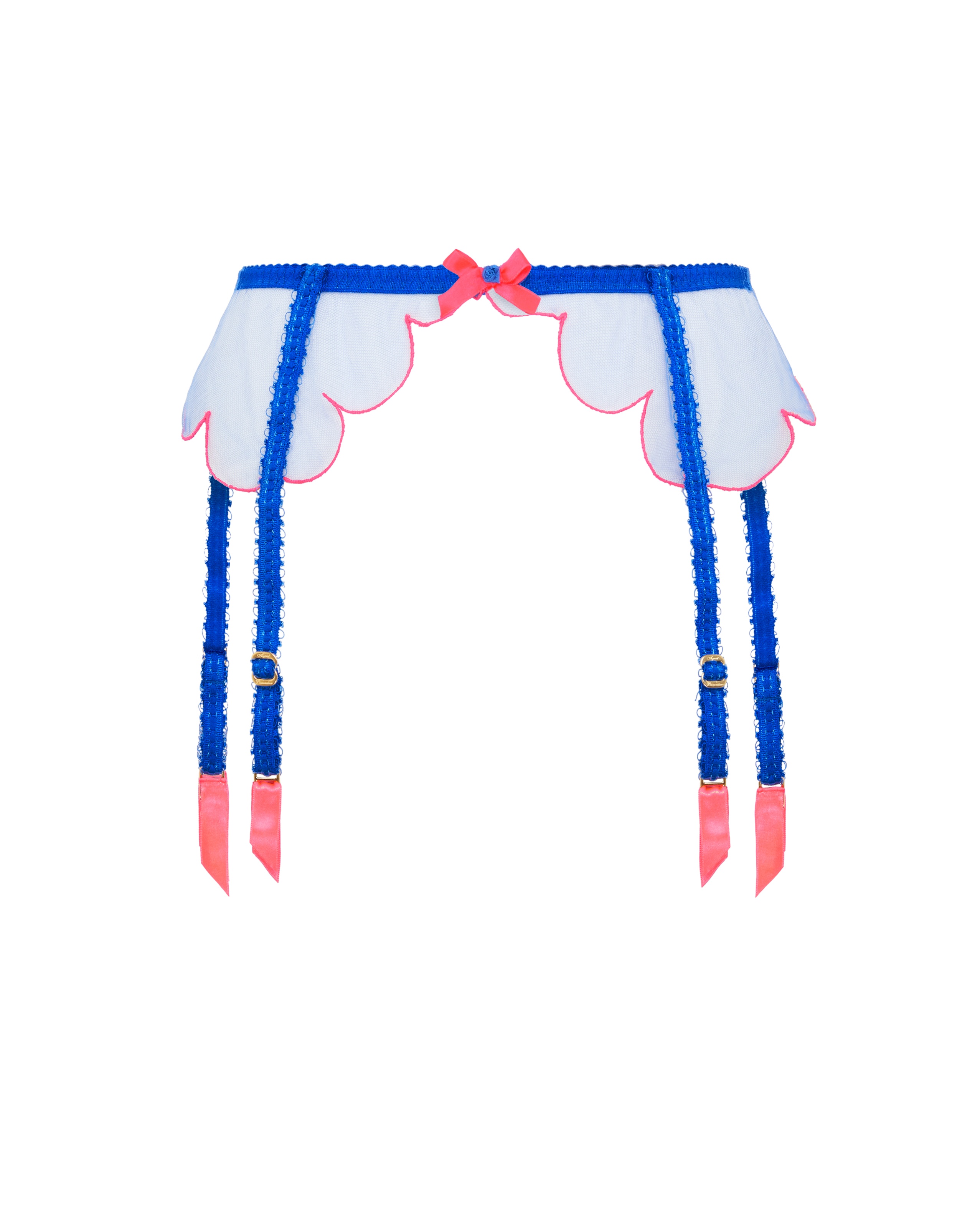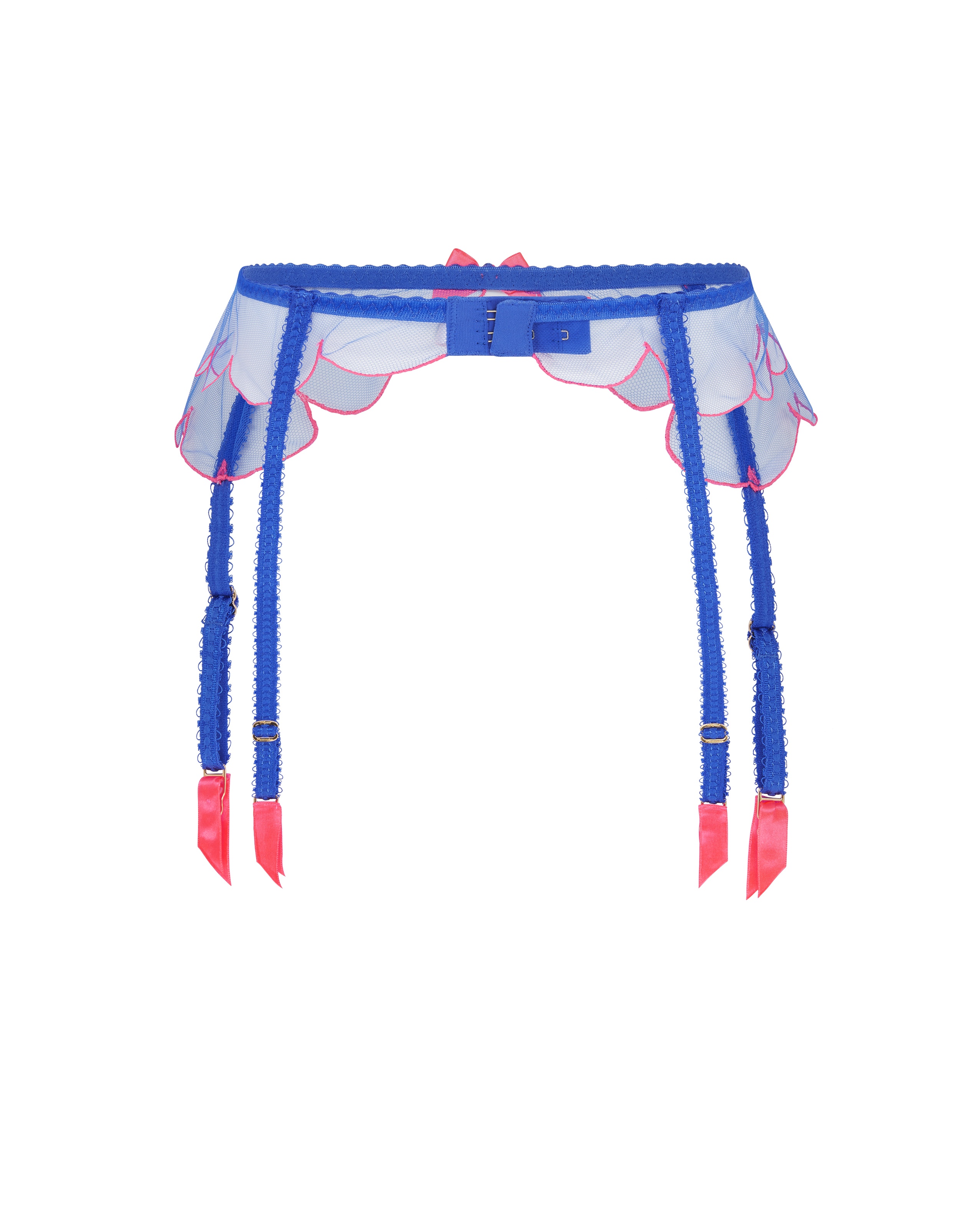 Синий пояс для чулок Lorna с прозрачной основой из тюля и регулируемыми атласными ремешками. Застежки и фурнитура покрыты настоящим золотом. Пояс застегивается на спине с помощью регулируемых крючков и петель, а края украшены неоново-розовой швейцарской вышивкой и атласным бантом с миниатюрной розочкой в центре. Носите с остальными изделиями из коллекции Lorna для создания яркого образа.