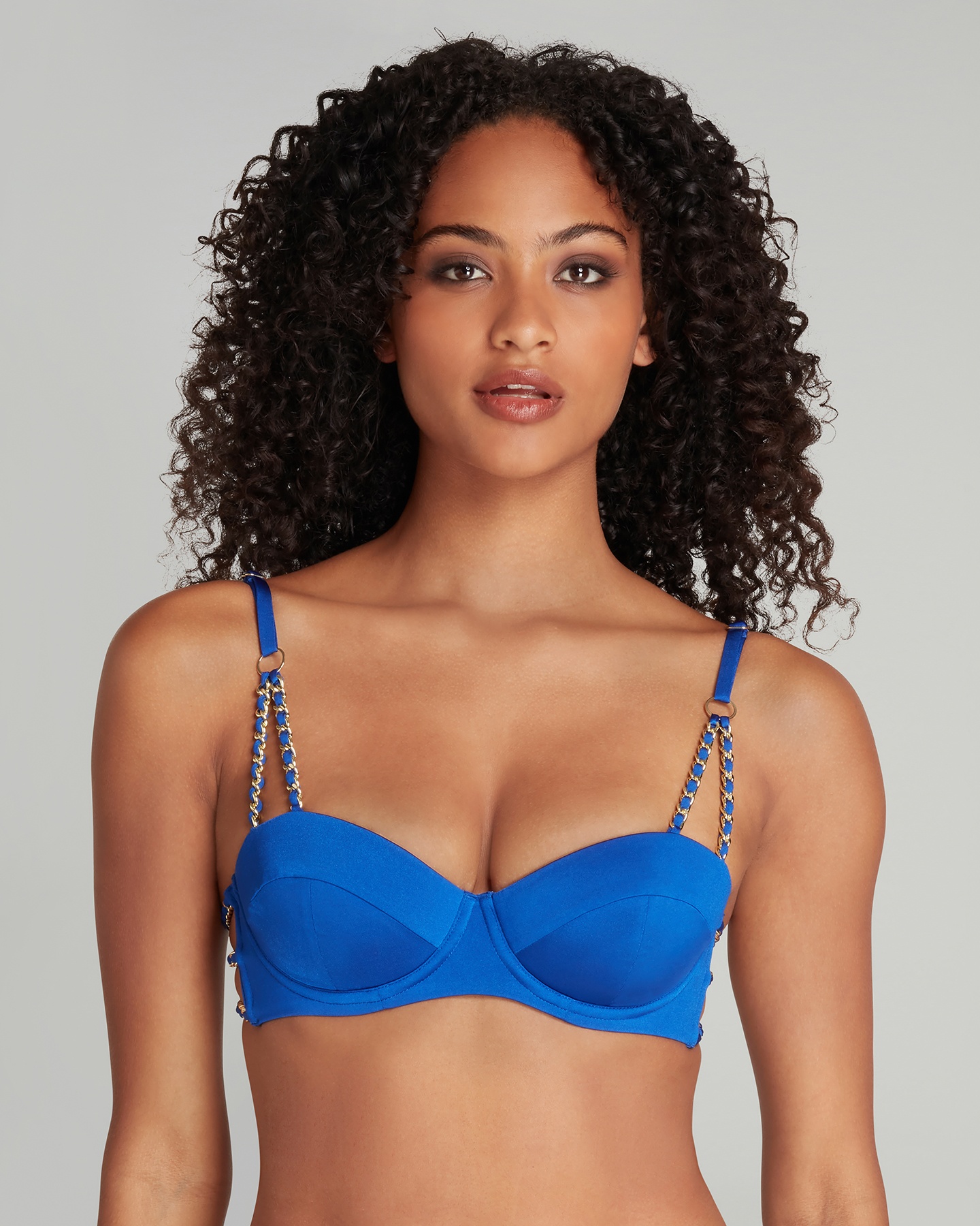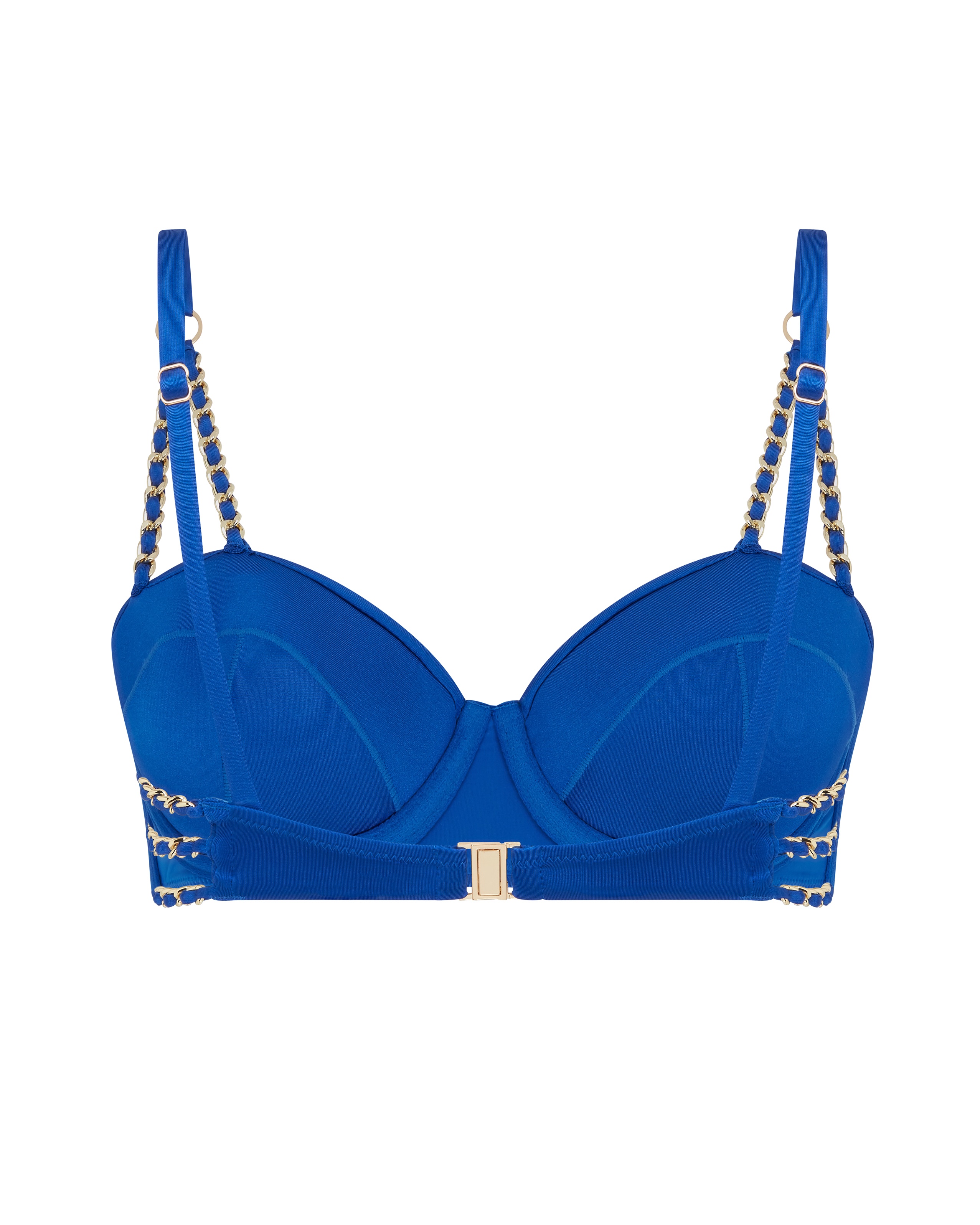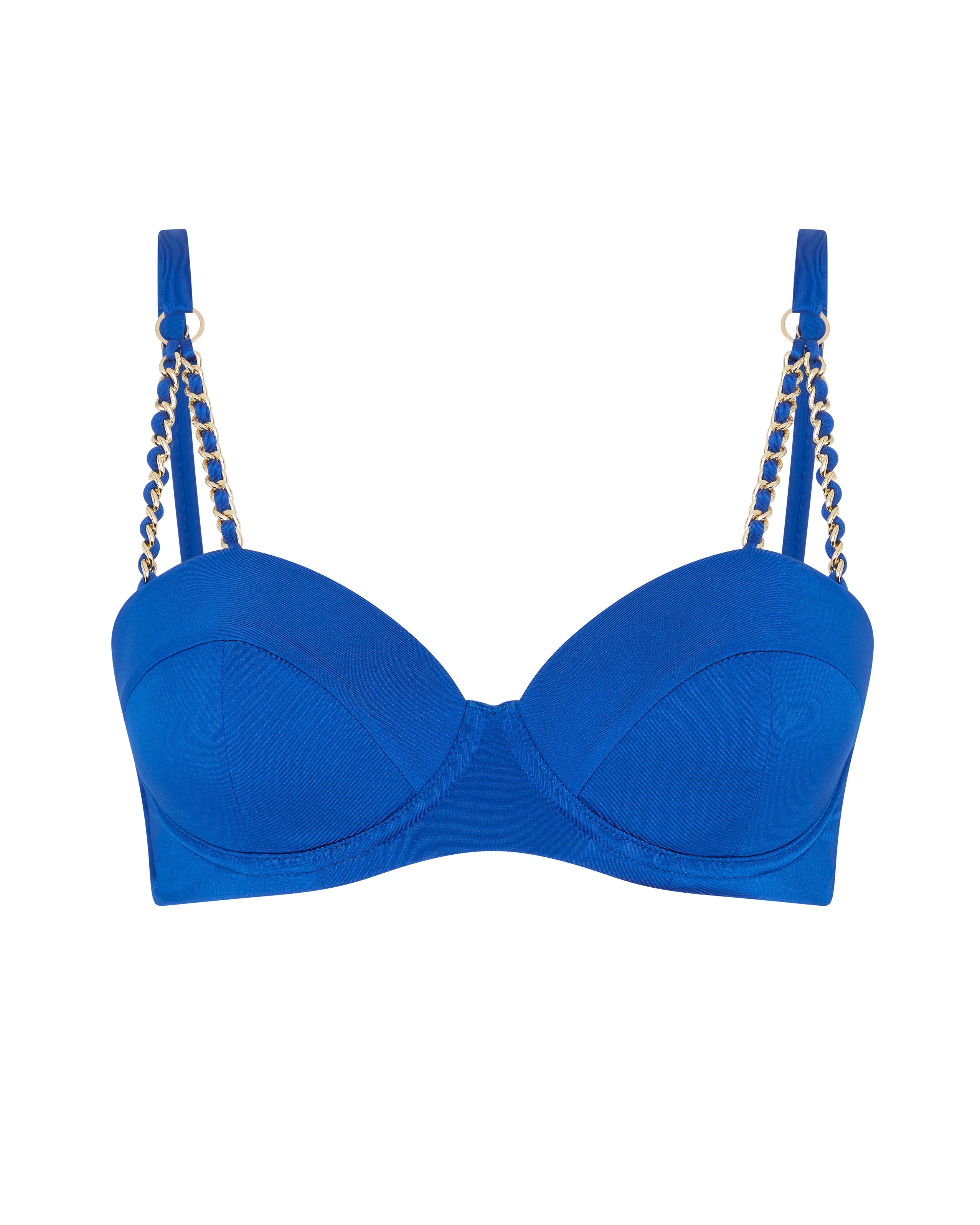 Топ купальника Montie синего цвета в стиле балконет: чашки с косточками и мягкой вкладкой для поддержки и приподнимающего эффекта. Выполнен из роскошной итальянской купальной ткани. Регулируемые бретели и застежка с покрытием из настоящего золота. Соберите идеальный пляжный комплект с плавками Montie.